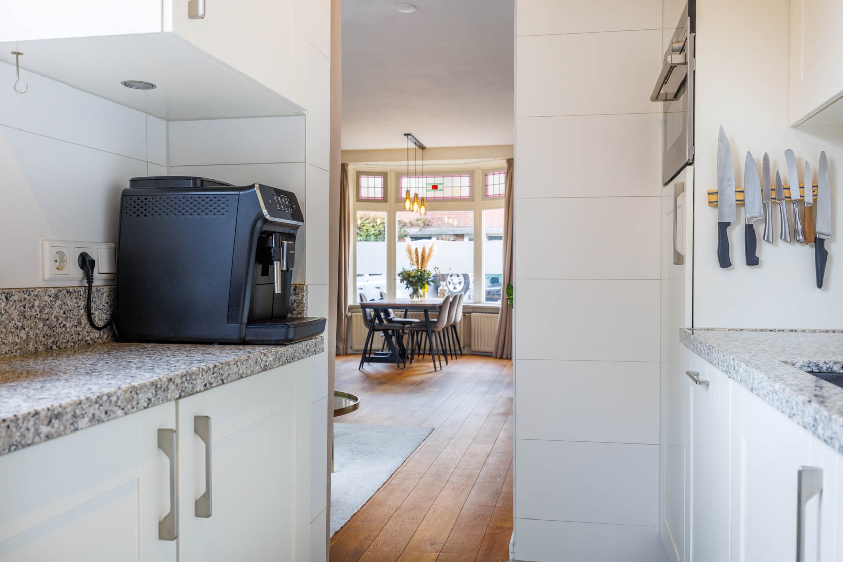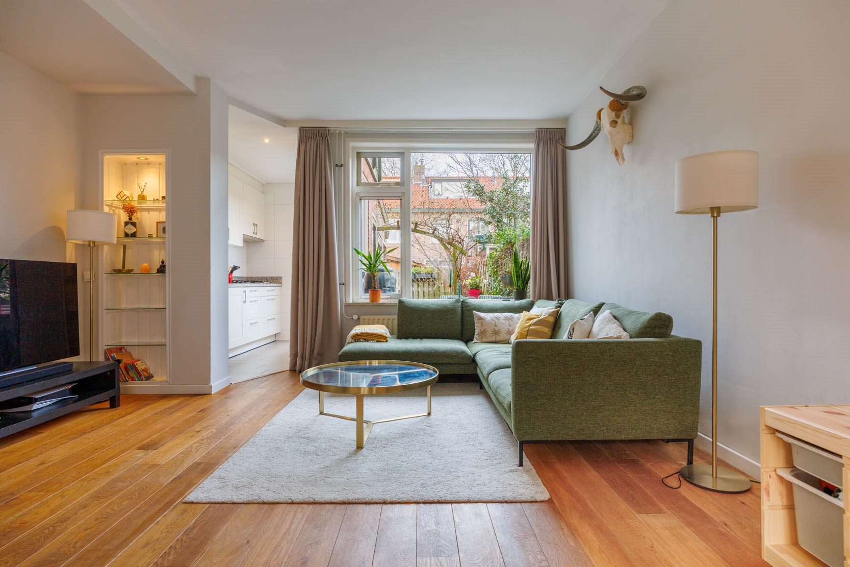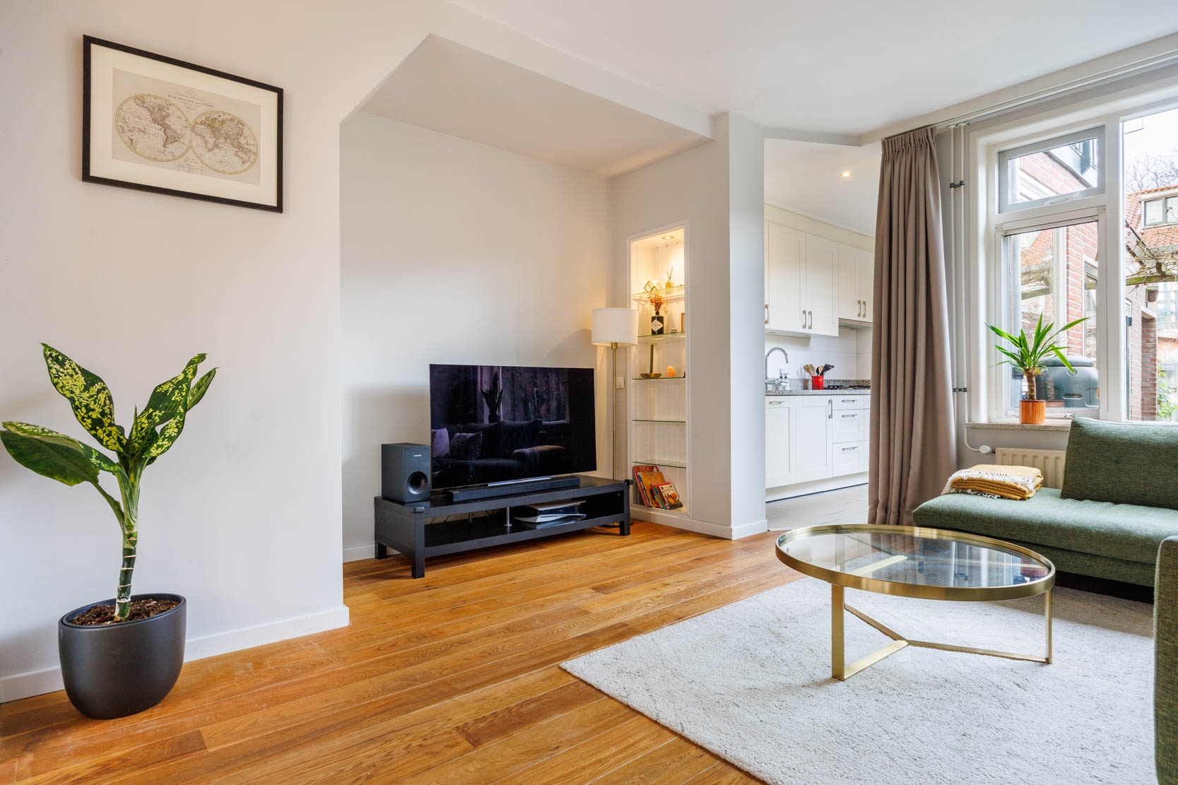 Entrance hall, spacious and bright living room with stained-glass windows at the front and a cosy alcove beneath the staircase featuring two built-in cupboards. Through a passage you reach the well-appointed kitchen, equipped with various built-in appliances including a combination microwave oven, dishwasher, large refrigerator, gas hob with extractor hood and a Quooker (instant boiling water tap). The kitchen has underfloor heating with kickspace plinth heating. Located behind the kitchen is a modern wall-hung toilet.