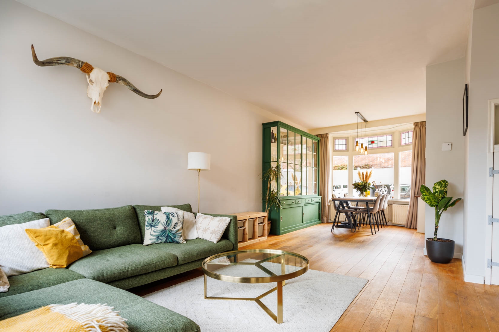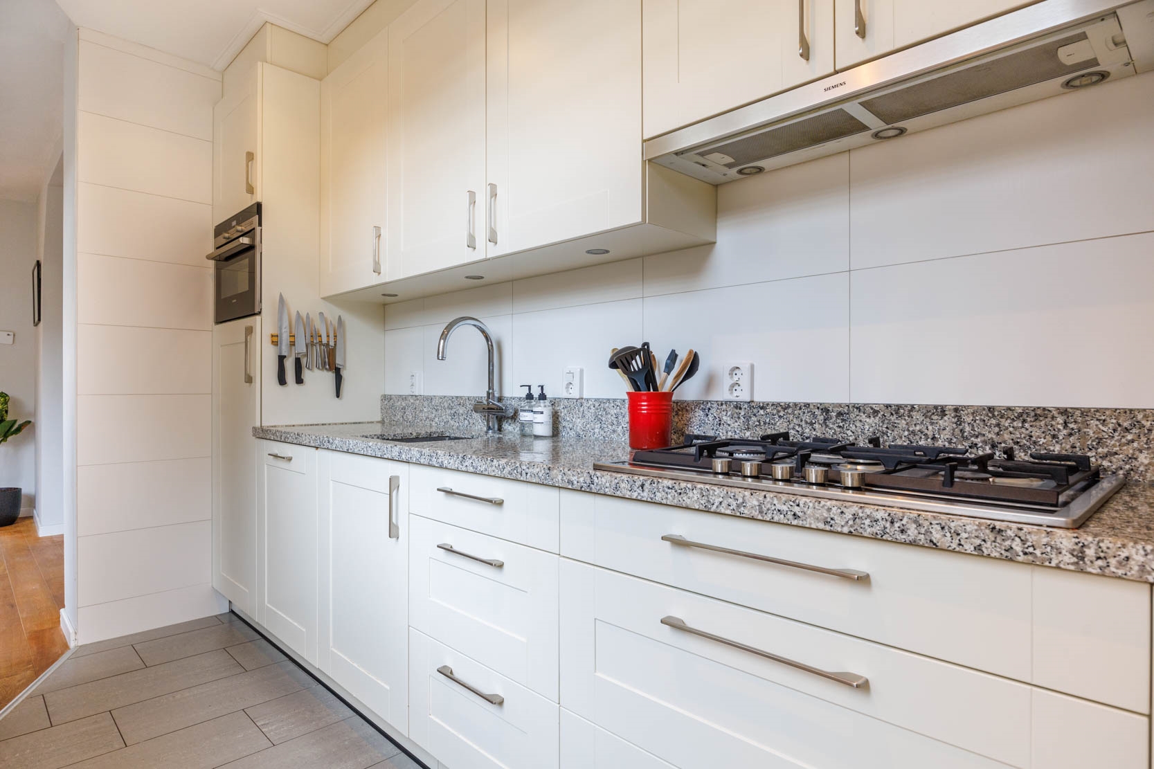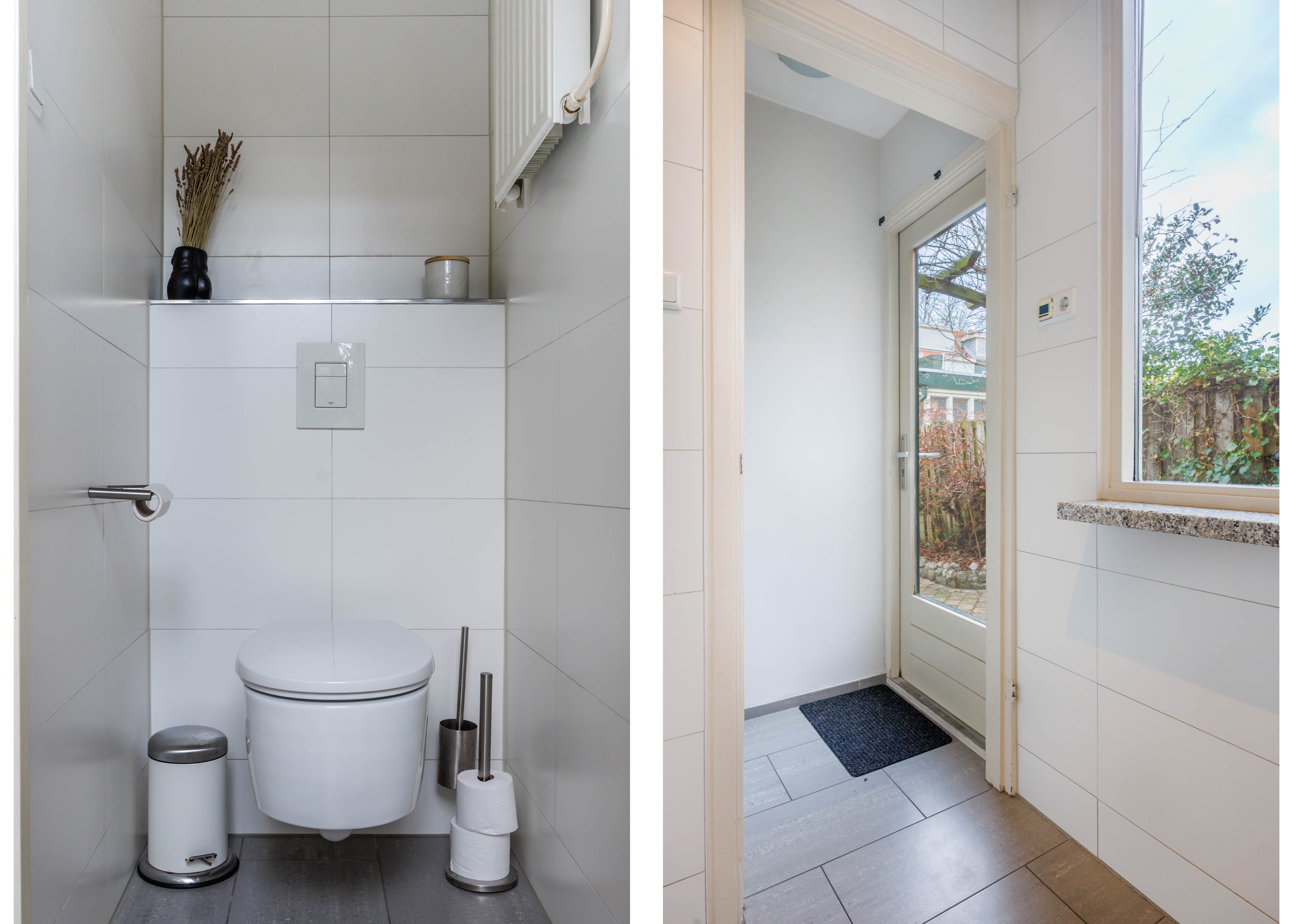 Entrance hall, spacious and bright living room with stained-glass windows at the front and a cosy alcove beneath the staircase featuring two built-in cupboards. Through a passage you reach the well-appointed kitchen, equipped with various built-in appliances including a combination microwave oven, dishwasher, large refrigerator, gas hob with extractor hood and a Quooker (instant boiling water tap). The kitchen has underfloor heating with kickspace plinth heating. Located behind the kitchen is a modern wall-hung toilet.