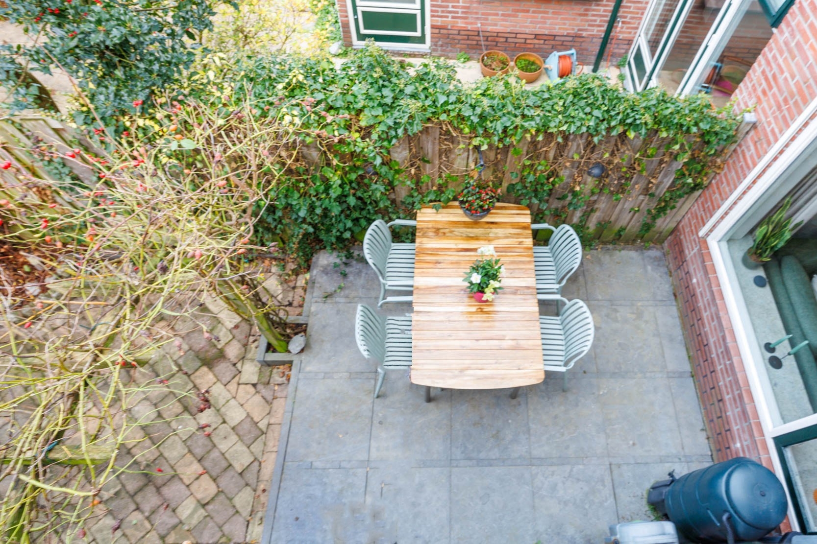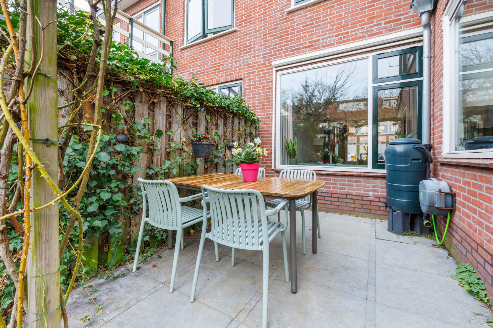 From the kitchen you access the pleasant backyard, which includes a lockable storage shed and a covered (brick-built) bicycle storage area. The garden offers several seating areas where you can enjoy the sun, as well as attractive planting such as an apple tree.