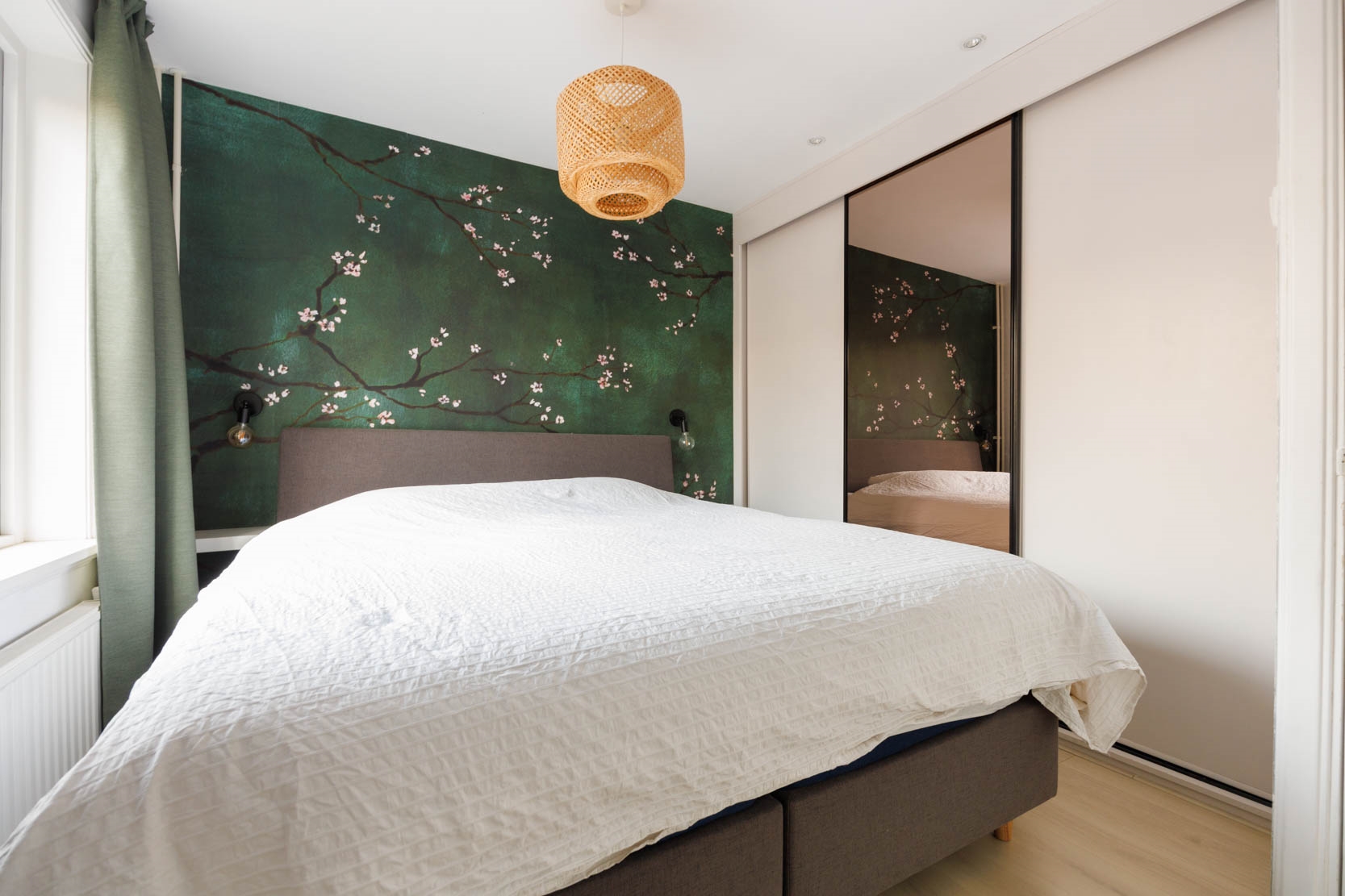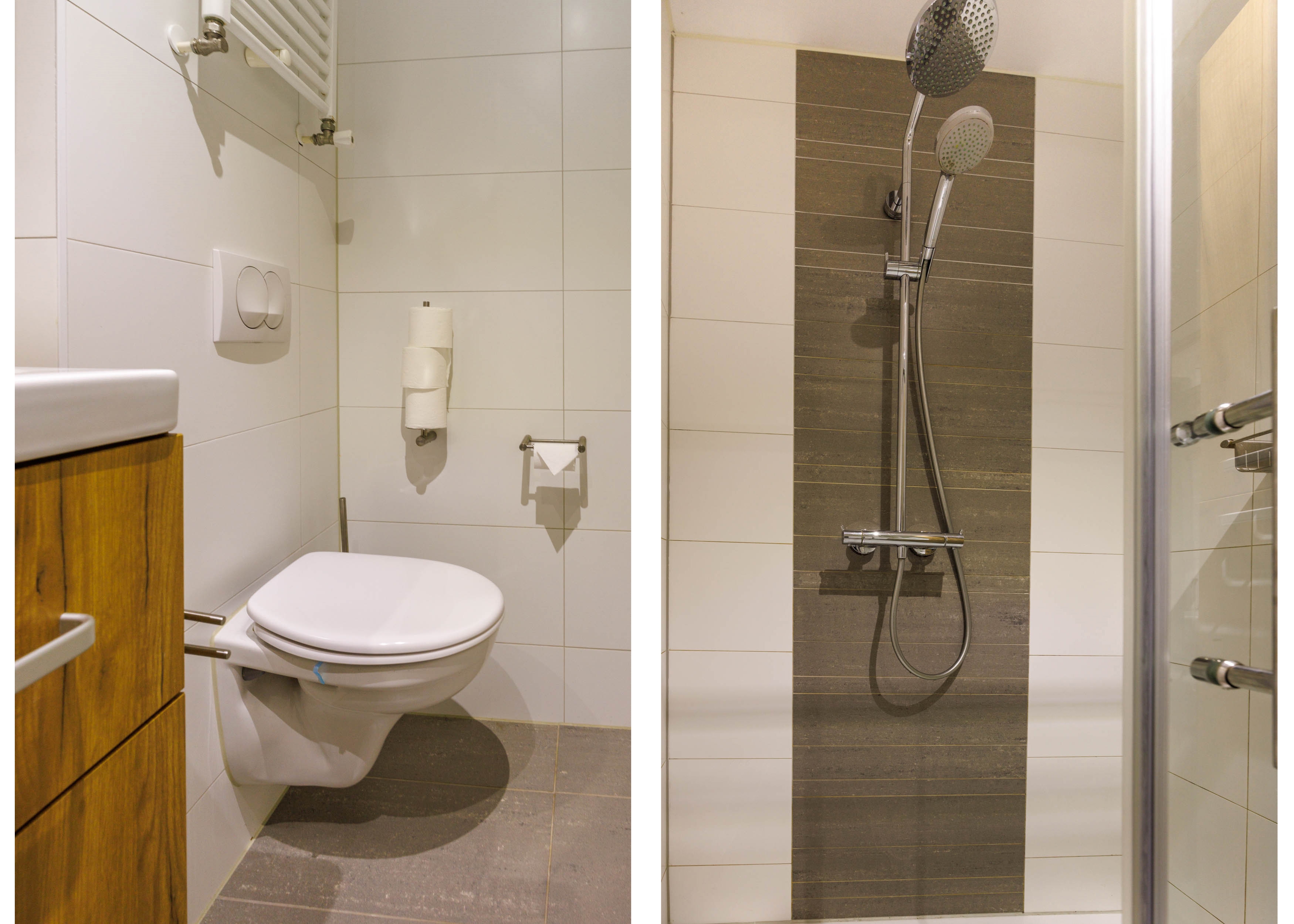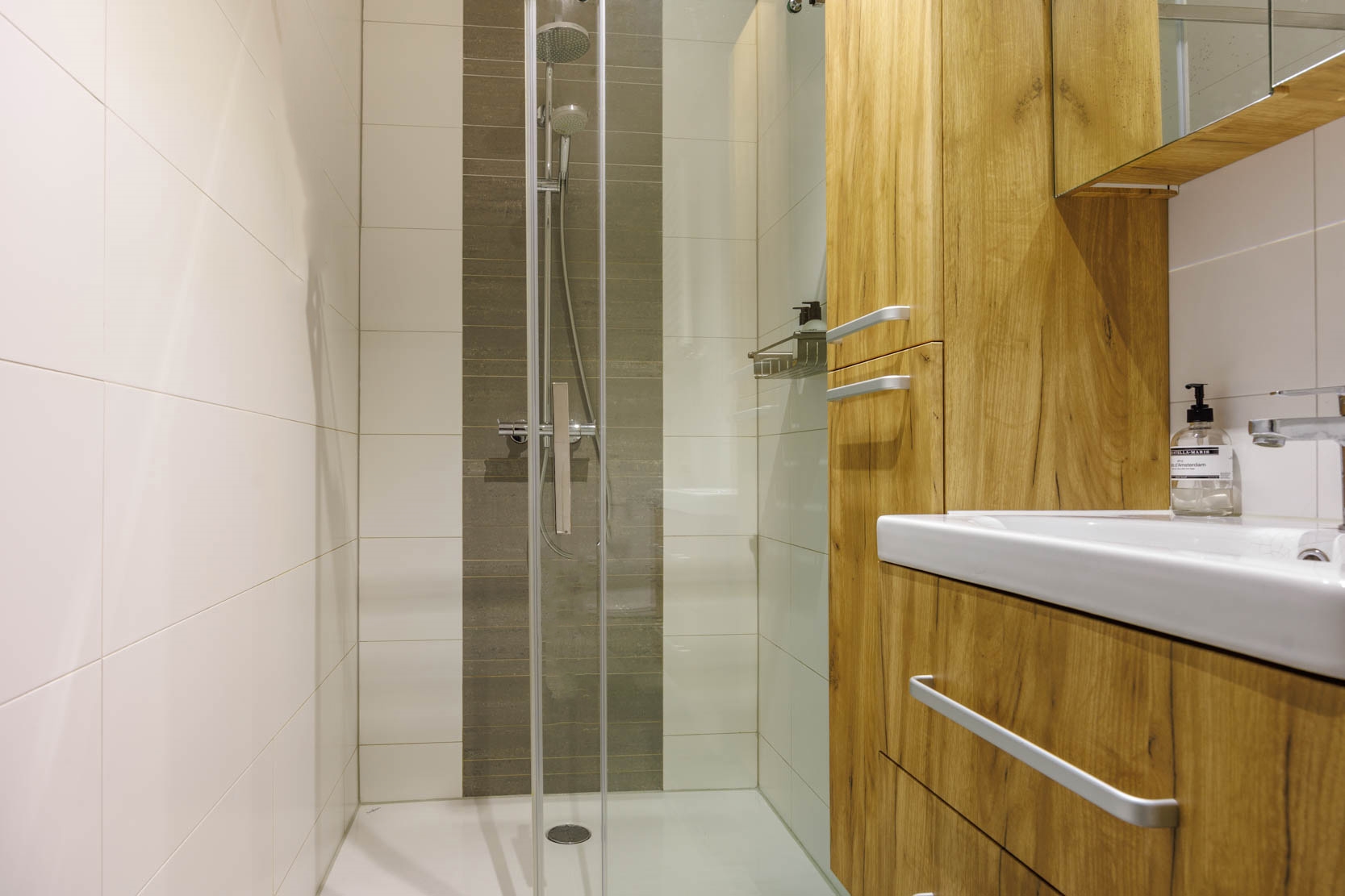 De moderne badkamer heeft een inloopdouche/regendouche, wastafelmeubel met lange kast en spiegelkast, een tweede toilet, designradiator, mechanische ventilatie en vloerverwarming. De slaapkamer aan de achterzijde heeft een airco en een ingebouwde kledingkast.