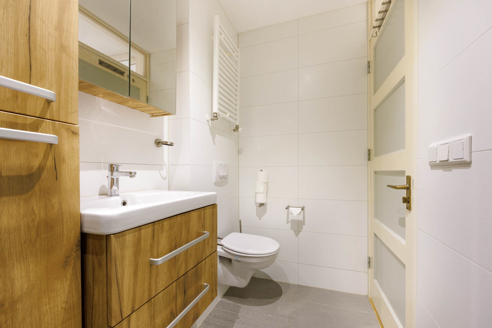 The modern bathroom features a walk-in rain shower, washbasin unit with tall cabinet and mirrored cabinet, a second toilet, design radiator, mechanical ventilation and underfloor heating. The rear bedroom is equipped with air conditioning and a built-in wardrobe. At the front there are two additional spacious bedrooms, one of which has a large under-stairs cupboard.