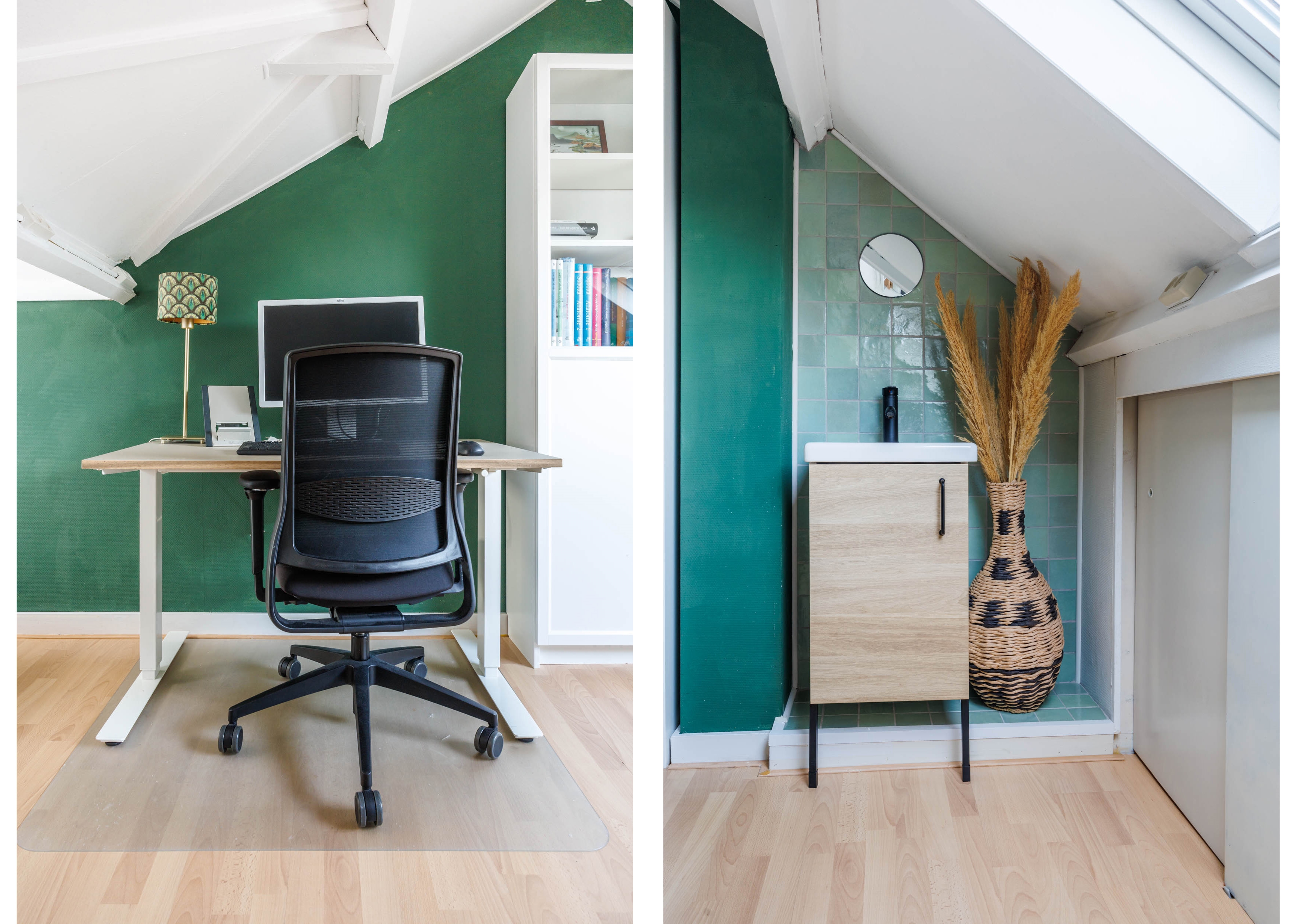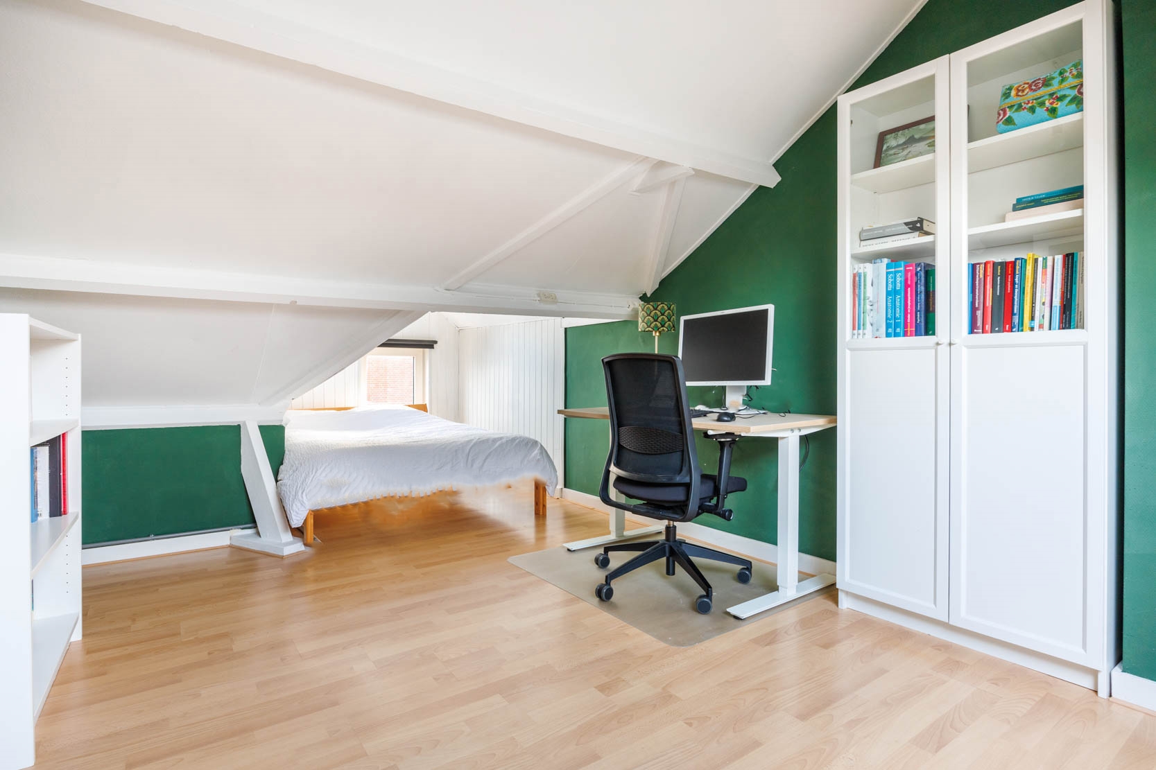 Spacious landing with a Velux roof window, central heating system, inverter for the solar panels, and ample additional storage space behind the knee walls and in a cupboard behind two sliding doors. Access to a spacious bedroom/study with a dormer window at the front, a washbasin, and additional storage behind the knee walls.