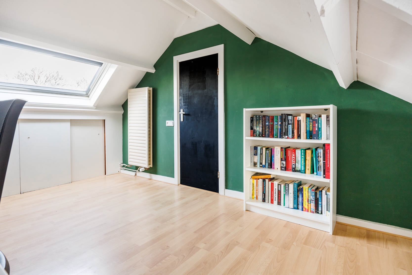 Ruime voorzolder met Velux-raam, CV-opstelling, de omvormer voor de zonnepanelen en veel extra bergruimte achter de knieschotten en een kast achter de twee schuifdeuren. Toegang tot een ruime slaap/studeerkamer met een dakkapel aan de voorzijde, een wastafel en ook hier extra bergruimte achter de knieschotten.