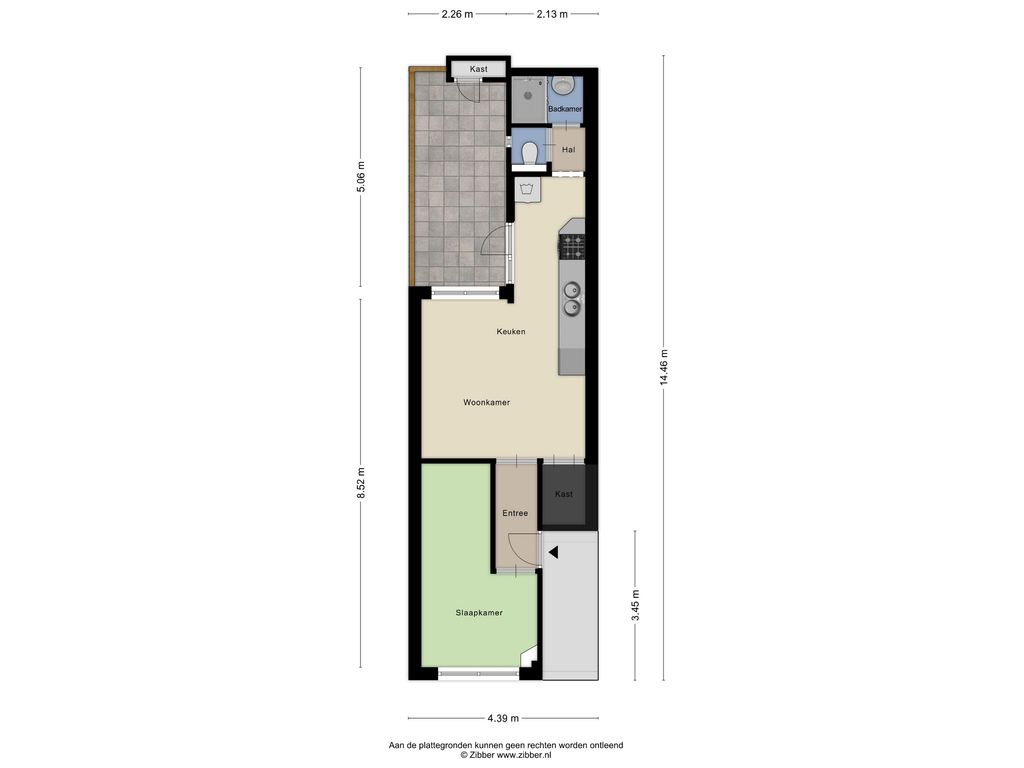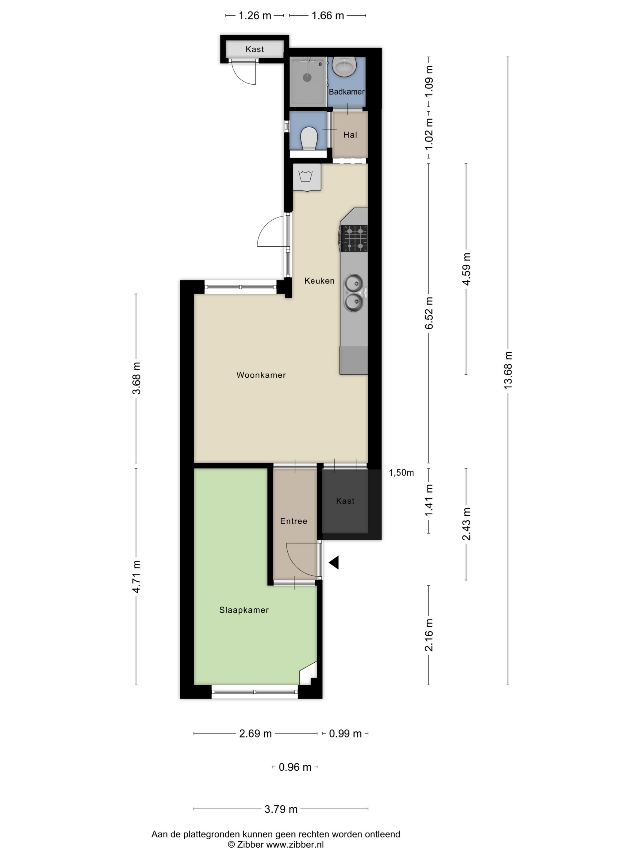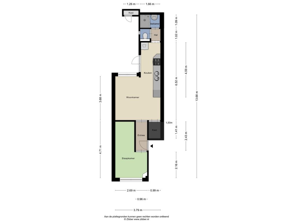Via de entree aan de voorzijde wordt de centrale hal bereikt, met toegang tot de verschillende vertrekken. Aan de straatzijde ligt de ruime slaapkamer, die dankzij de brede raampartij prettig licht is. Deze ruimte is bereikbaar via een eigen hal en afsluitbaar. Deze ruimte biedt voldoende mogelijkheid voor plaatsen van bureau. Eventueel kan ervoor worden gekozen om de eigen hal bij de slaap- werkruimte te betrekken.