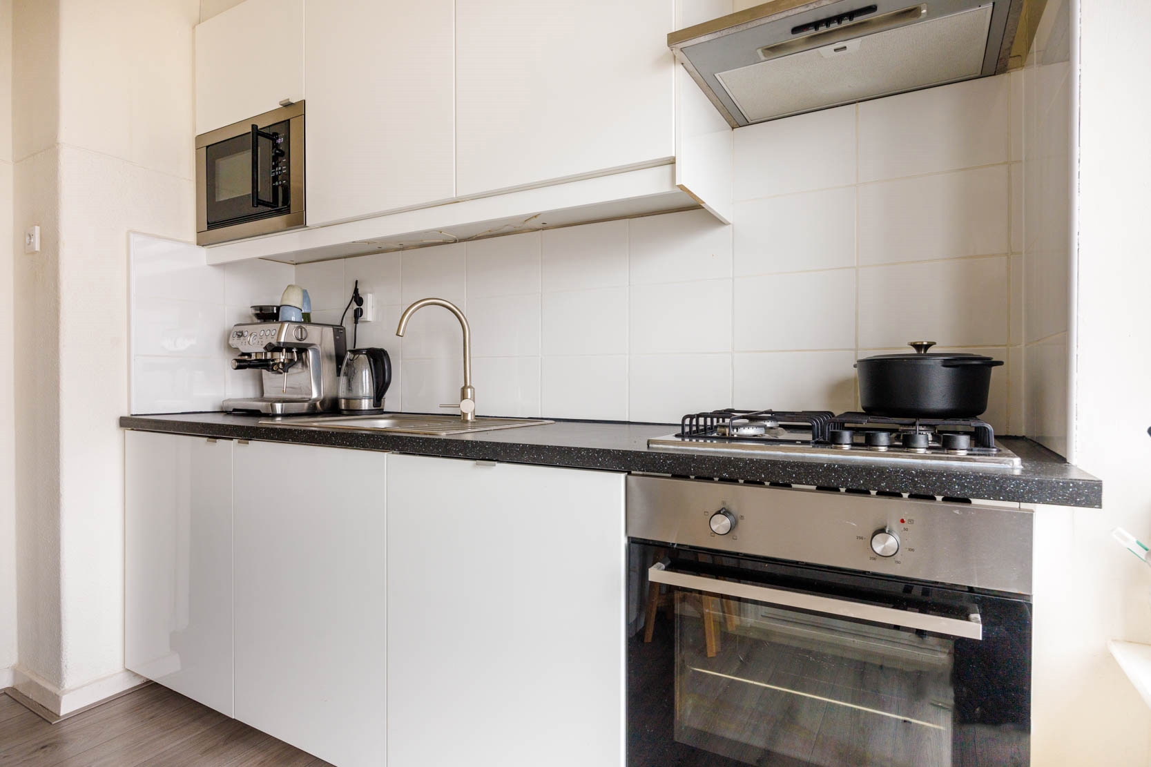 De moderne keuken ligt aan de voorzijde en is voorzien van diverse (inbouw)apparatuur, waaronder een oven, magnetron, 4-pits gascomfort, afzuigkap en koelkast (met vriesvak). Aan de andere zijde bevindt zich een mooie kastenwand, waarachter zich tevens de wasmachine bevindt (in een inbouwkast). Vanuit de keuken is het balkon aan de voorzijde (O) te bereiken.