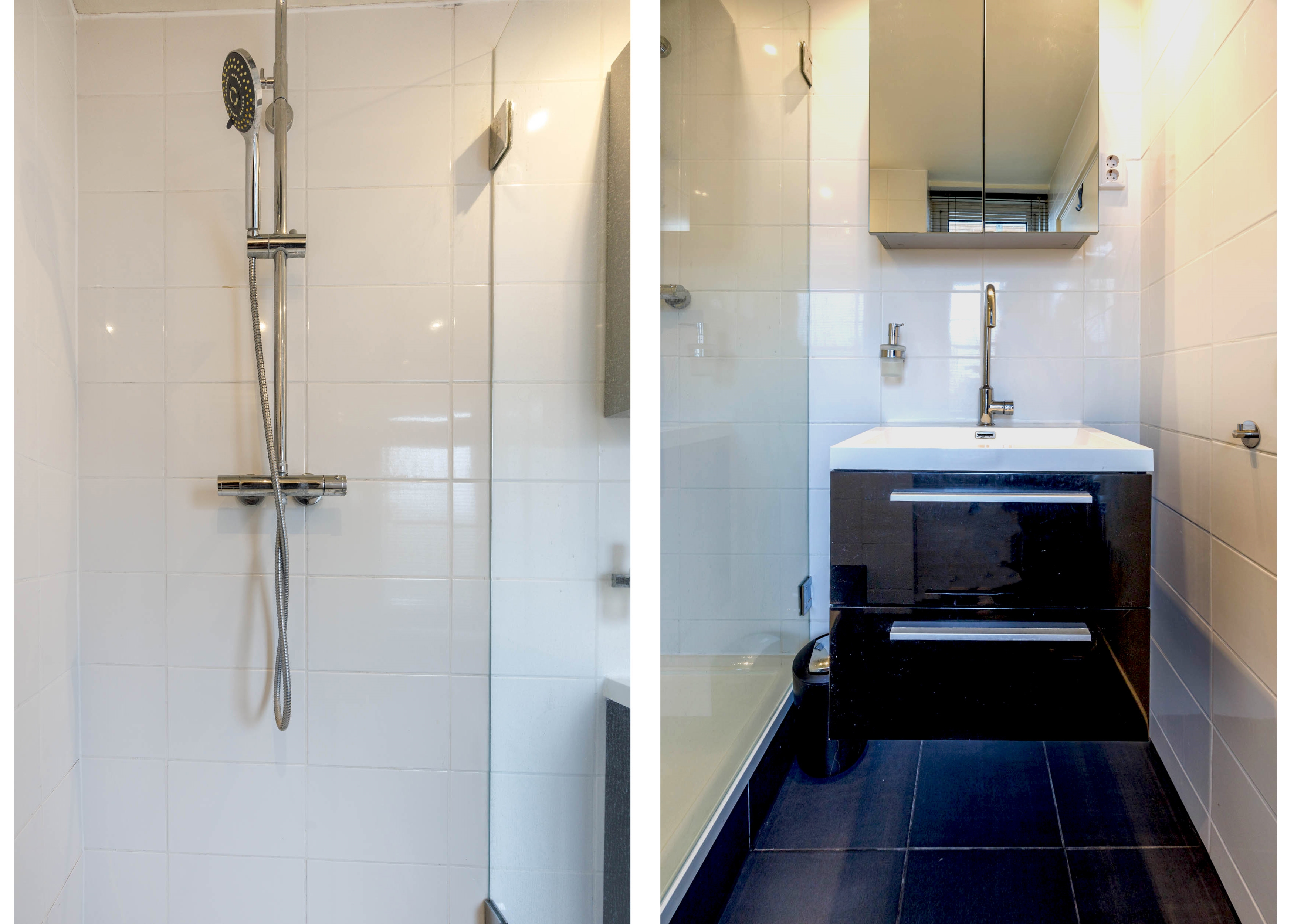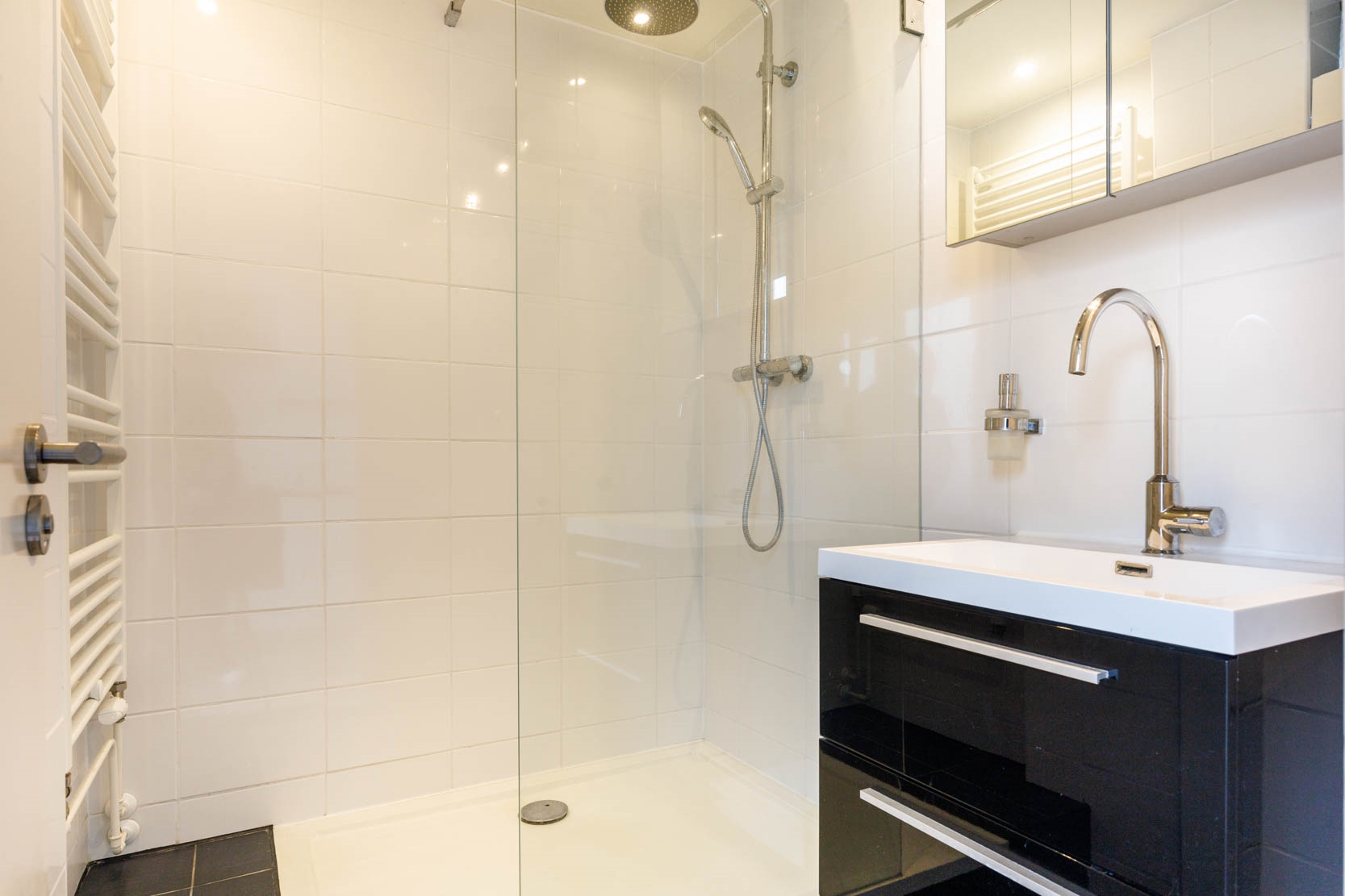 Aansluitend een moderne badkamer, via de keuken te bereiken, voorzien van een inloopdouche met glazen wand, een wastafelmeubel met spiegelkast en een designradiator.