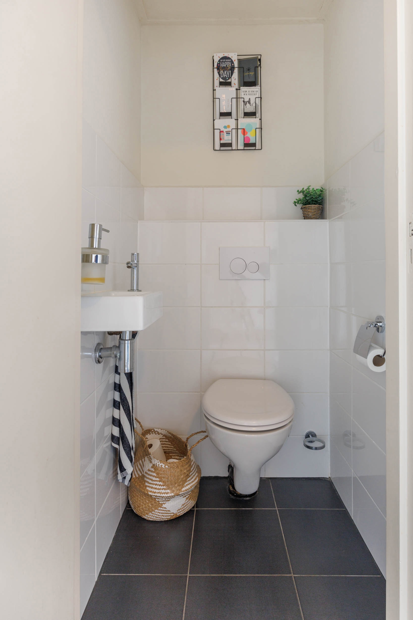 Entree appartement. Ruime hal met meterkast, twee inbouwkasten en een modern toilet (met fonteintje).