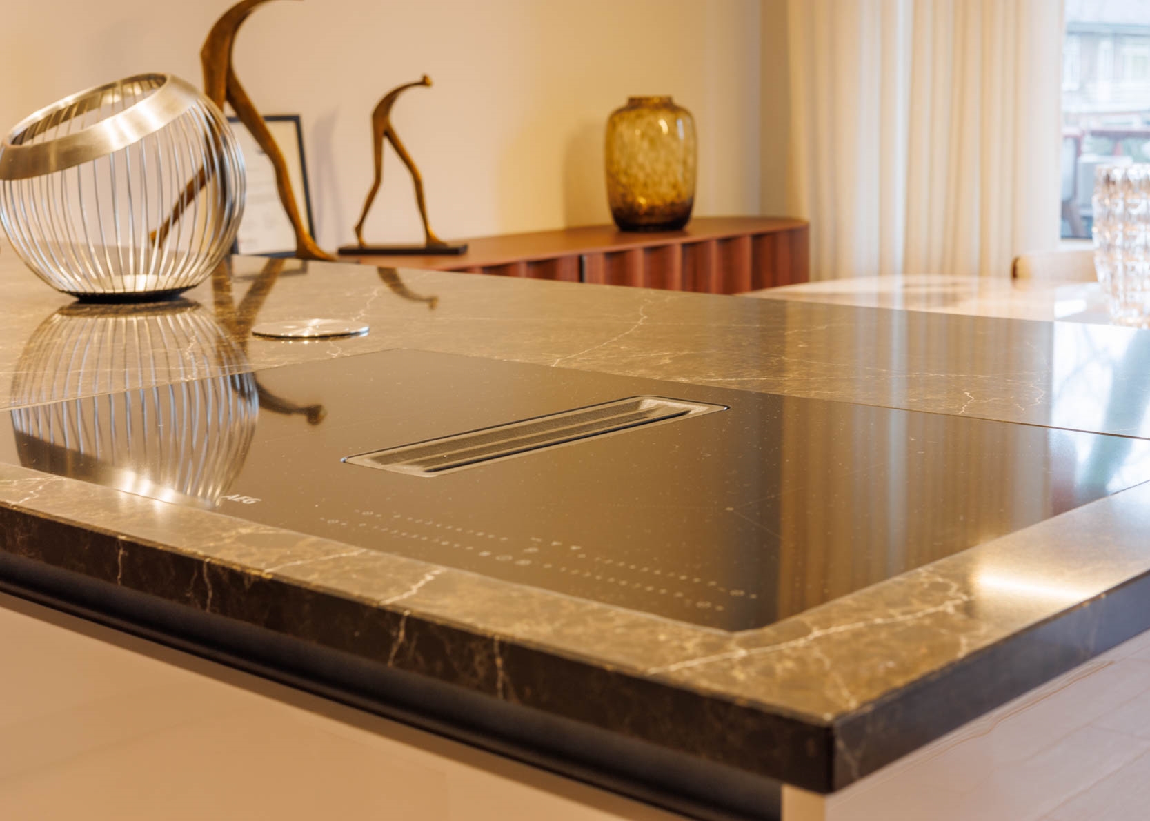 The beautiful Bruynzeel kitchen with cooking island is equipped with high-quality AEG built-in appliances, including an induction cooktop with integrated extraction, Quooker, oven, microwave, dishwasher, fridge/freezer combination, and a natural stone countertop. The stylish tall cabinets provide ample additional storage space.