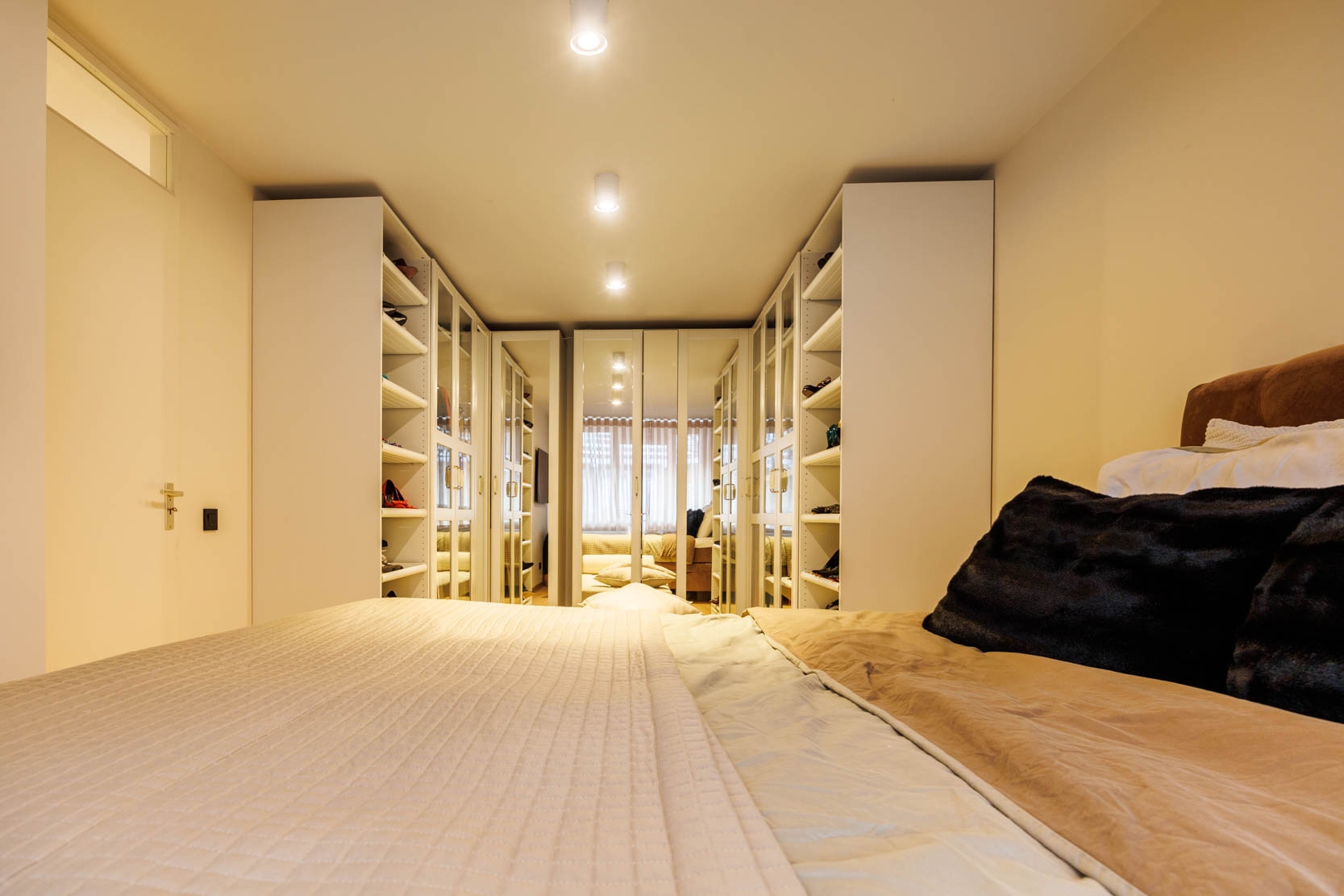 De gehele woonlaag is voorzien van een fraaie laminaatvloer met isolatie en ingebouwde spotverlichting. Vanuit de hal heb je toegang tot de twee aan de achterzijde gelegen slaapkamers, het separate toilet met fonteintje en de badkamer. De ruime hoofdslaapkamer beschikt over een stijlvol open walk-in-closetgedeelte.