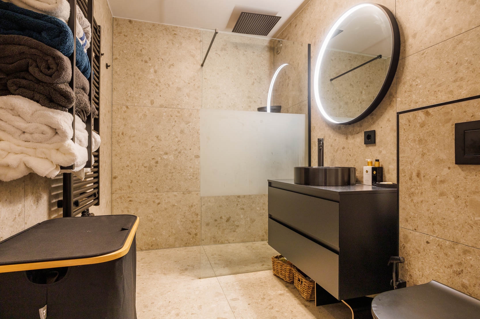 The luxurious bathroom, also renovated in 2023, includes a spacious walk-in shower with rain shower, a modern vanity unit with illuminated and heated round mirror, a second toilet (with bidet function), and a designer radiator. Both the bathroom and the separate toilet are fully tiled in beautiful natural stone, enhancing the high-end and luxurious appearance.