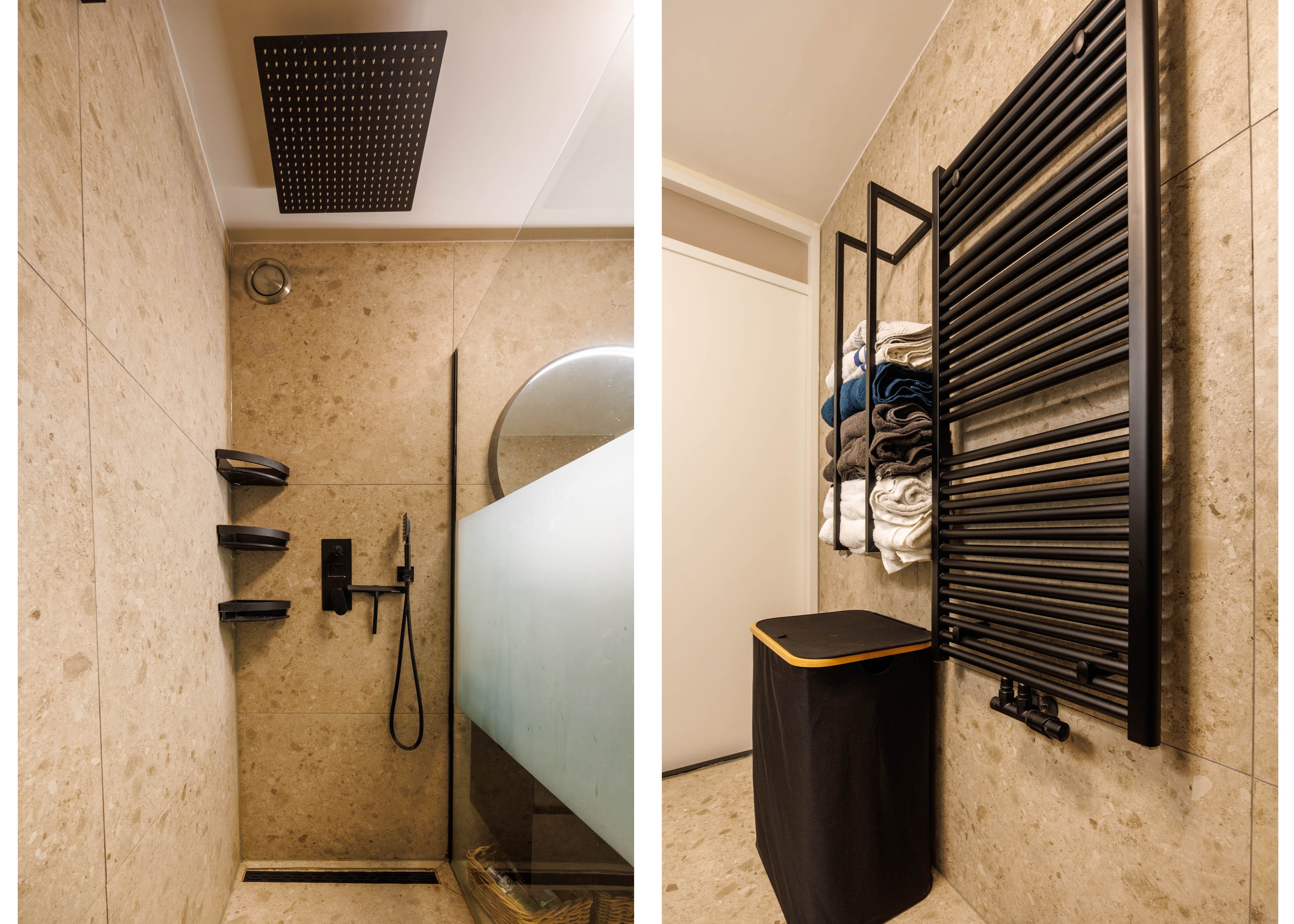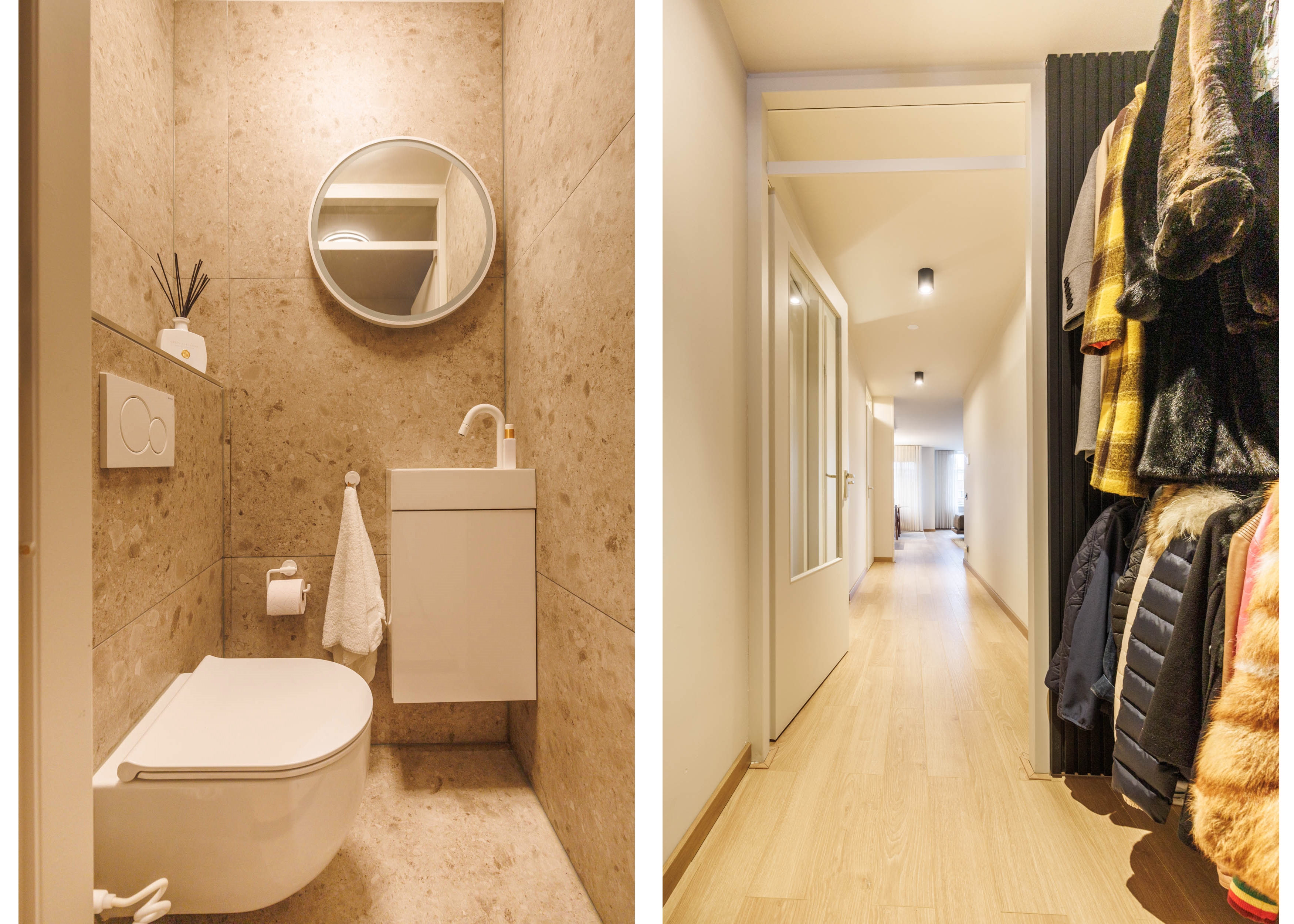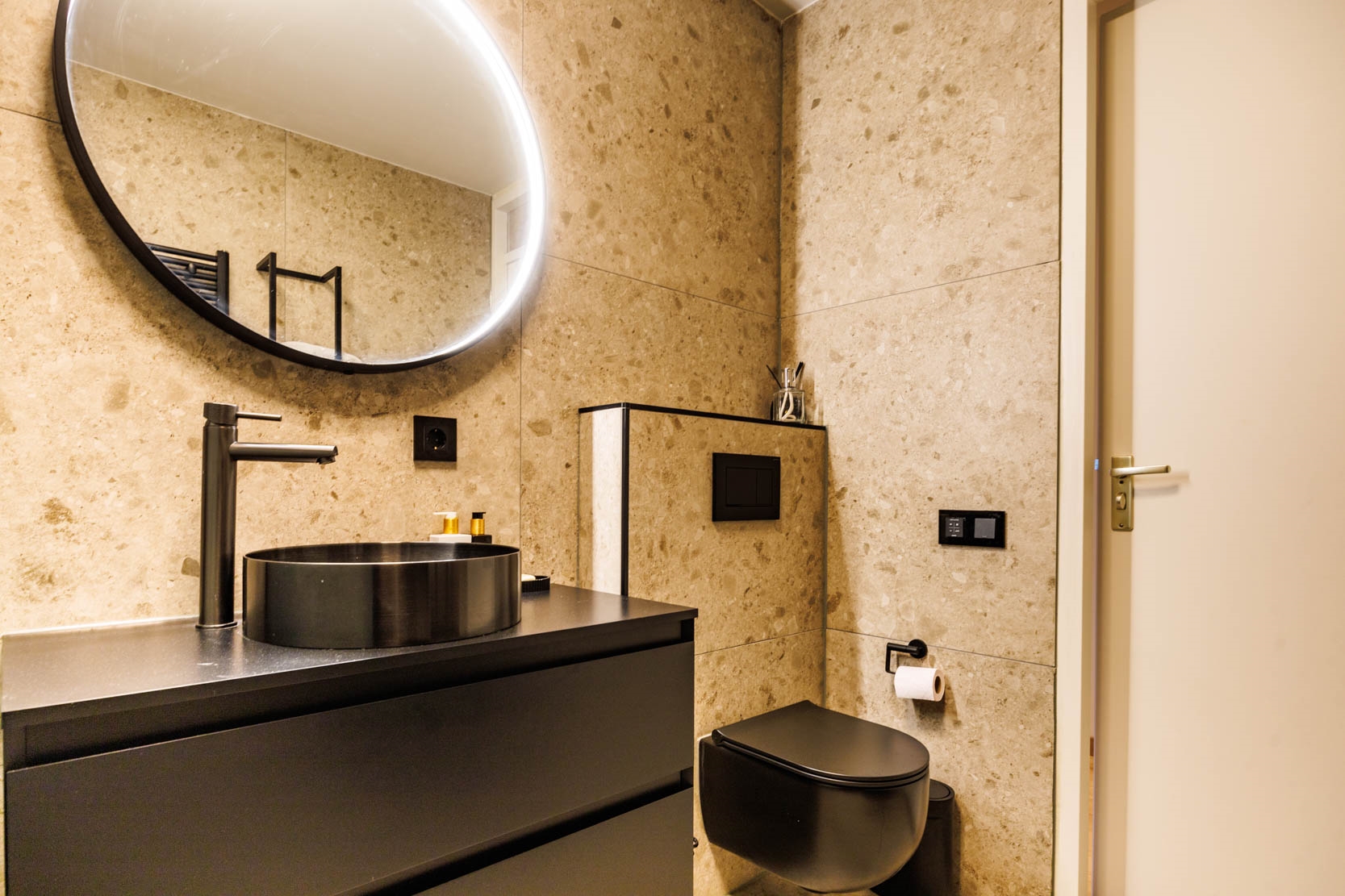 De luxe badkamer, ook vernieuwd in 2023, is uitgevoerd met een royale inloopdouche met regendouche, een modern wastafelmeubel met verlichte en verwarmde ronde spiegel, een tweede toilet (met bidet functie) en een designradiator. Zowel de badkamer als het separate toilet zijn volledig betegeld met prachtig natuursteen, wat bijdraagt aan de hoogwaardige en luxe uitstraling.