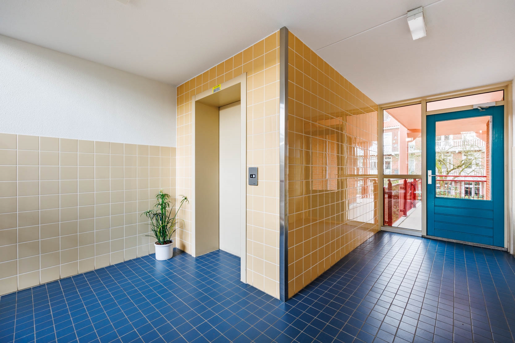 Gezamenlijke entree met brievenbussen en bellentableau. Verzorgde centrale hal met lift en trappenhuis.