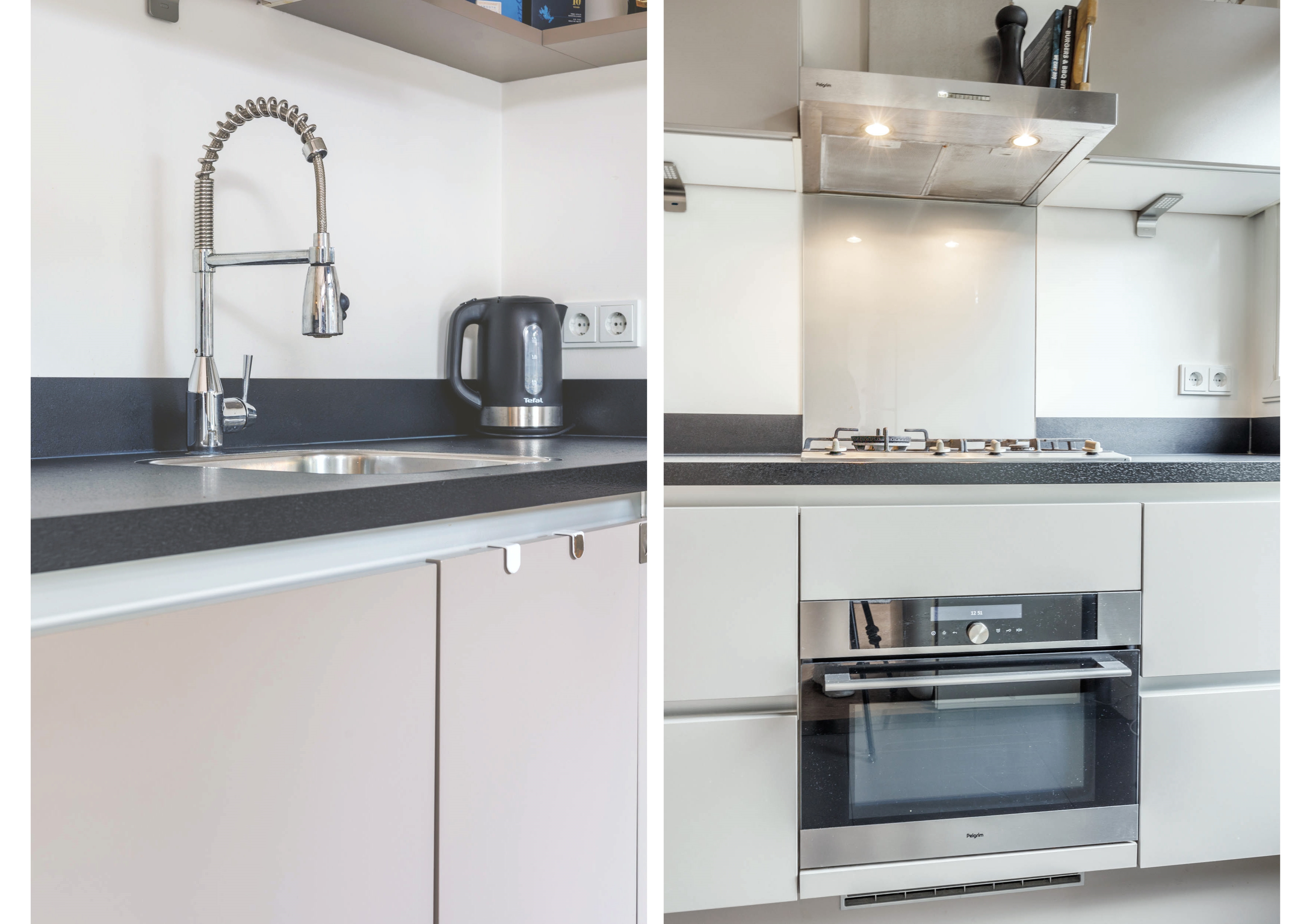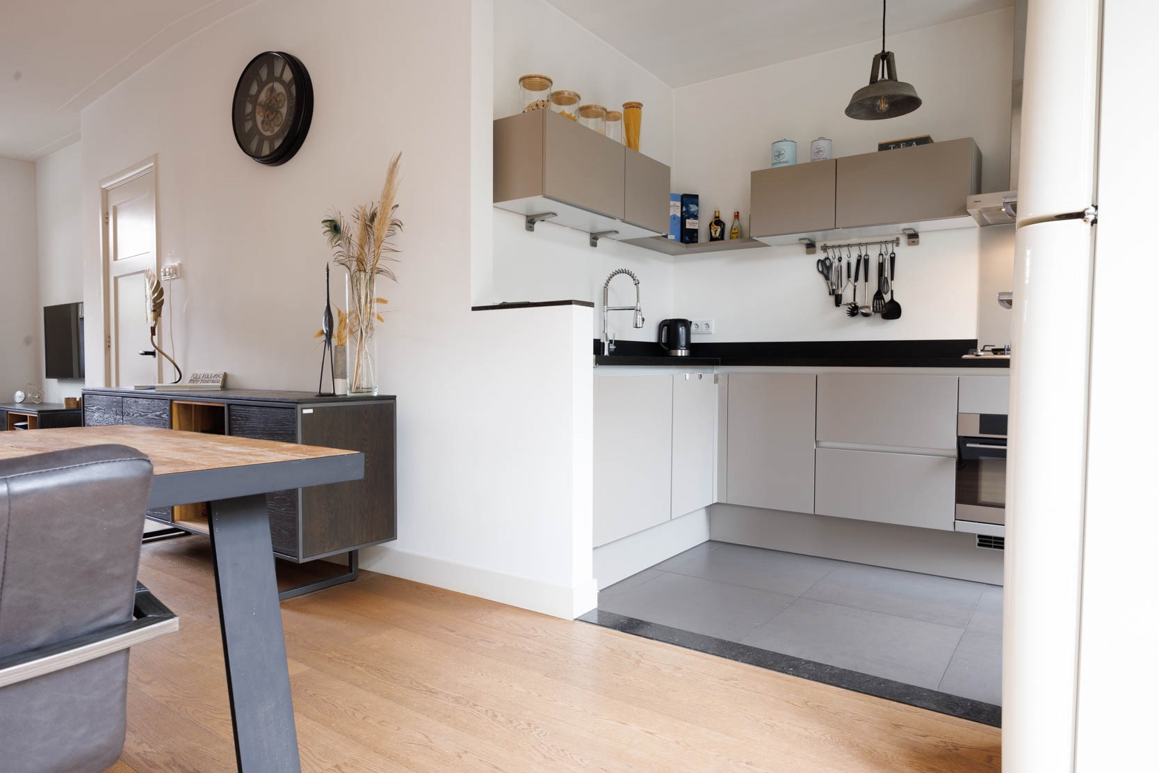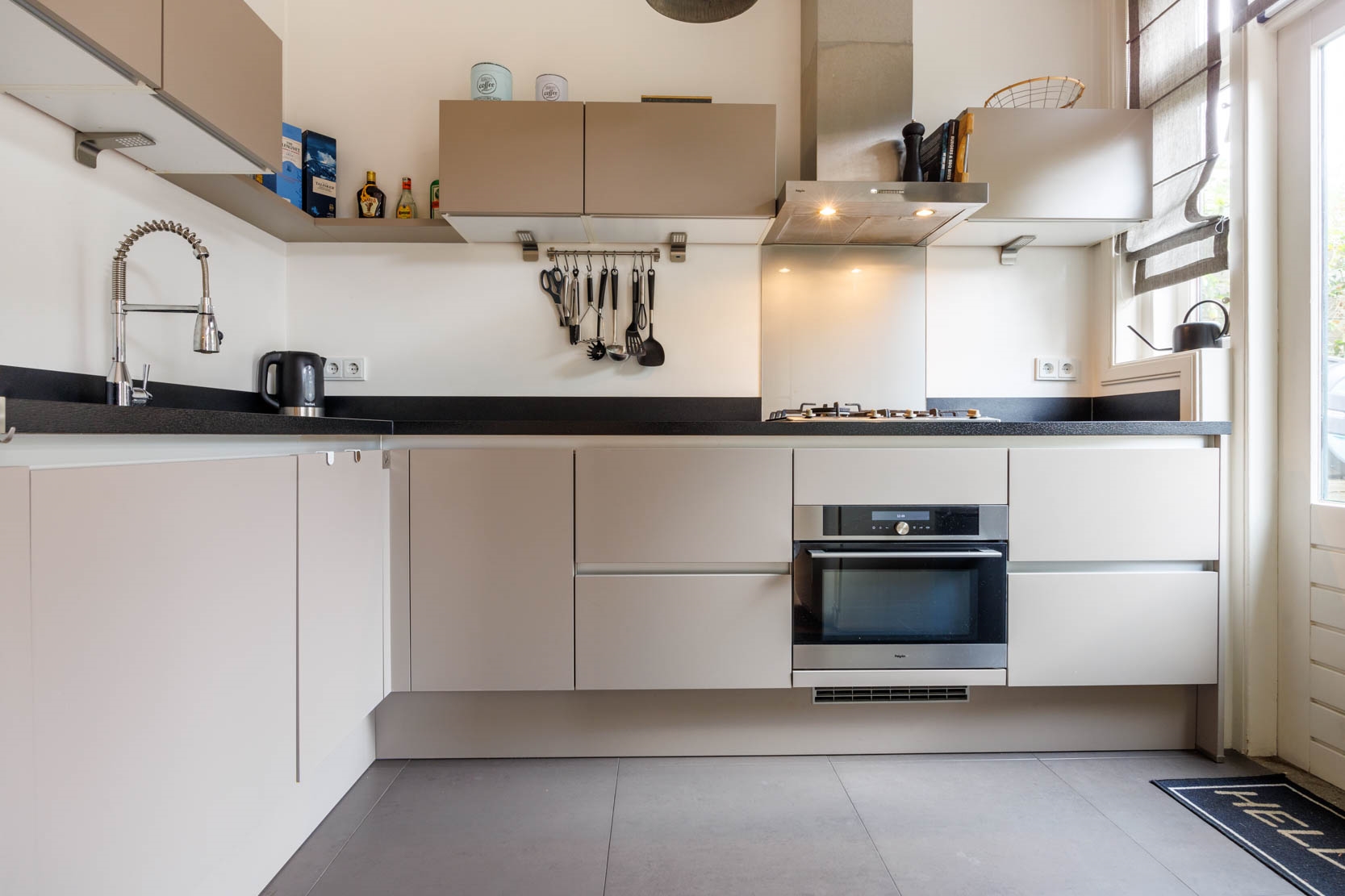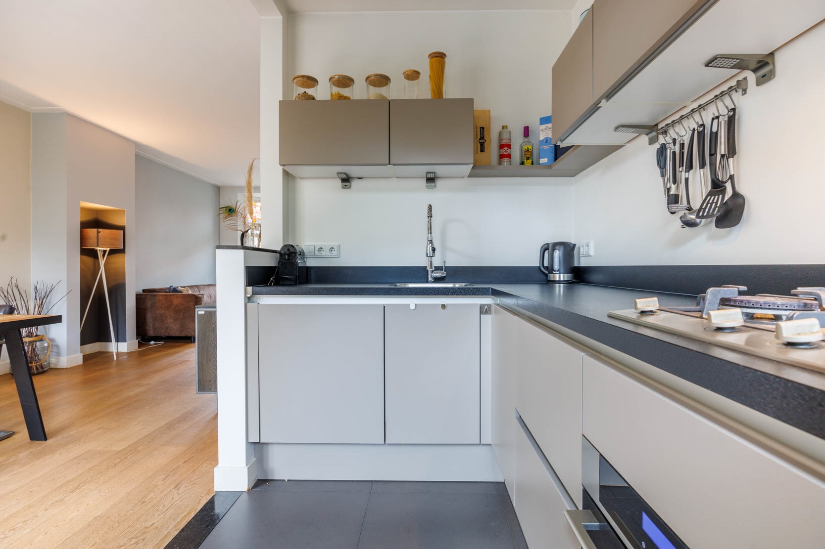 Modern semi-open kitchen with tiled floor (underfloor heating), equipped with various (built-in) appliances including a dishwasher, 4-burner gas stove, extractor hood, oven, and close-in boiler (plinth boiler). The kitchen also provides access to the garden.