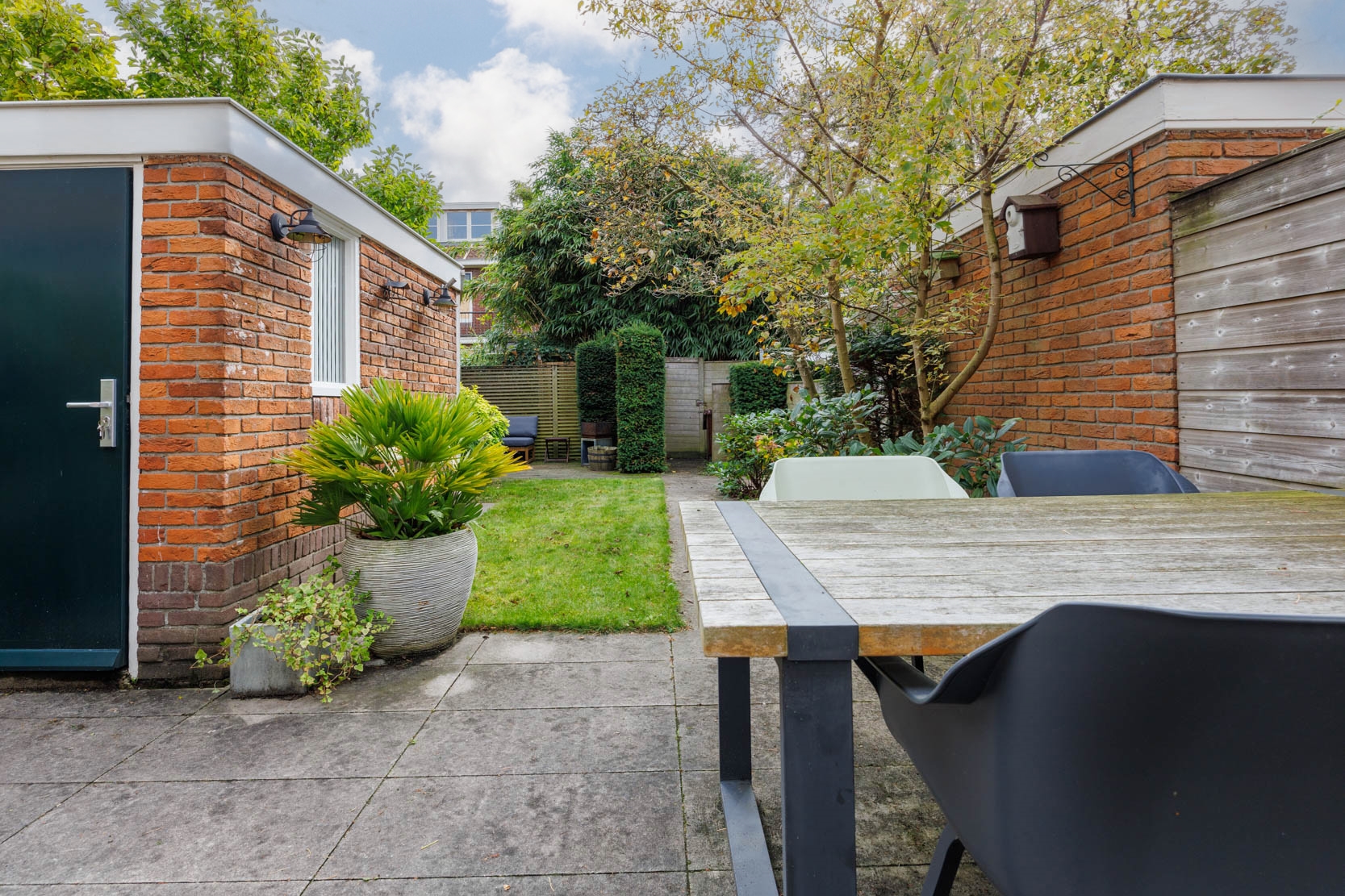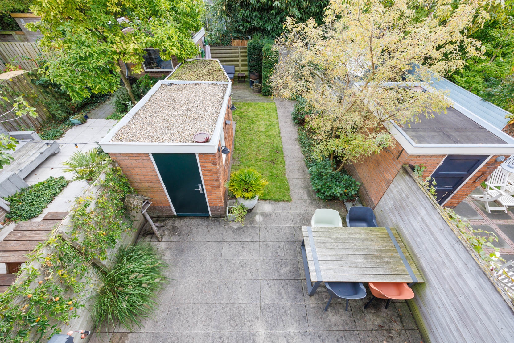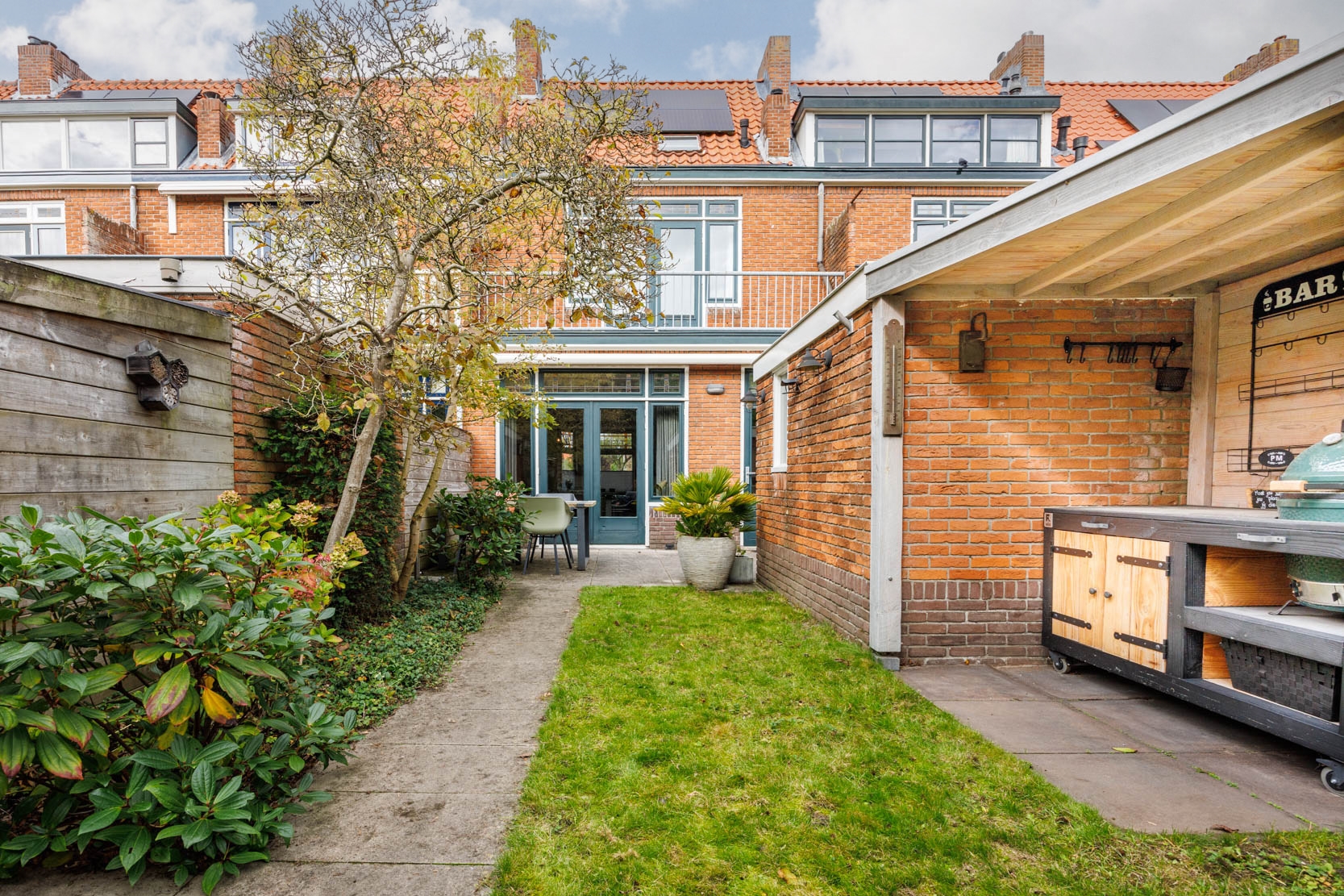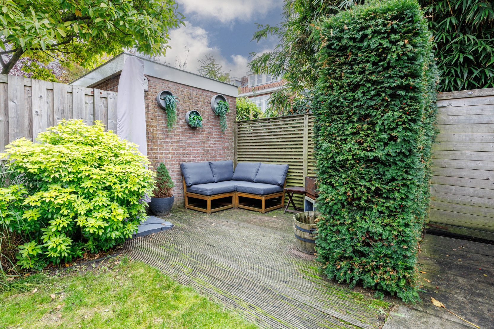The garden is beautifully landscaped with multiple seating areas and zones. At the rear, there is a cozy lounge area, a covered space suitable for an outdoor kitchen, a convenient storage shed, and a large terrace directly adjacent to the house.