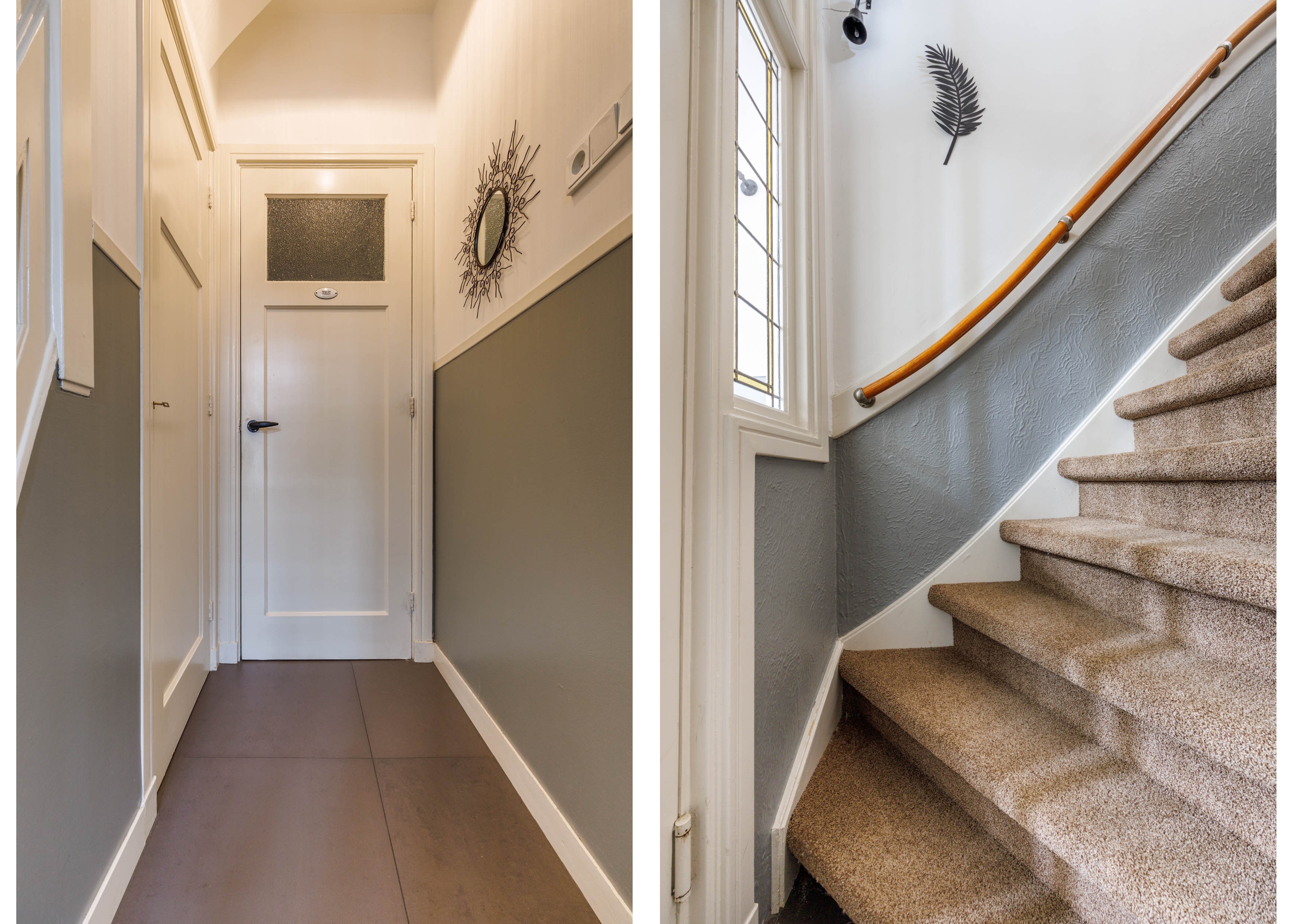 Authentic entrance. Vestibule with meter cupboard and tiled floor, followed by a hallway with stairs and a spacious modern toilet with washbasin. Bright and roomy living room with bay window, solid oak flooring, and French doors leading to the deep south-facing garden with storage shed and rear access.