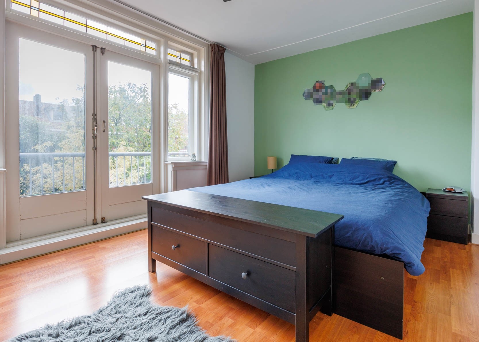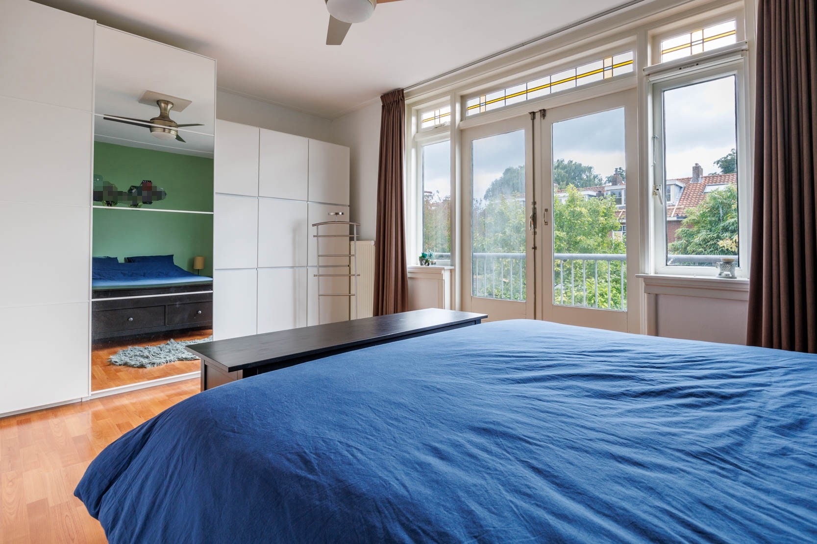 Overloop met toegang tot 3 slaapkamers en de trapopgang naar tweede verdieping. Ruime slaapkamer aan de achterzijde met toegang tot een heerlijk balkon. Badkamer met inloopdouche en wastafelmeubel. Alle slaapkamers beschikken nog over glas in-lood ramen en zijn voorzien van een laminaatvloer.