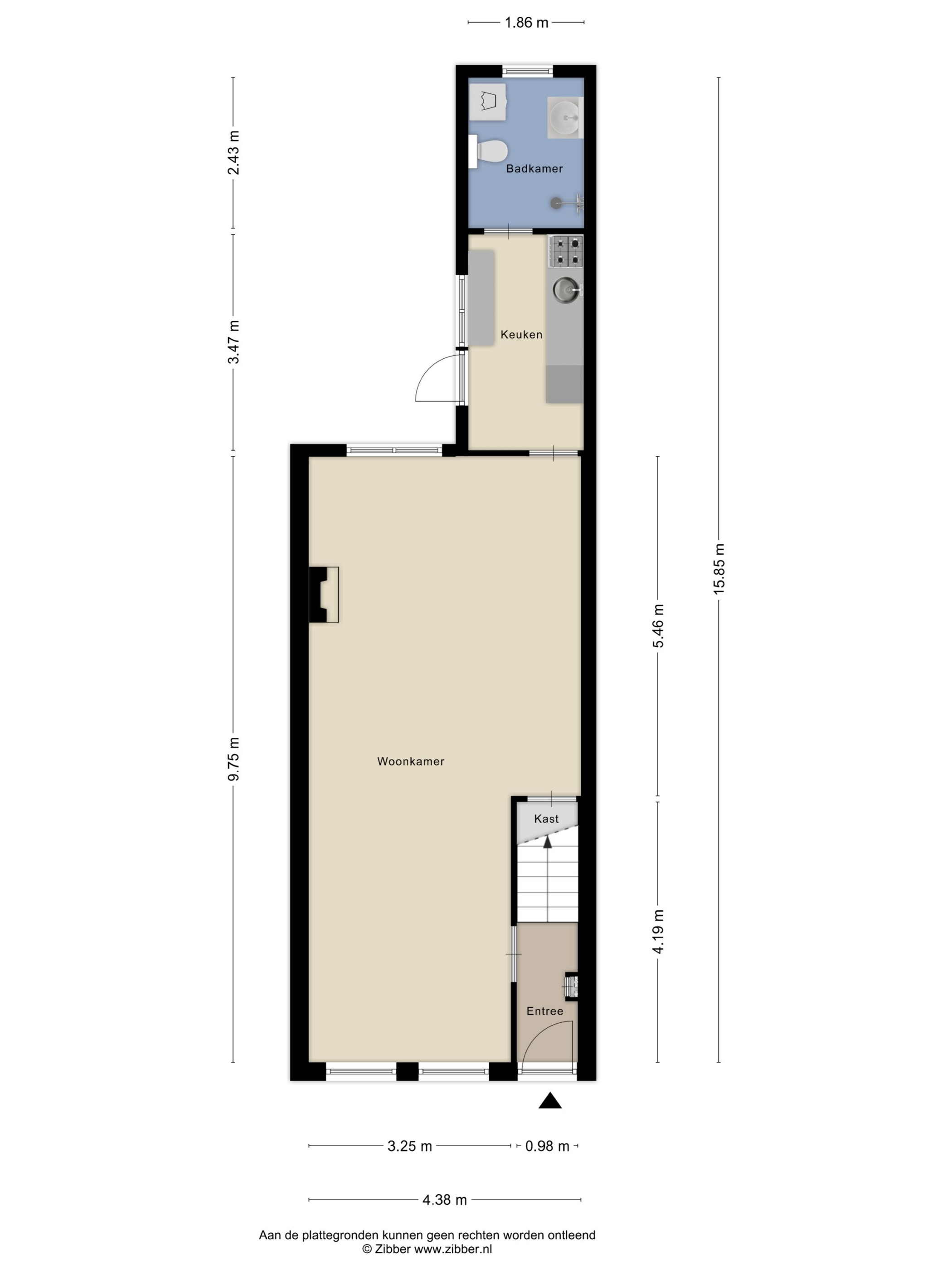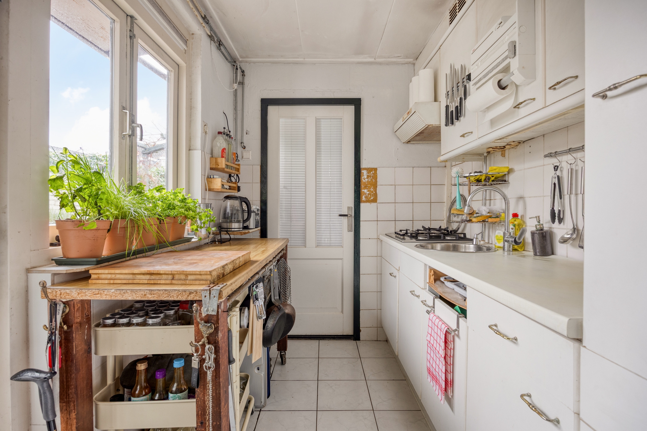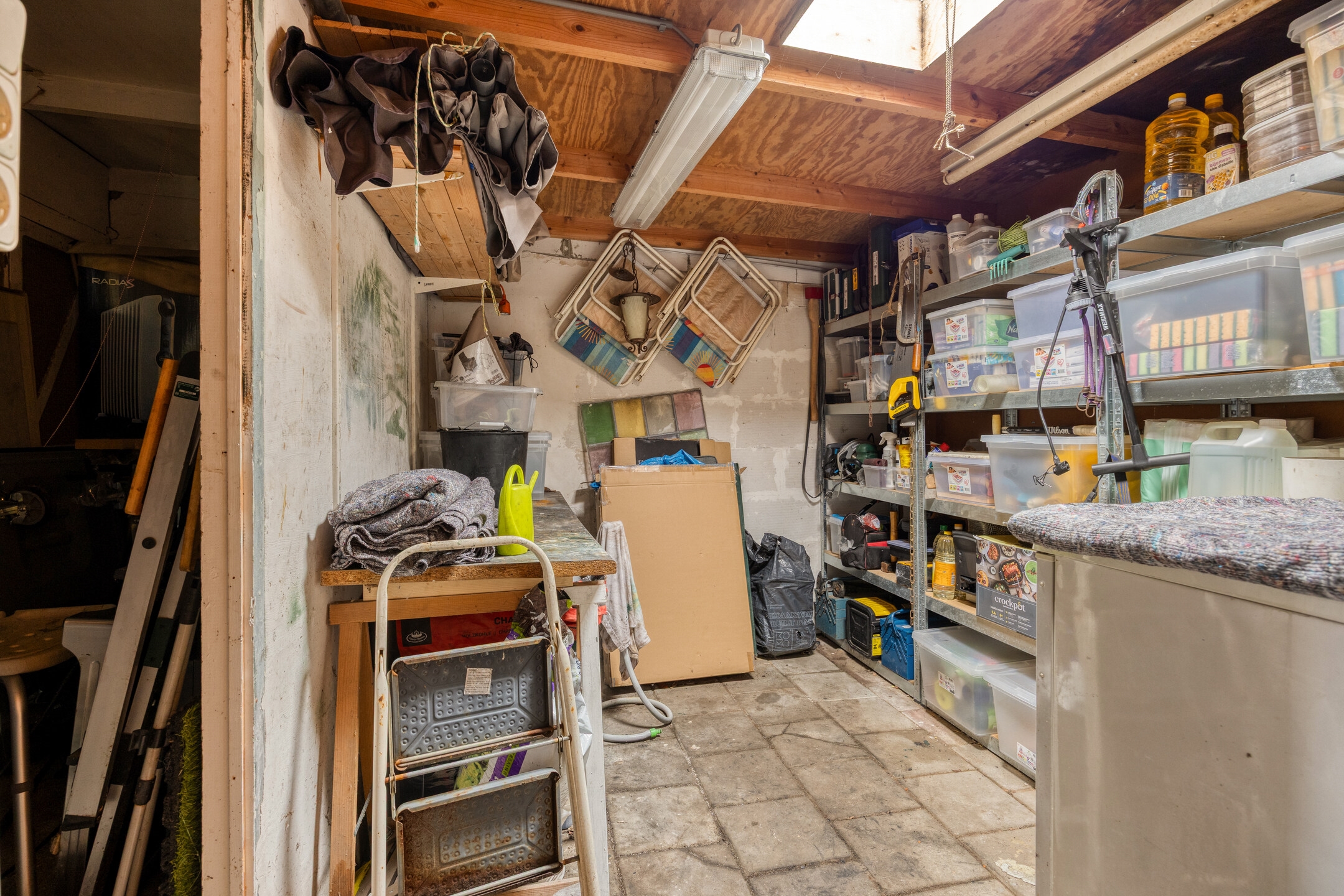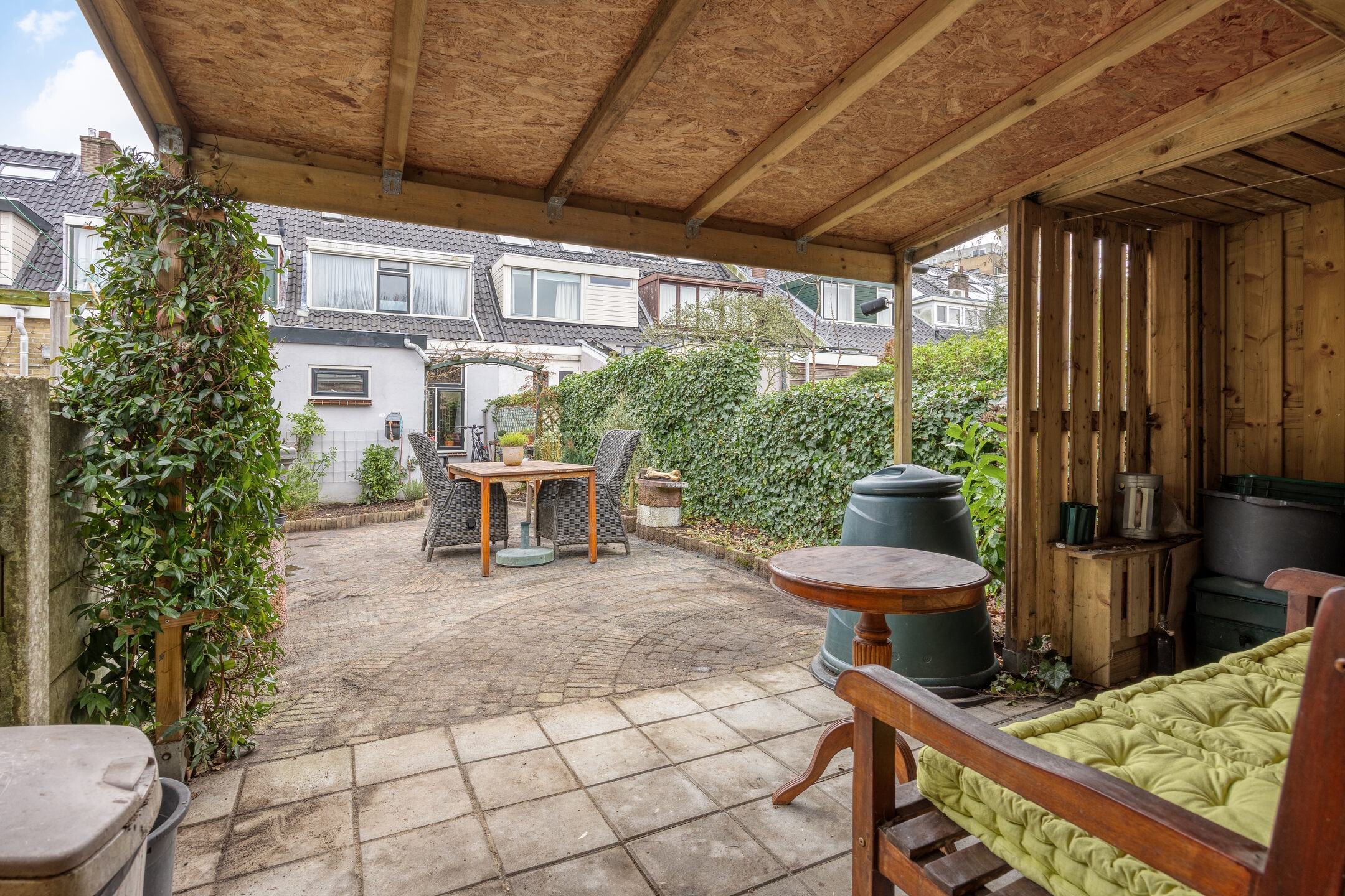 De woonkamer strekt zich uit van voor- tot achtergevel en biedt ruimte voor een ruime eettafel en zitgedeelte. De halfopen keuken sluit logisch aan op deze leefruimte en vormt een solide basis voor wie droomt van een eigentijdse woonkeuken. Via de keukendeur stap je zo de zonnige achtertuin op het zuidwesten in: groen, privacy-rijk en voorzien van een recent geplaatste overkapping, een ruime berging én een handige achterom.