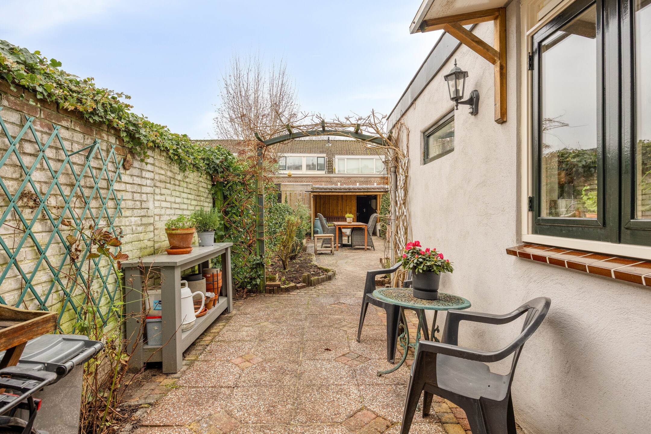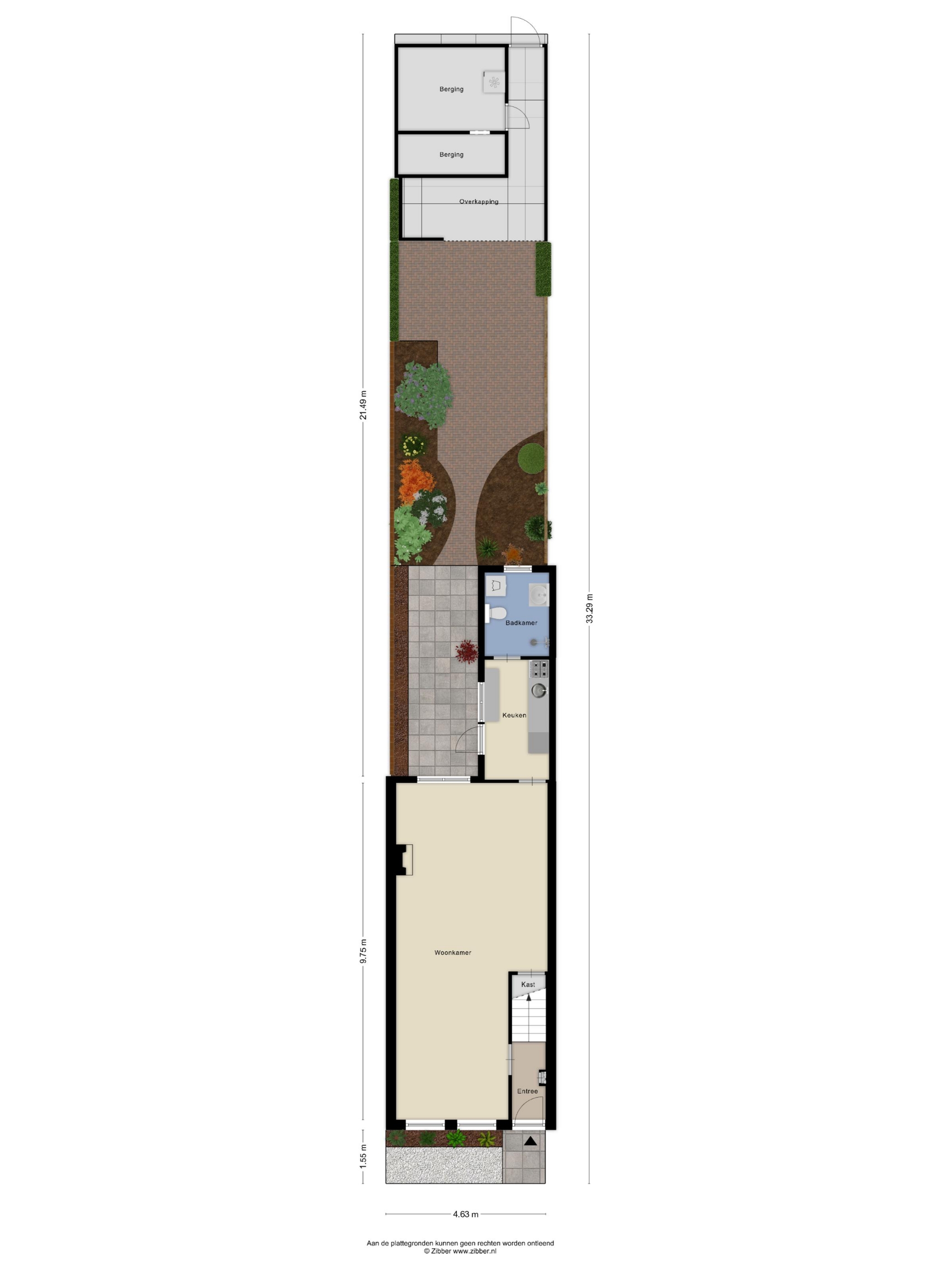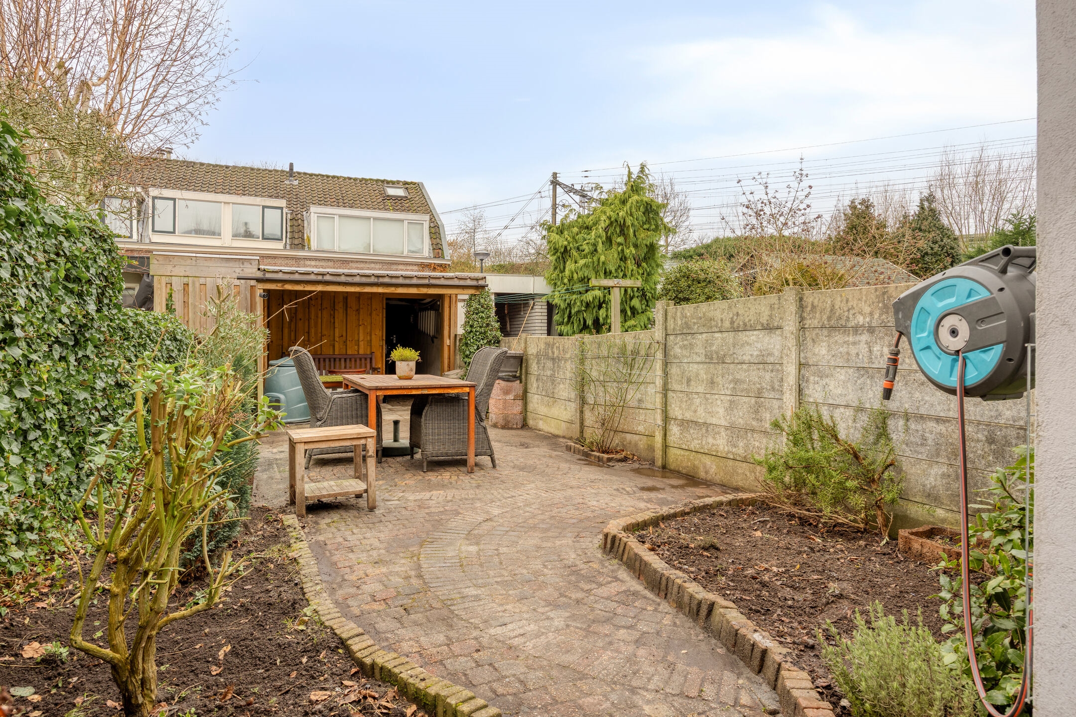 • Nieuwe voortuin en ruime achtertuin met overkapping, berging en achterom