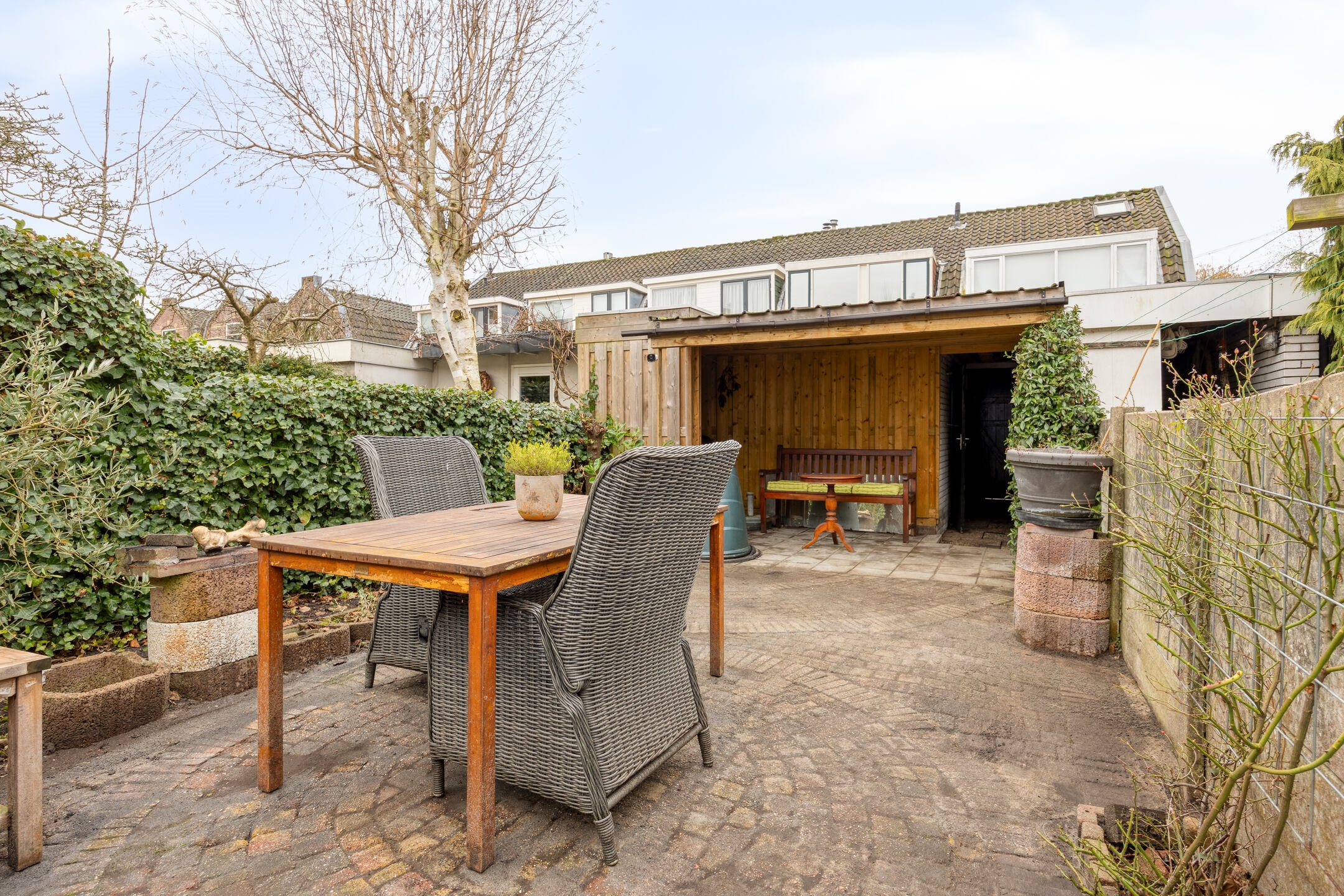 The living room extends from the front to the rear of the house and easily accommodates both a generous dining table and a comfortable seating area. The semi-open kitchen connects naturally to the living space and forms a solid foundation for those dreaming of a contemporary open-plan kitchen. From the kitchen, you step directly into the sunny southwest-facing garden: green, private, and featuring a recently installed covered terrace, a spacious storage shed, and a convenient rear access.