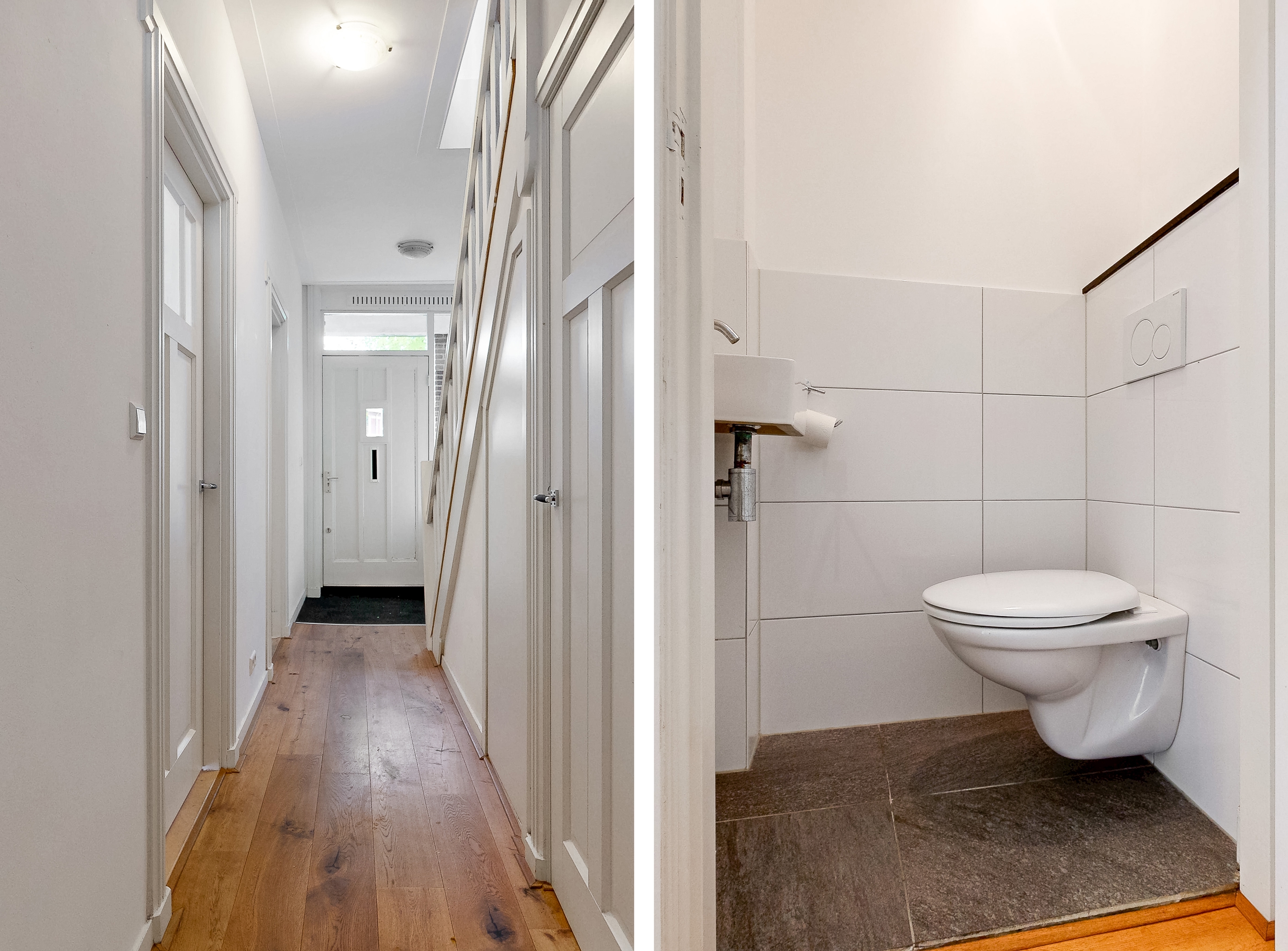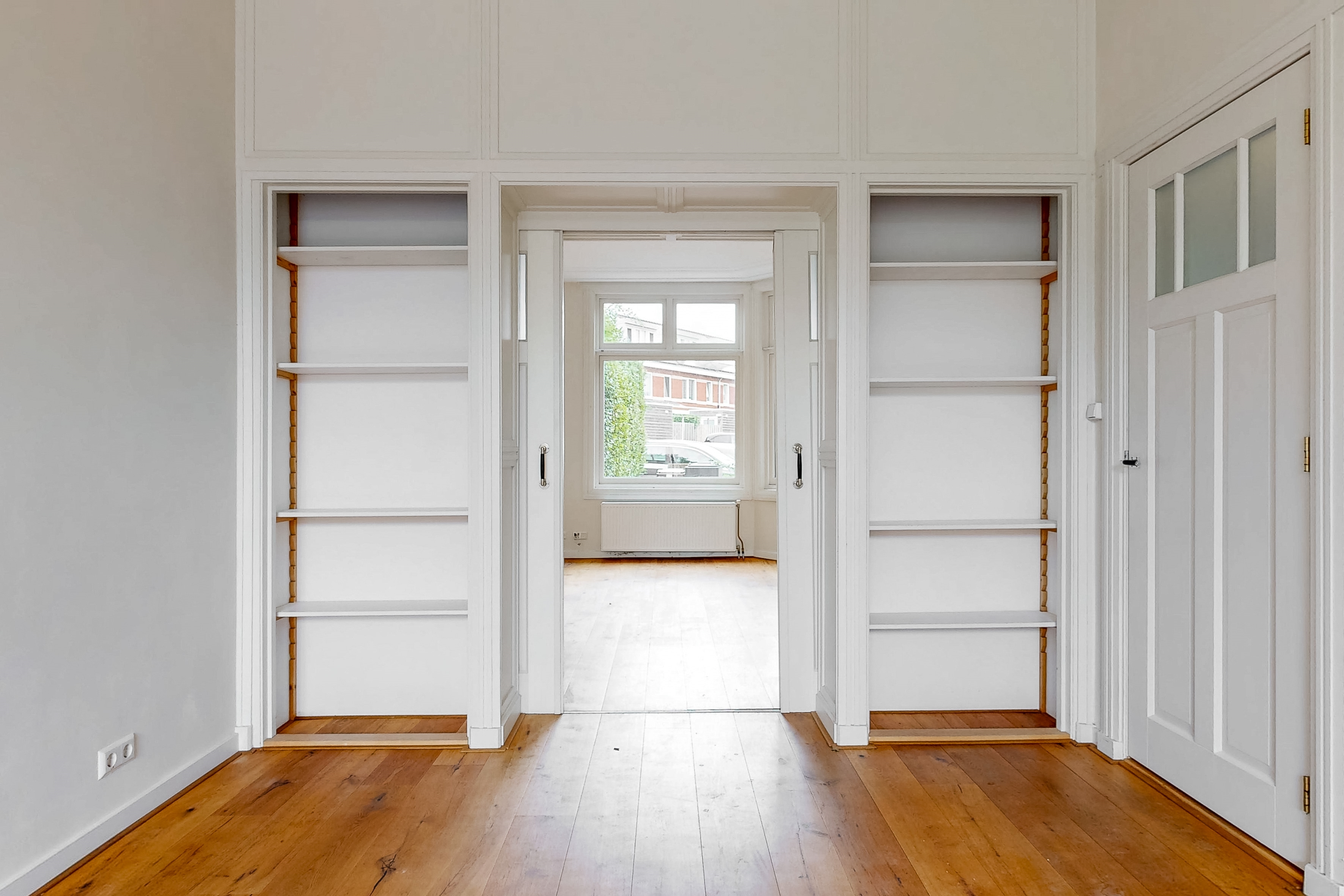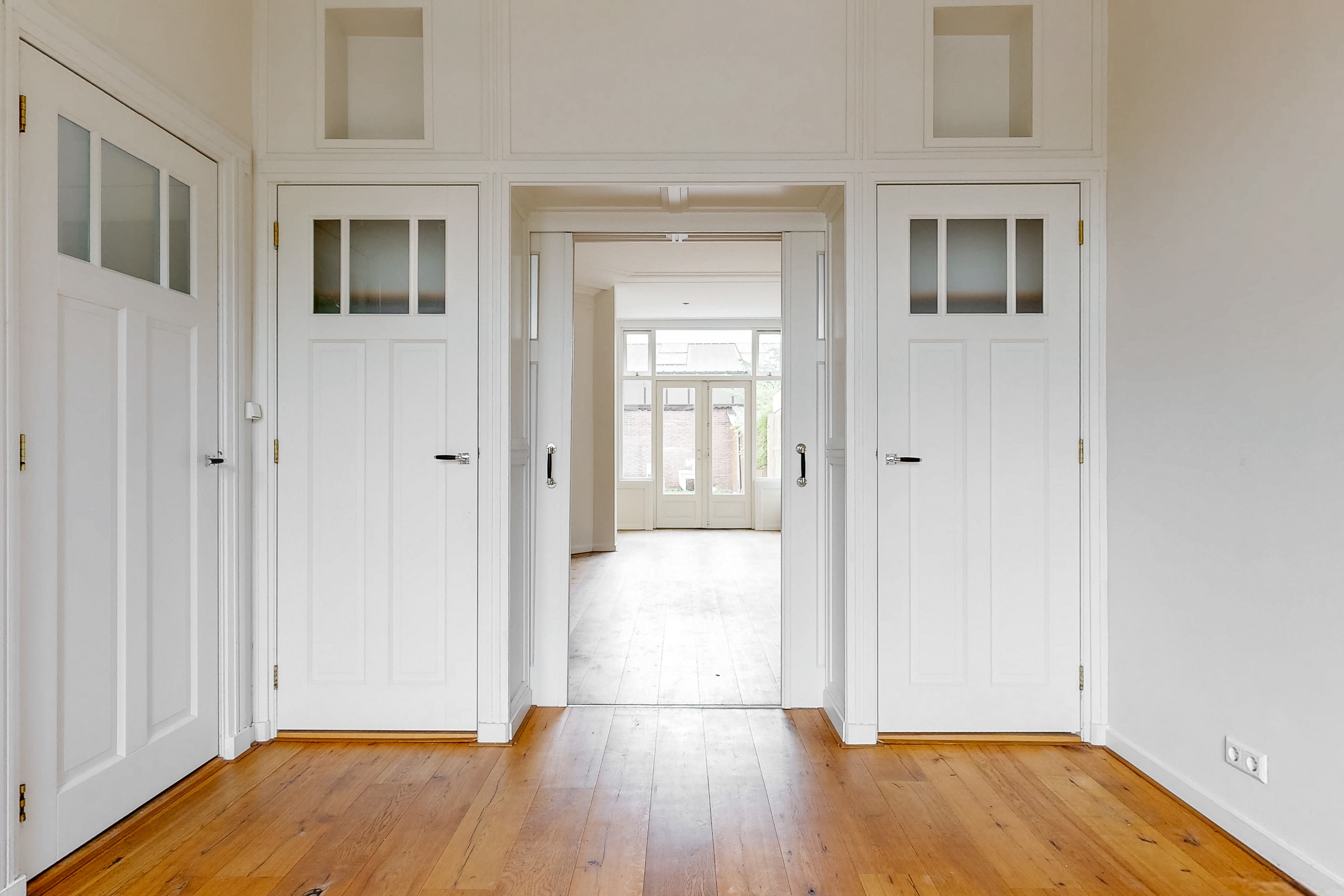 You reach the house via the spacious front garden with lots of privacy. Entrance with meter cupboard, wardrobe and long corridor with stairs to the floor, stair cupboard, toilet with sink and access to the living room. The very bright and spacious living room en suite is no less than 12.50 meters long with an approximately 3 meter high ceiling. Thanks to the en suite with sliding doors and cupboards on both sides, the living room can be divided into 2 separate rooms. The living room has a beautiful wooden floor, smooth plastered walls and French doors to the sunny backyard. There is a wide passage to the modern kitchen with luxurious furnishings and beautiful anthracite worktop. The modern kitchen is equipped with all necessary (built-in) appliances such as a dishwasher, combination oven, fridge-freezer combination and a 5-burner gas hob with stainless steel extractor hood.