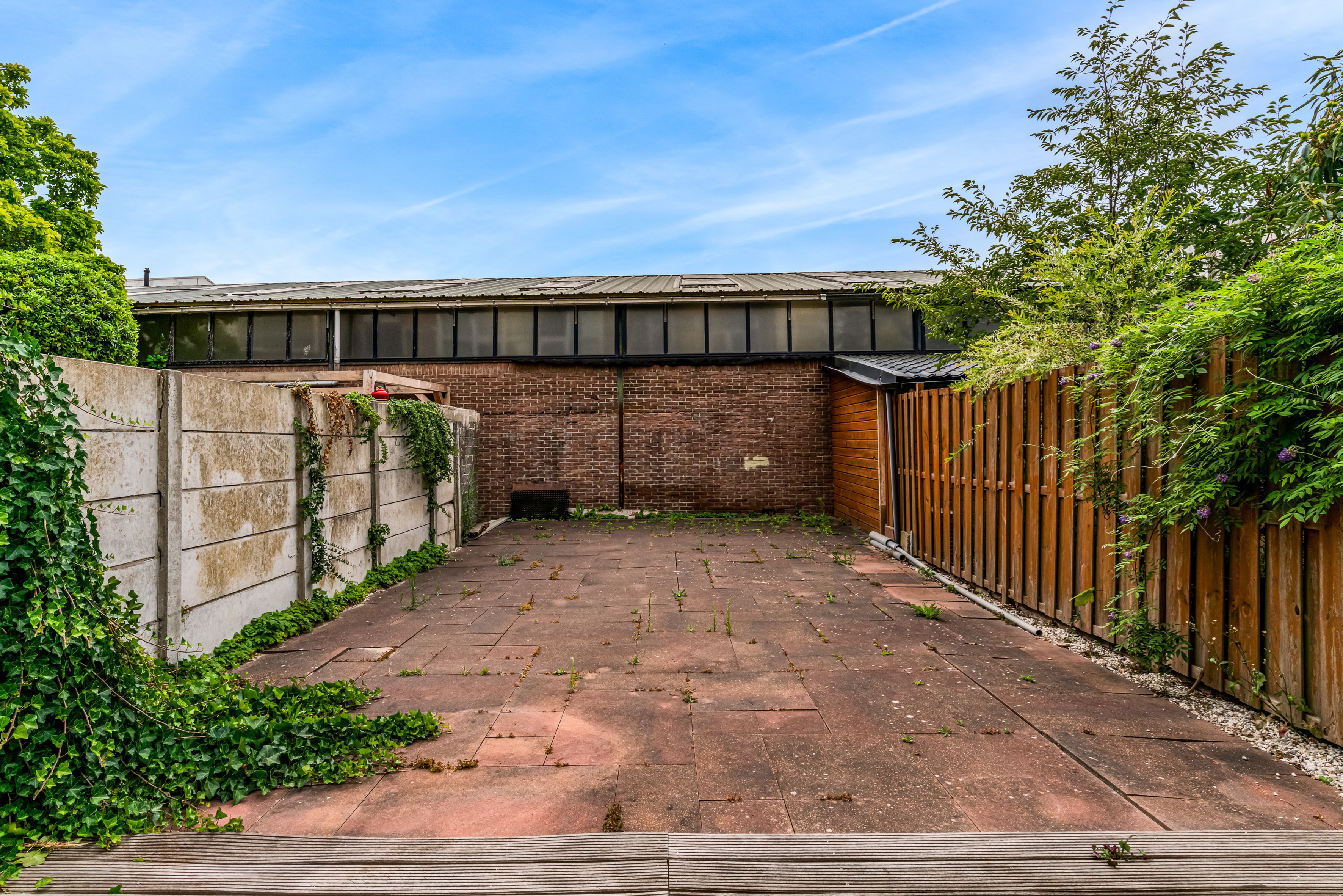 You can enter the sunny backyard through the kitchen and from the back room through French doors. The backyard could use a makeover. The spacious backyard measures no less than 60 m², is wonderfully sheltered and faces south.