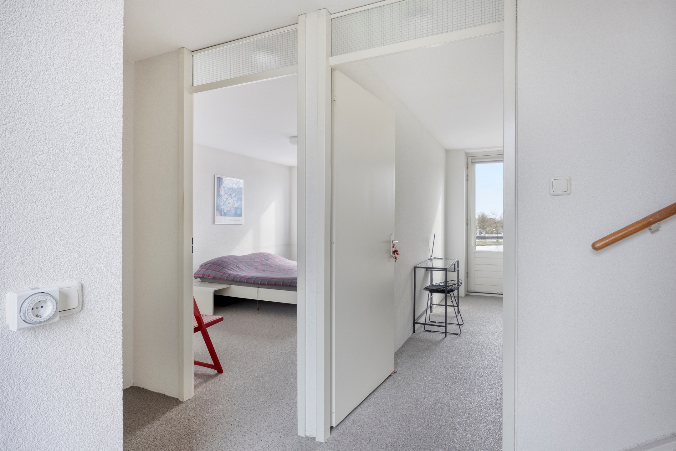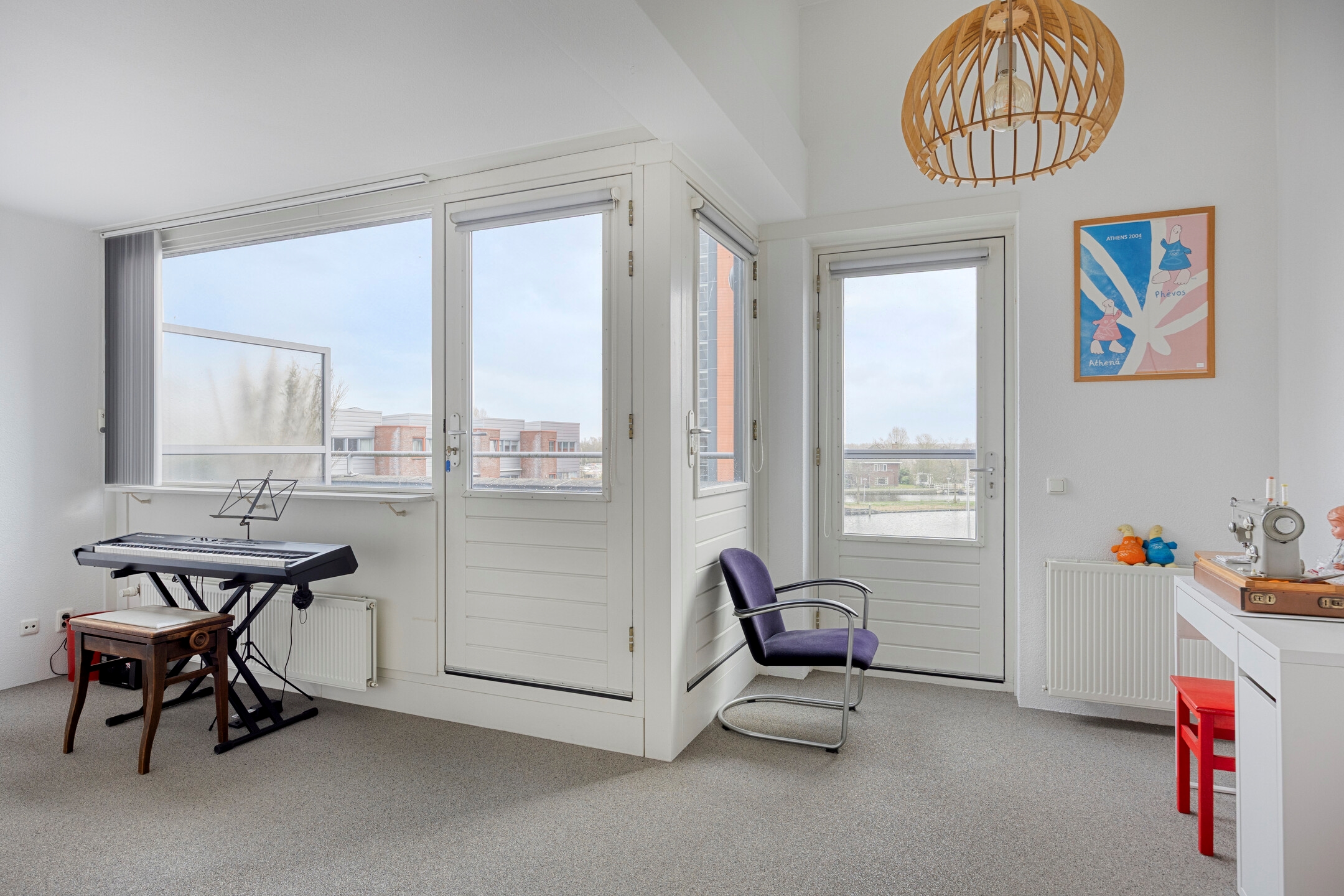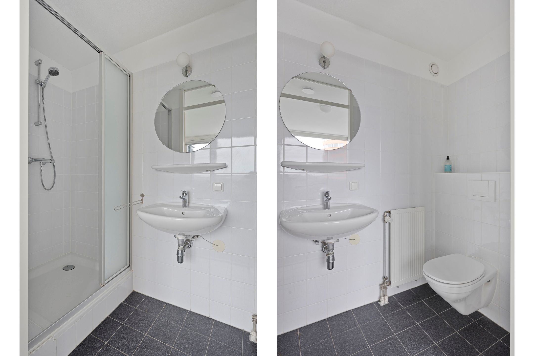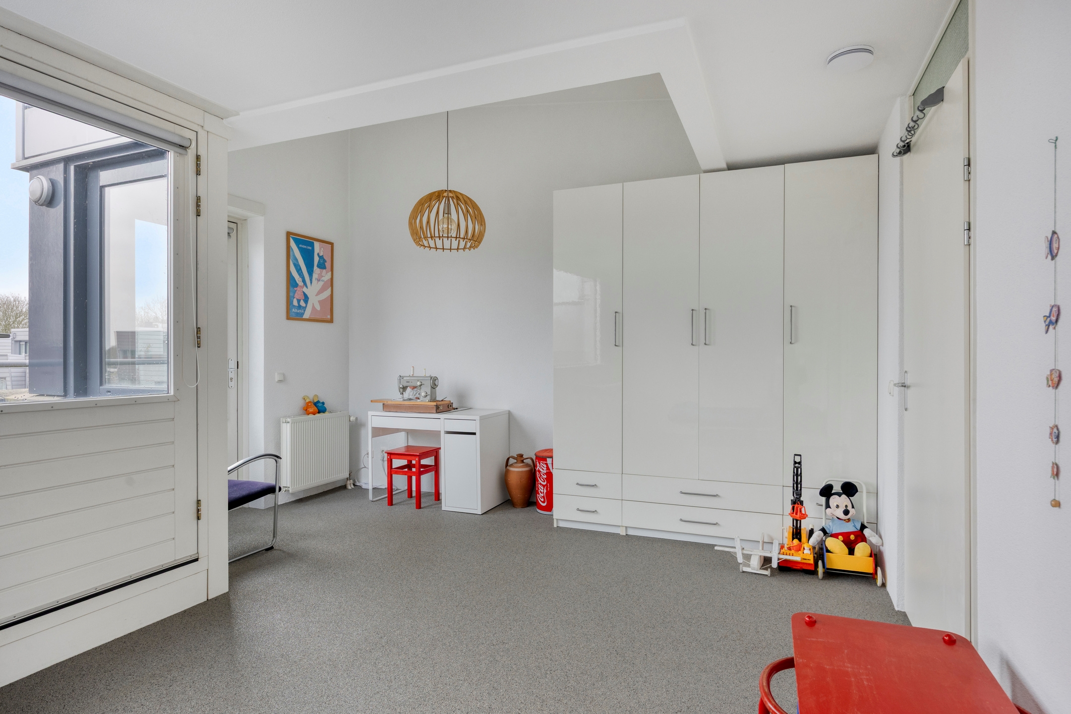 De bovenste verdieping biedt een ruime en flexibele indeling. Hier bevindt zich een royale kamer met veel lichtinval en directe toegang tot het balkon. Deze ruimte is op verschillende manieren te gebruiken, afhankelijk van jouw woonwensen. Daarnaast is er een tweede badkamer met douche, wastafel en toilet, evenals een aparte berging/wasruimte.