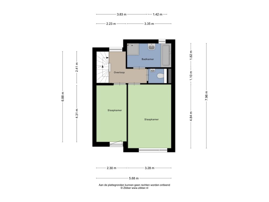 Op de tweede verdieping bevinden zich twee goed bemeten kamers die naar eigen wens in te richten zijn. Daarnaast is er een complete badkamer aanwezig, voorzien van een ligbad, douche en wastafel. Het toilet is separaat gesitueerd, wat zorgt voor extra comfort. De overloop verbindt alle ruimtes op een praktische manier.