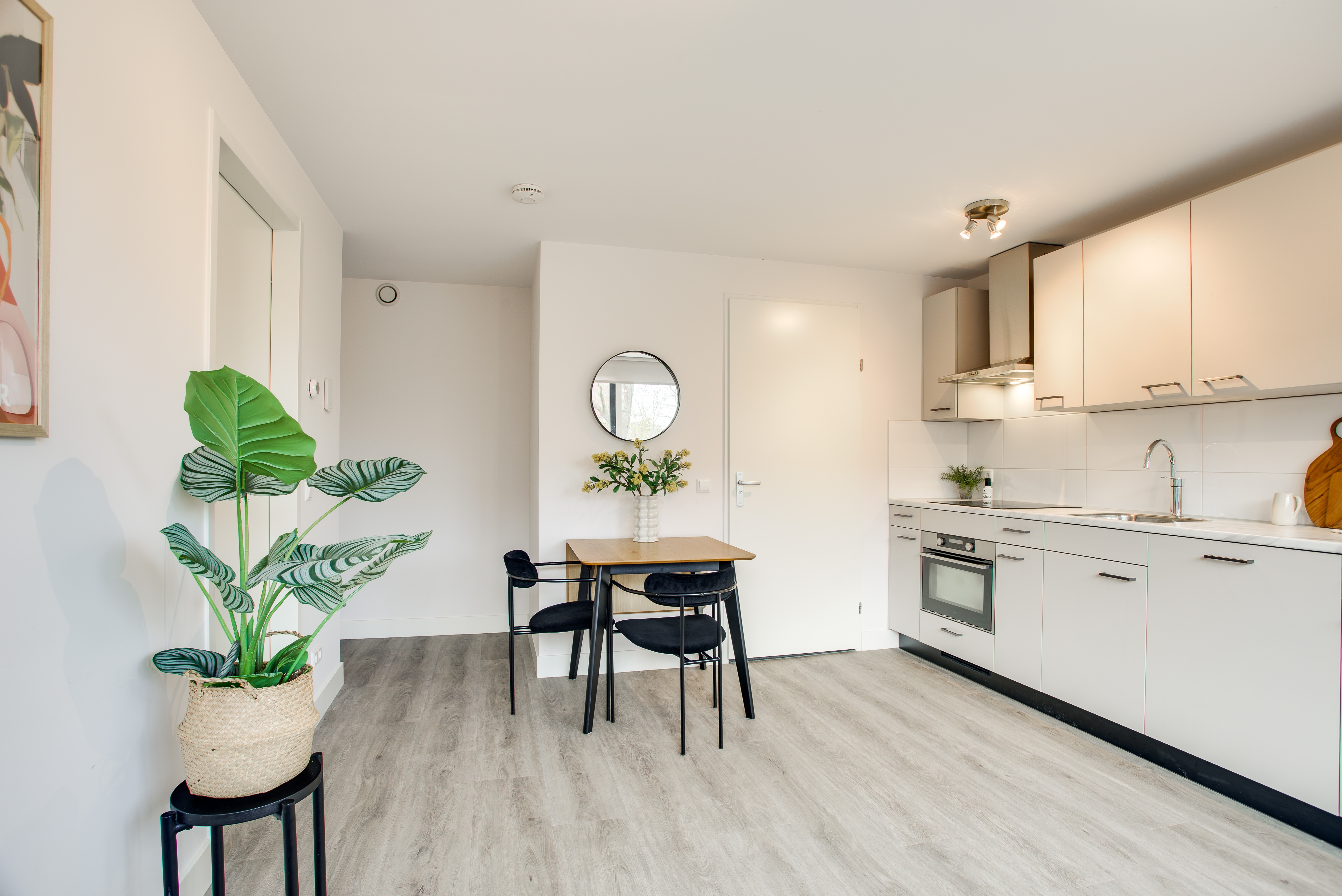 Via de gezamenlijke entree bereik je de woning op de eerste verdieping. Binnen tref je een lichte woonkamer met open keuken, voorzien van inbouwapparatuur zoals een inductiekookplaat, oven en vaatwasser. Dankzij de grote raampartijen is de ruimte heerlijk licht en voelt deze ruim aan.