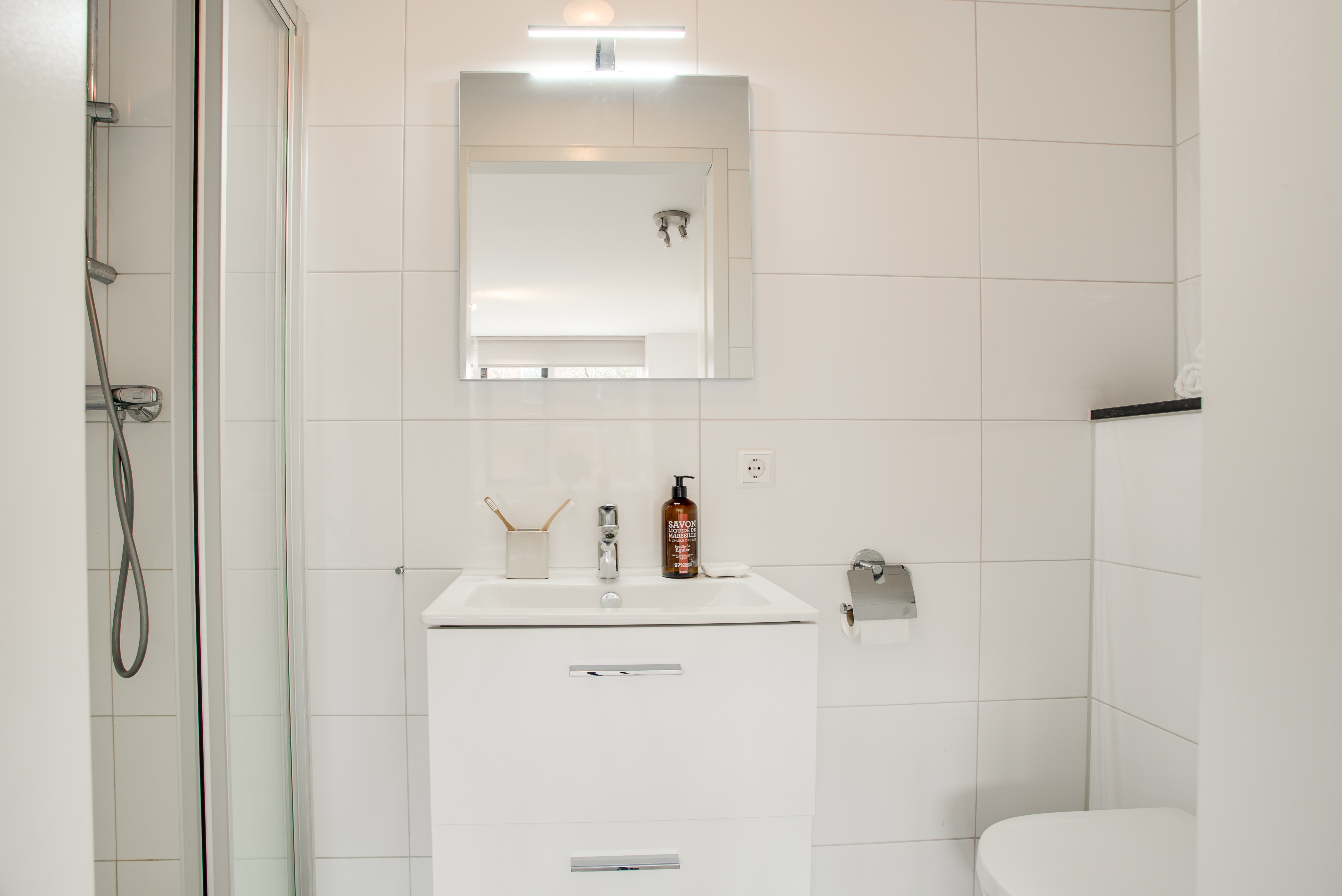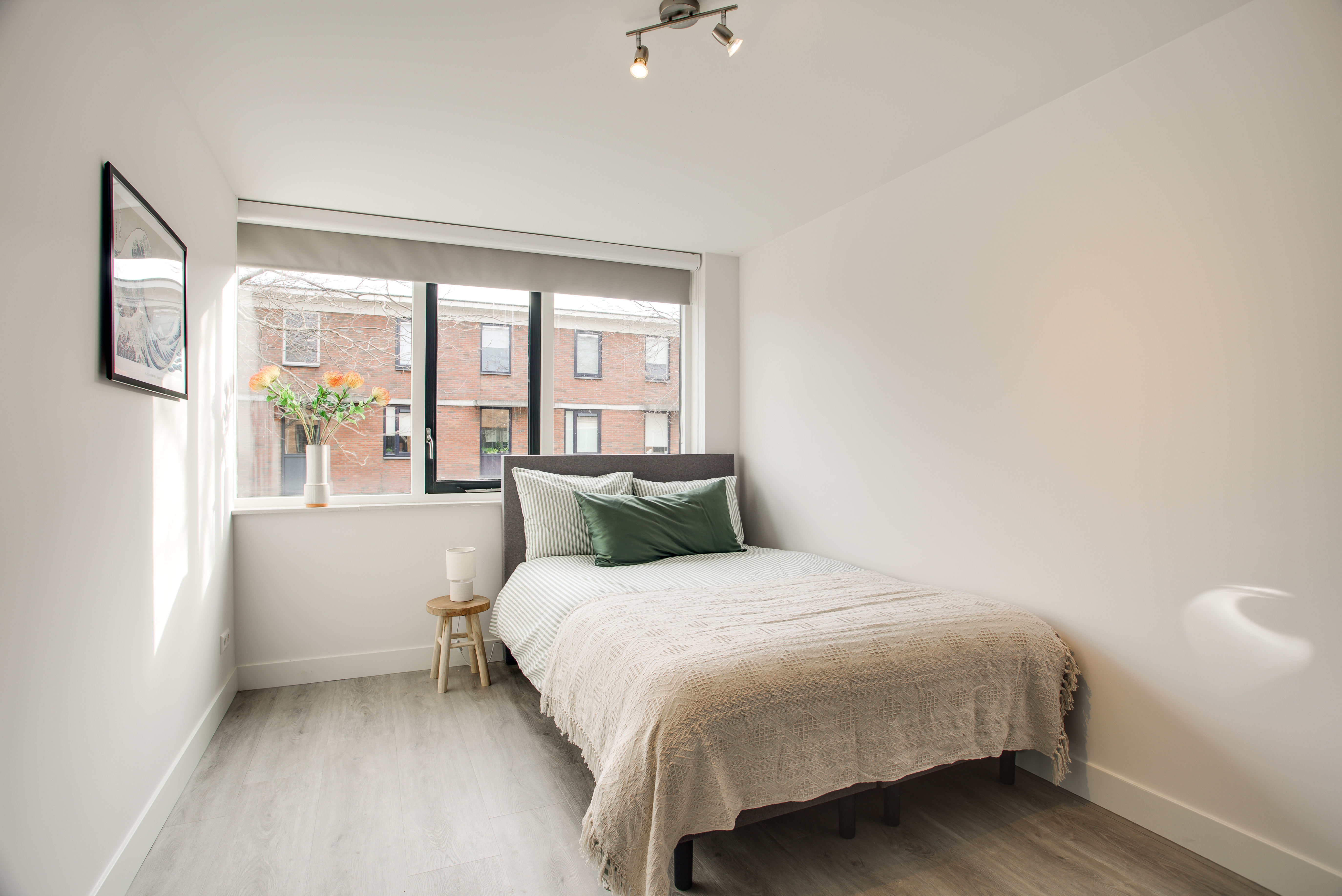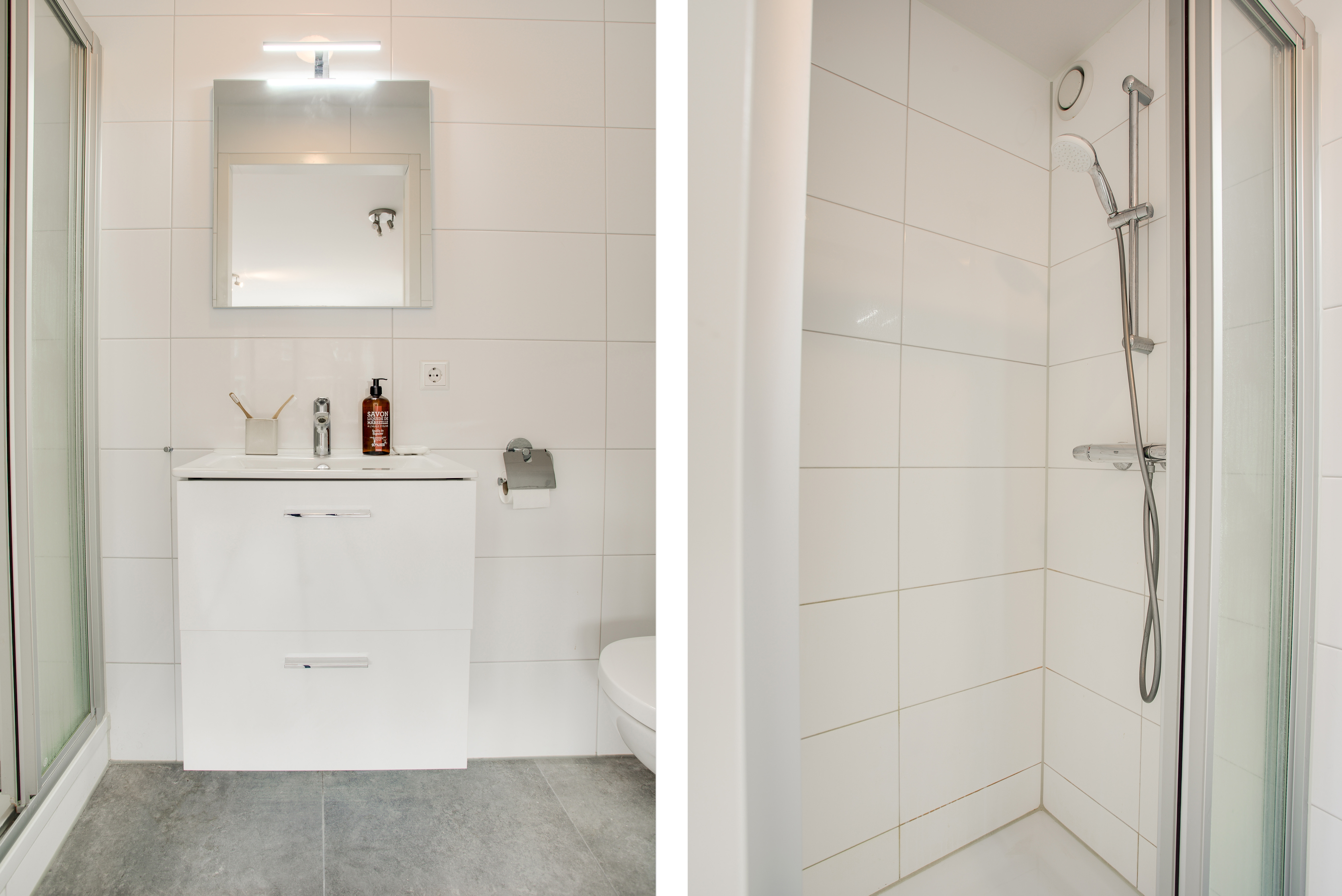 De slaapkamer is praktisch ingedeeld en biedt voldoende plek voor een tweepersoonsbed en kastruimte. De badkamer is modern uitgevoerd en beschikt over een douche, toilet en wastafelmeubel. Ook is er een aparte opstelplaats voor de wasmachine.