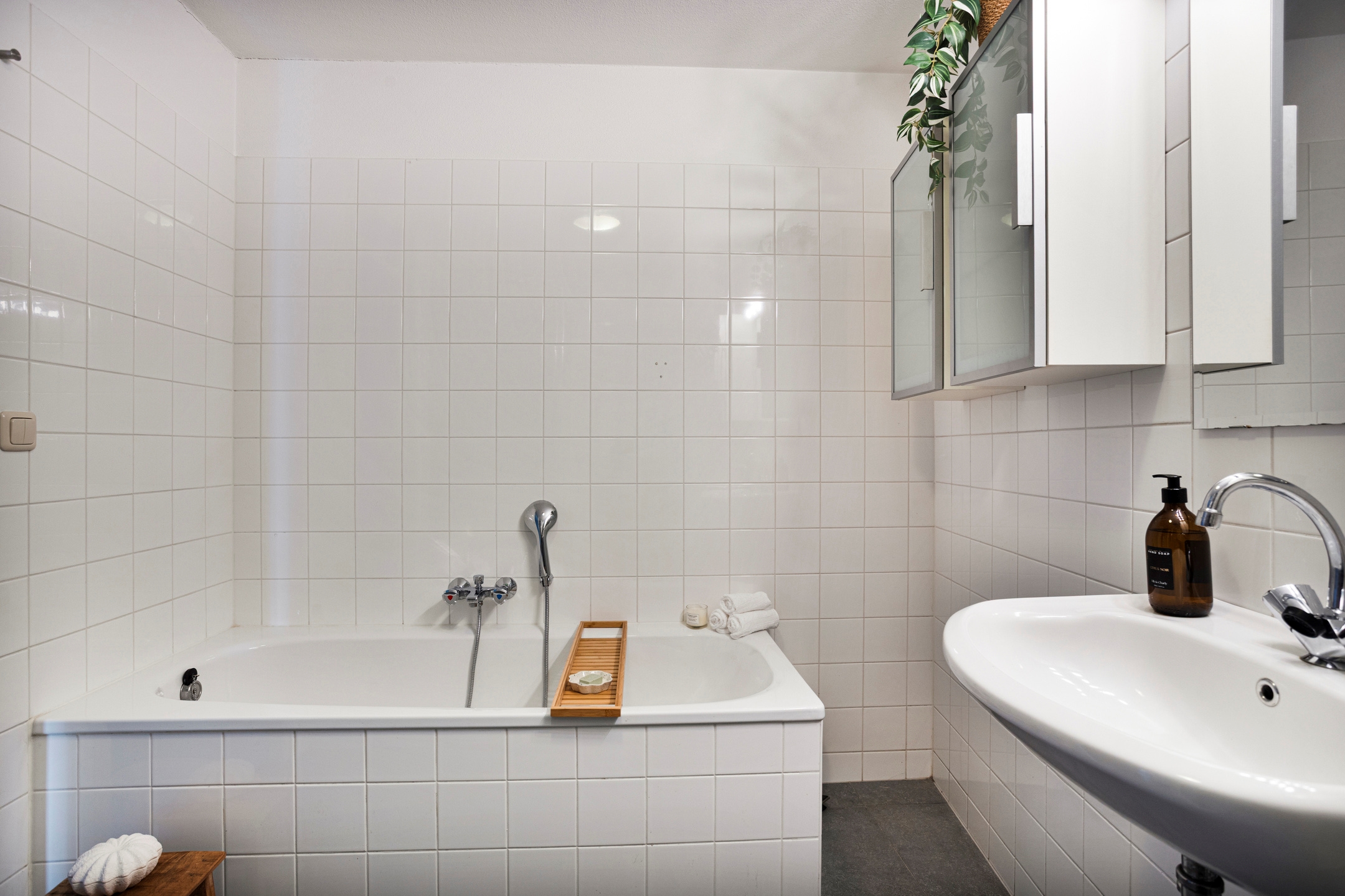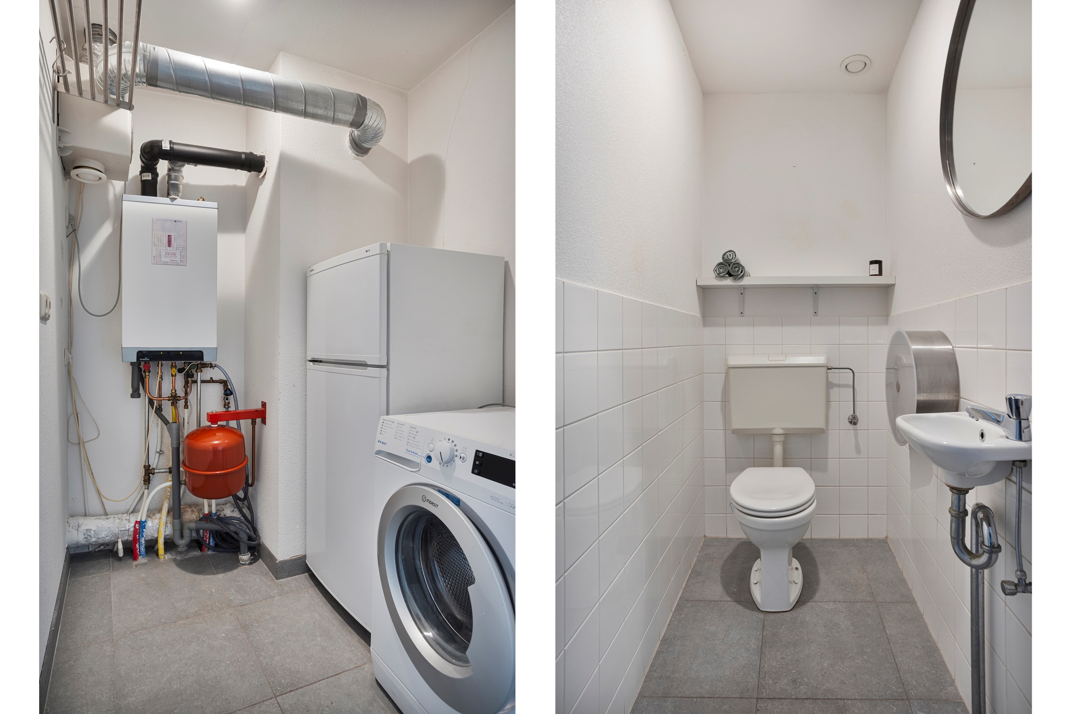 De badkamer is verzorgd en compleet ingericht met een ligbad, aparte douche, wastafel en handdoekradiator. Het toilet is separaat en bereikbaar vanuit de hal. Daarnaast is er een aparte wasruimte met opstelling van de cv-ketel, wat bijdraagt aan een nette en functionele indeling. De woning verkeert in een nette staat van onderhoud en is direct te betrekken.