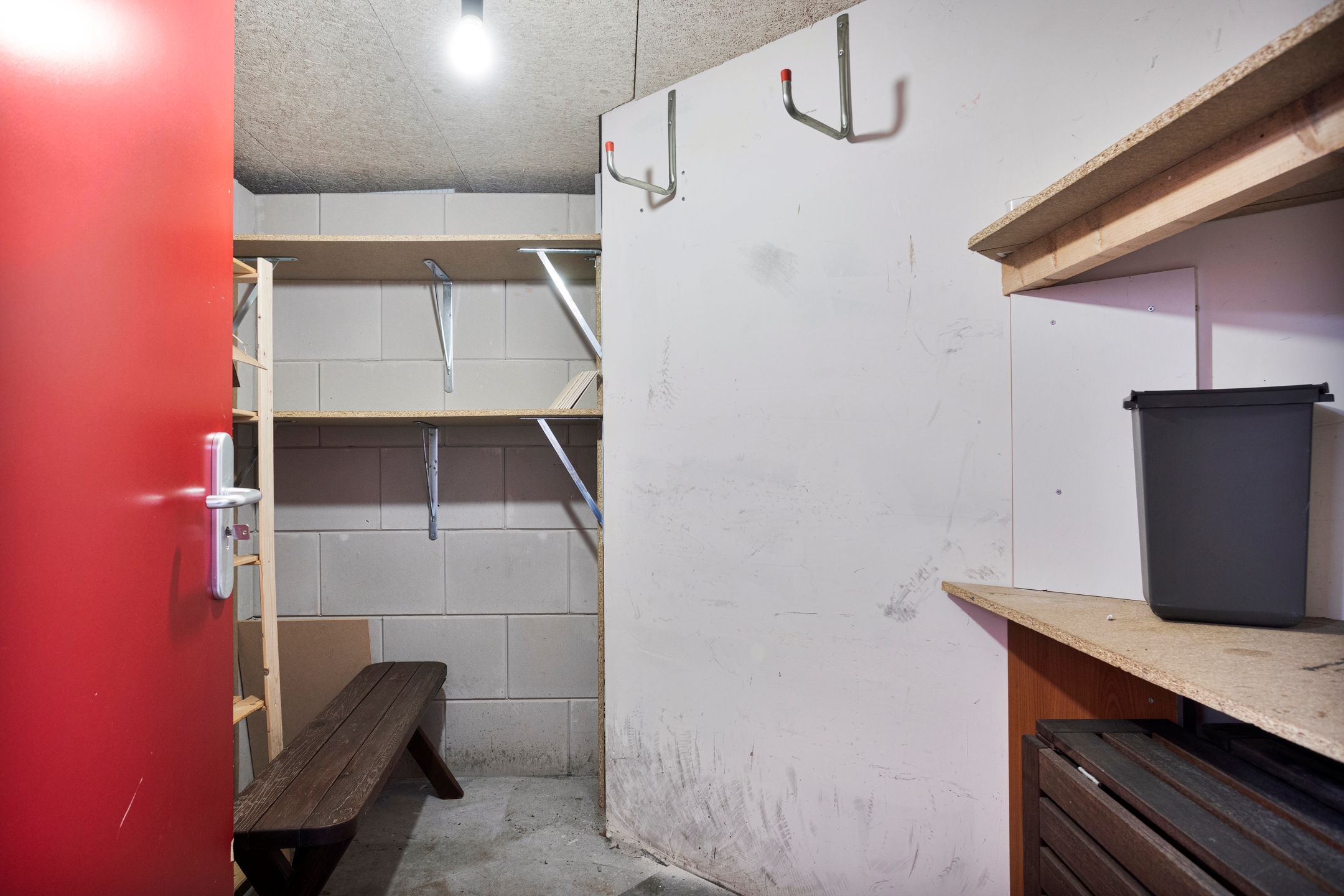 The apartment is located on the first floor of a well-maintained complex with an elevator. A private storage unit is available in the basement, suitable for bicycles and additional storage. Parking is possible through a municipal parking permit.