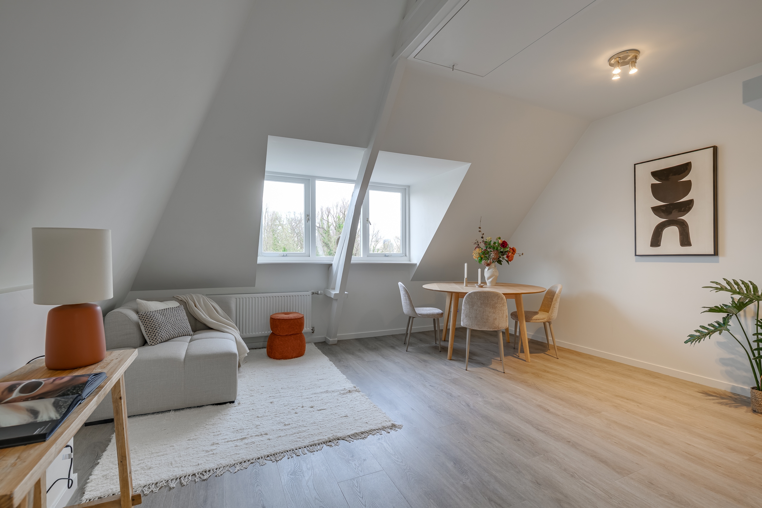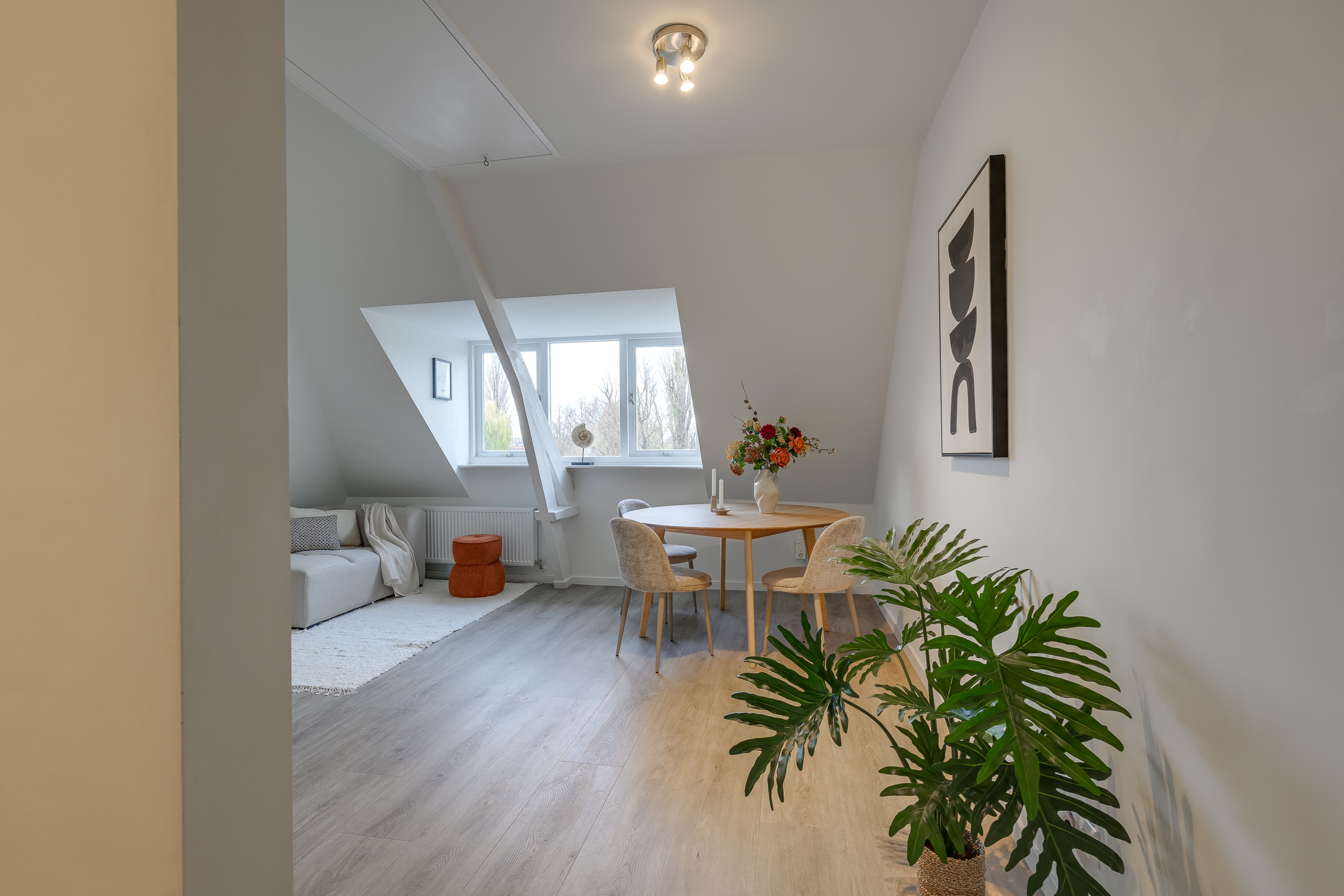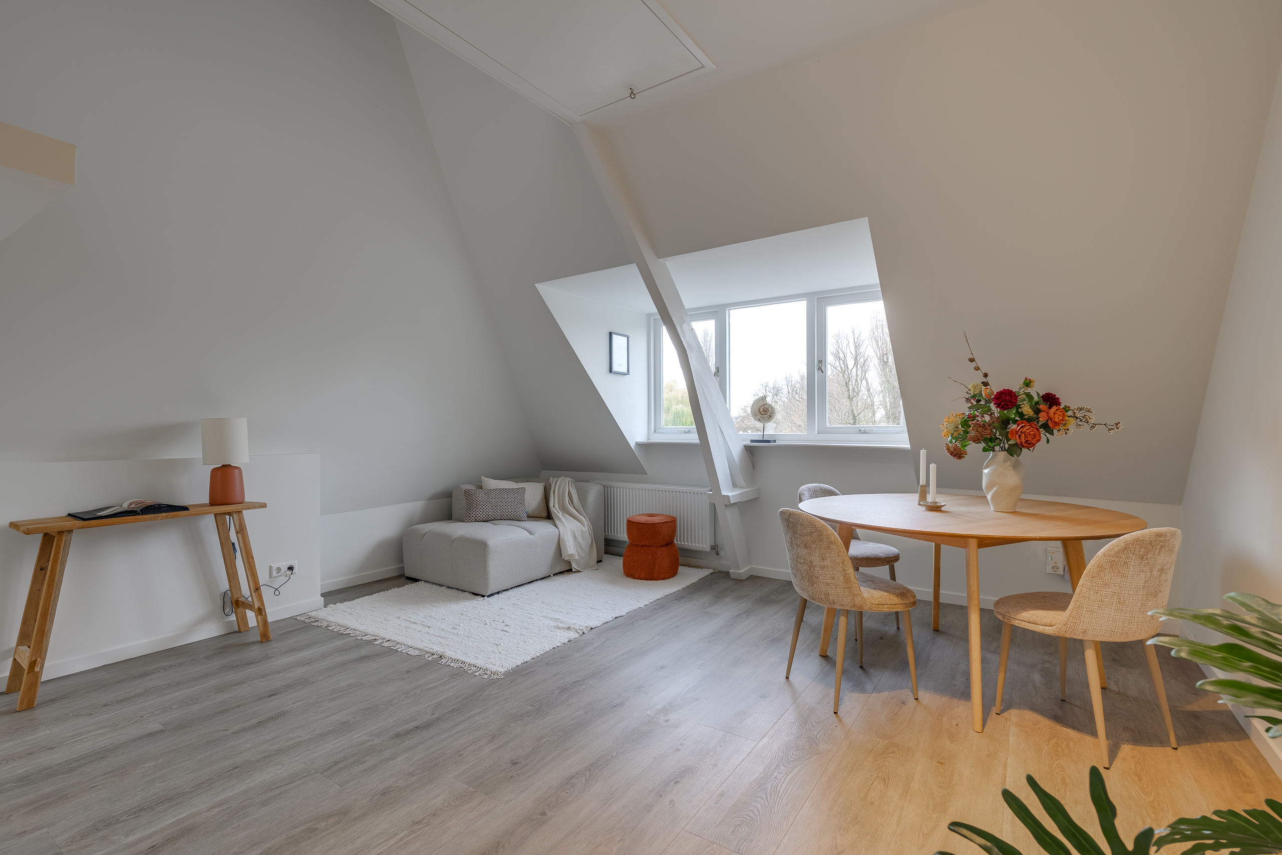 De woonkamer voelt direct warm en uitnodigend aan, met speelse daklijnen, een rustige afwerking en prettig lichtinval. Vanuit het raam kijk je uit op de iconische Zijlpoort — een van de oorspronkelijke stadspoorten van Leiden. Het centrum ligt letterlijk om de hoek: cafés, restaurants, winkels en andere voorzieningen bereik je binnen één minuut lopen.