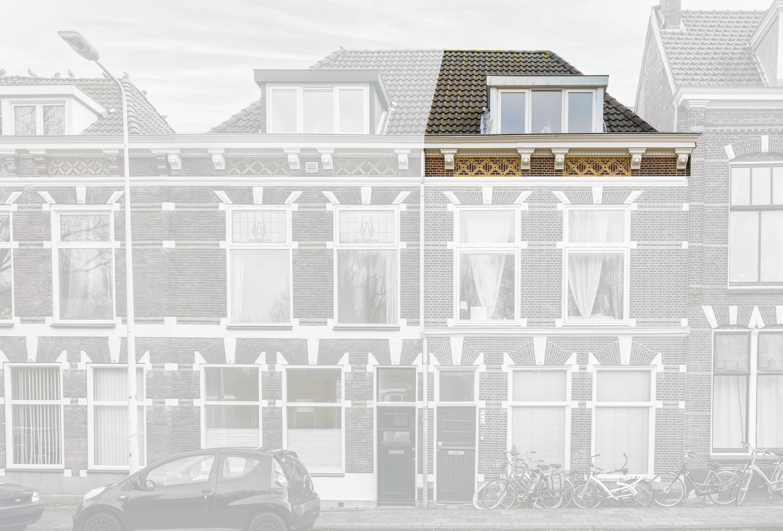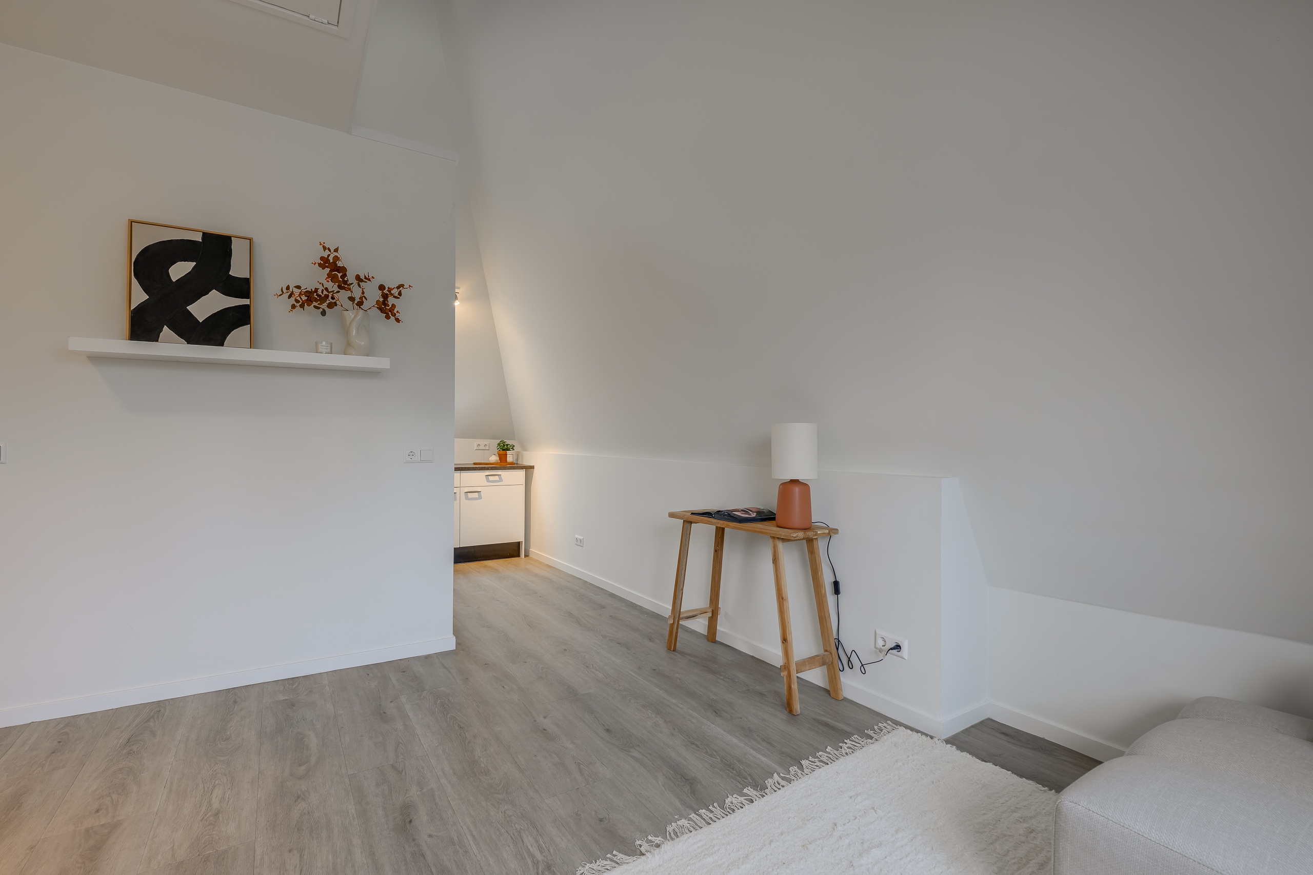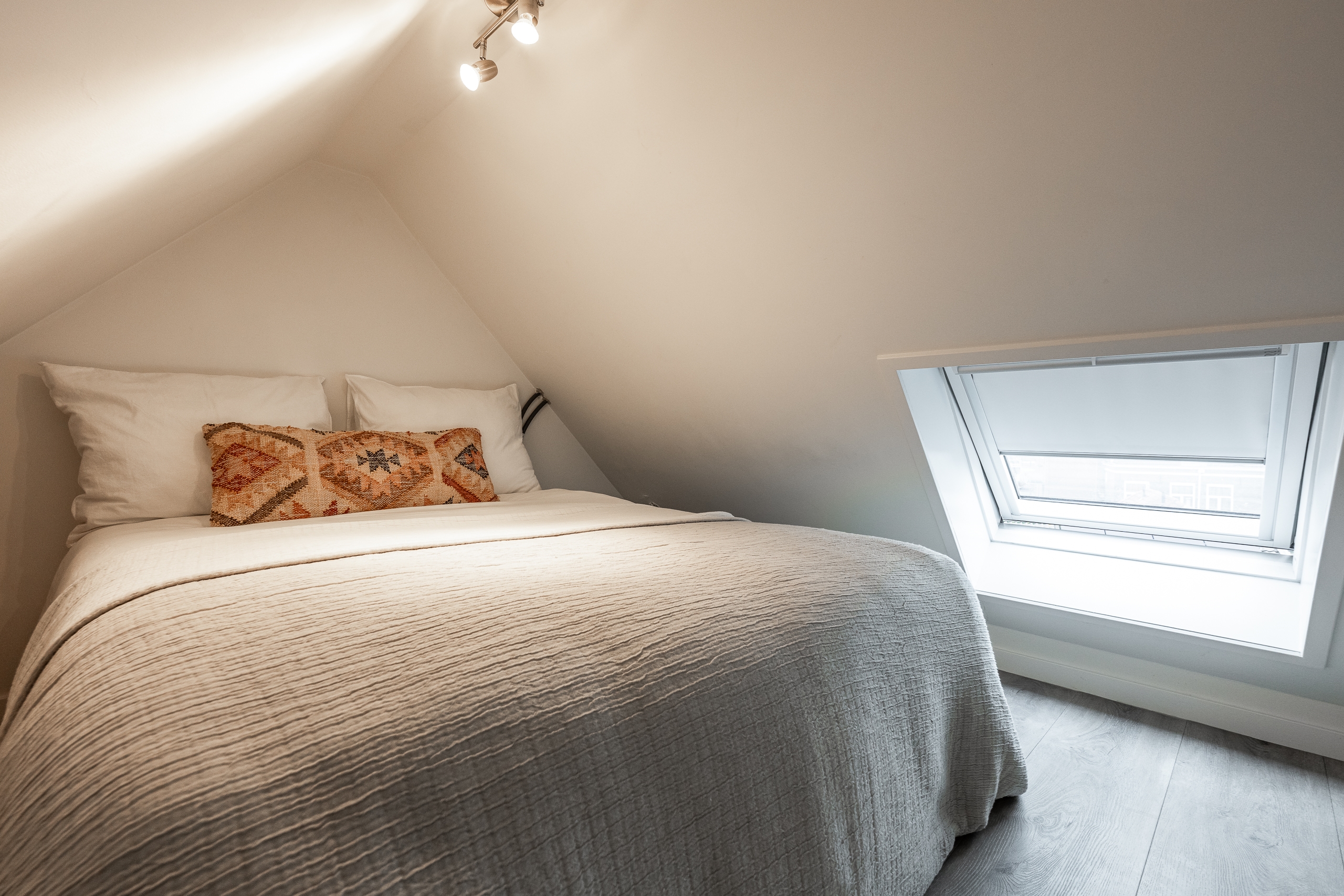 De woonkamer voelt direct warm en uitnodigend aan, met speelse daklijnen, een rustige afwerking en prettig lichtinval. Vanuit het raam kijk je uit op de iconische Zijlpoort — een van de oorspronkelijke stadspoorten van Leiden. Het centrum ligt letterlijk om de hoek: cafés, restaurants, winkels en andere voorzieningen bereik je binnen één minuut lopen.