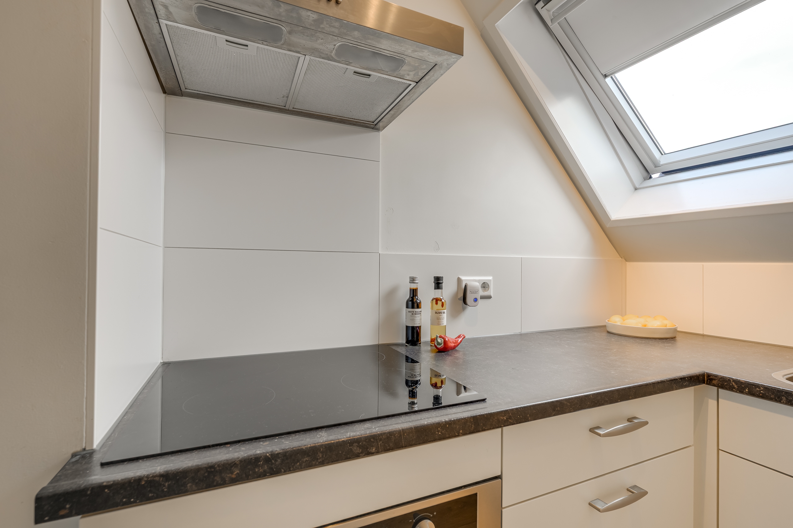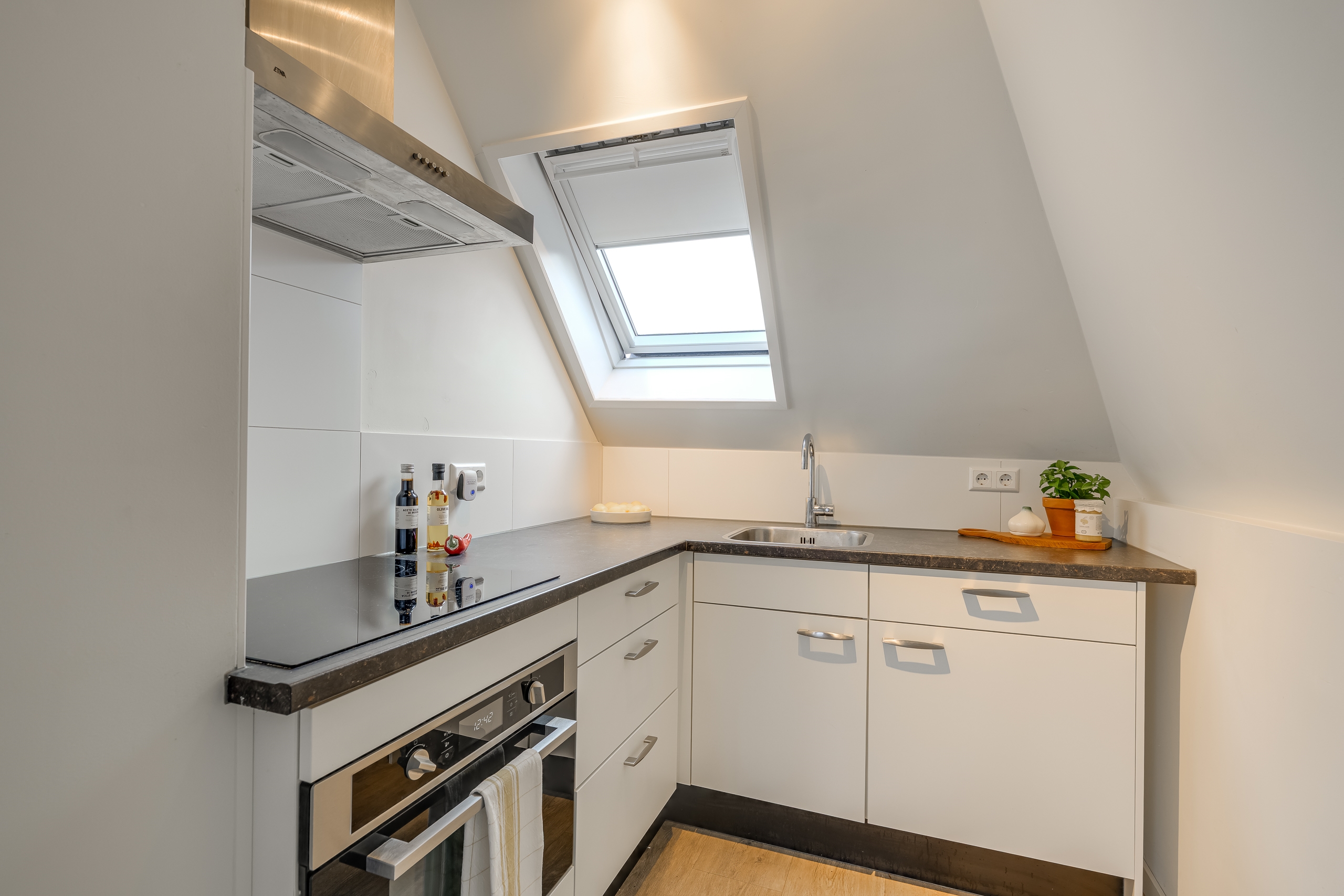 De open keuken is praktisch ingedeeld en voorzien van diverse inbouwapparatuur, waaronder een inductiekookplaat, oven en afzuigkap. Er is voldoende ruimte voor een gezellige eethoek, perfect voor ontbijt of diner met uitzicht.