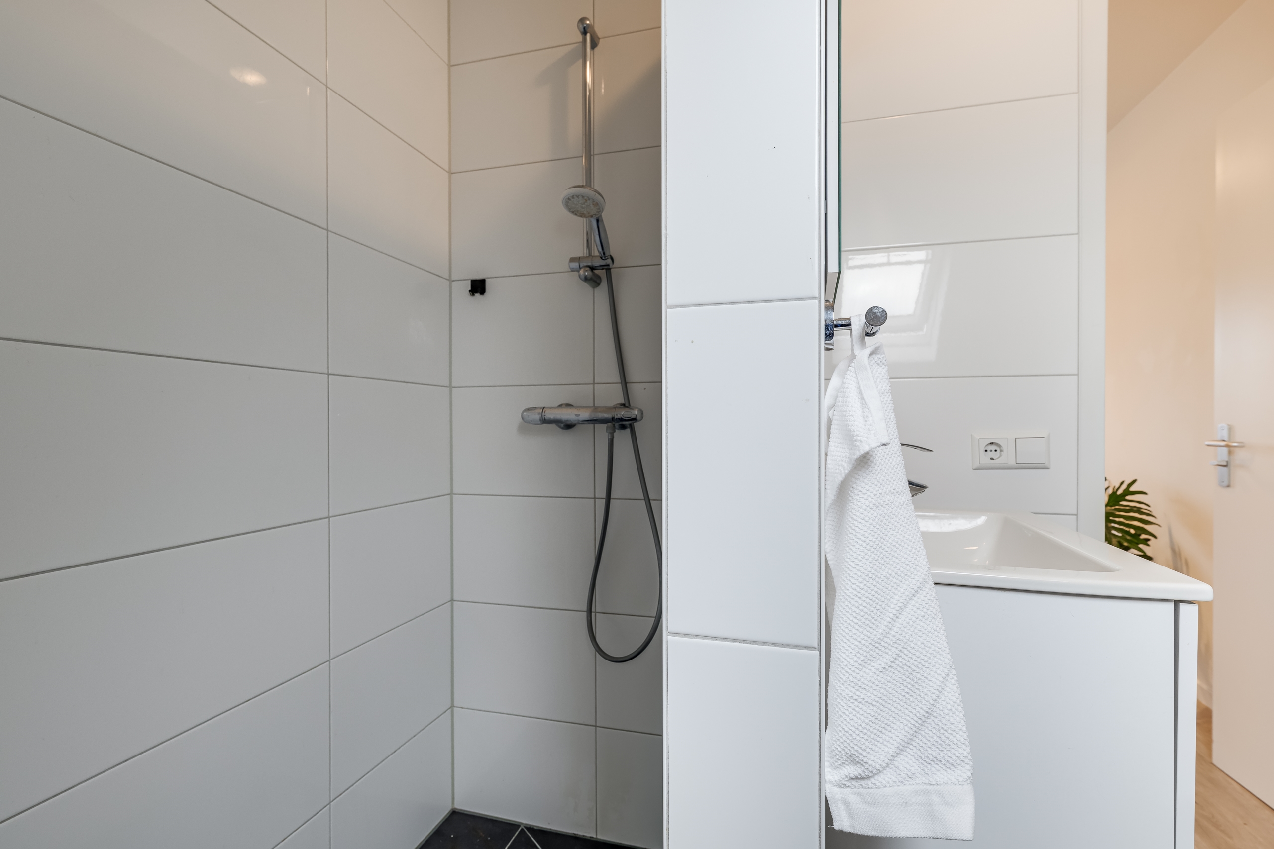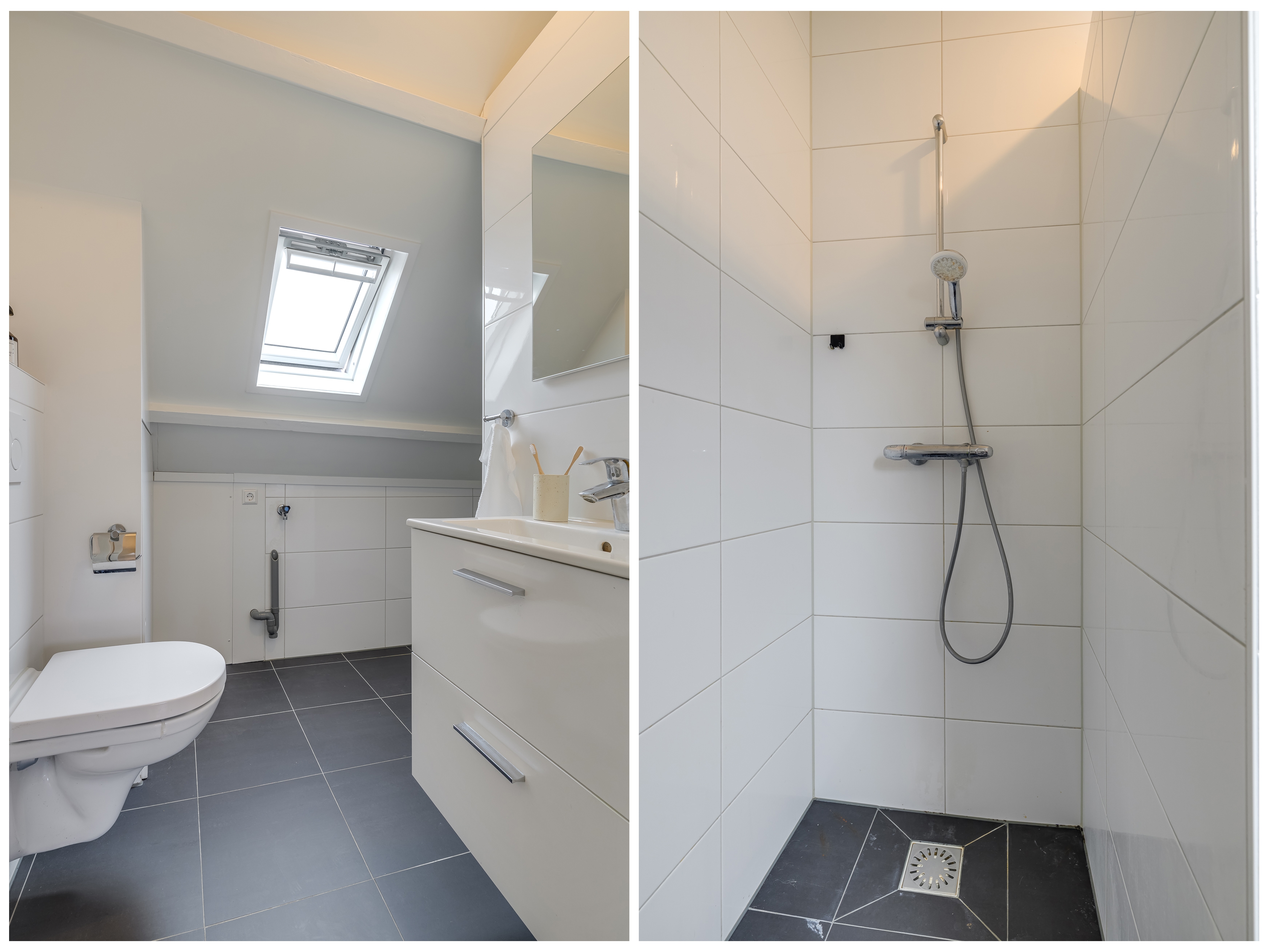 Aan de achterzijde bevindt zich de moderne badkamer, uitgerust met een douche, toilet, wastafelmeubel en een dakraam voor natuurlijke ventilatie.