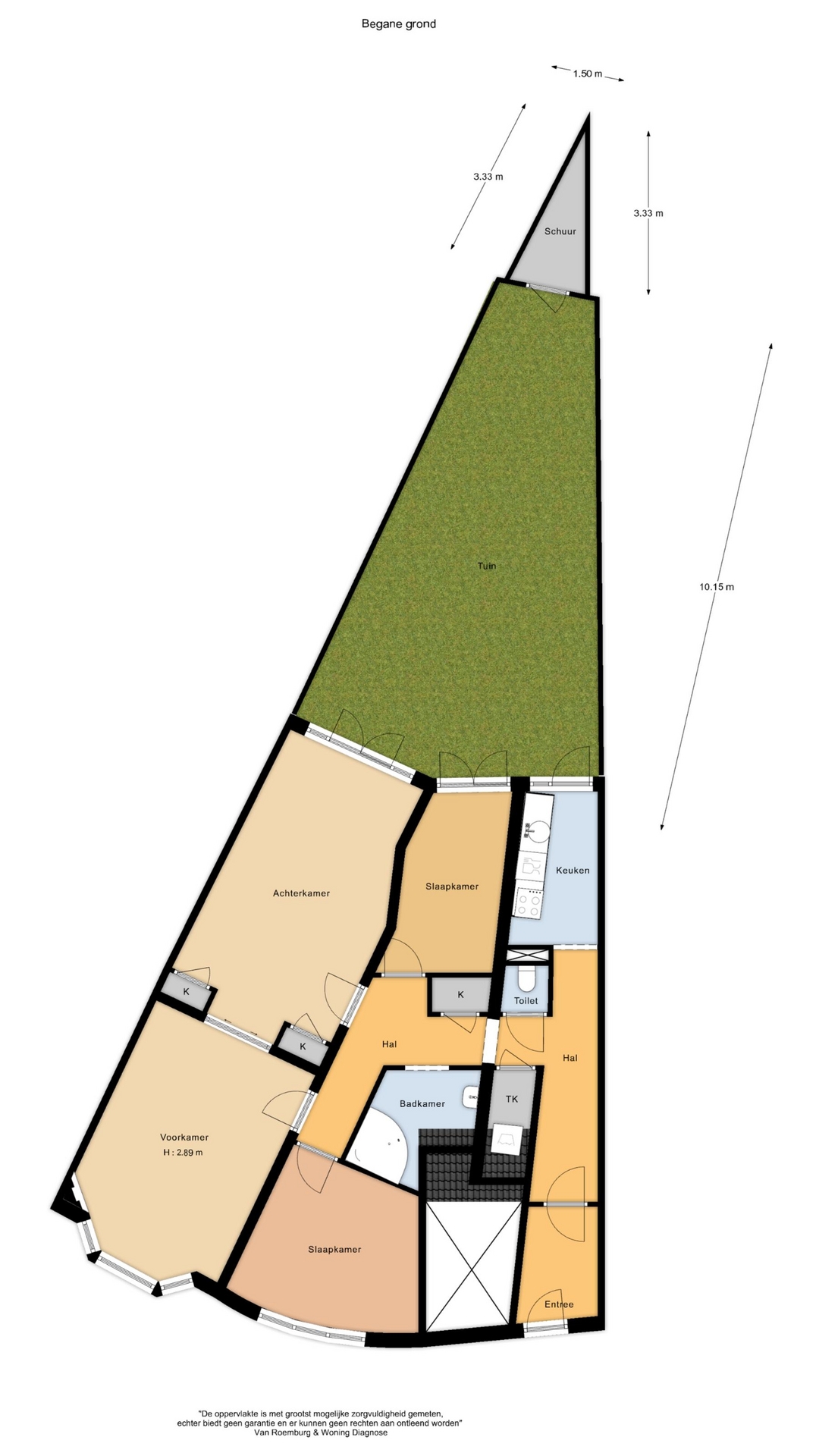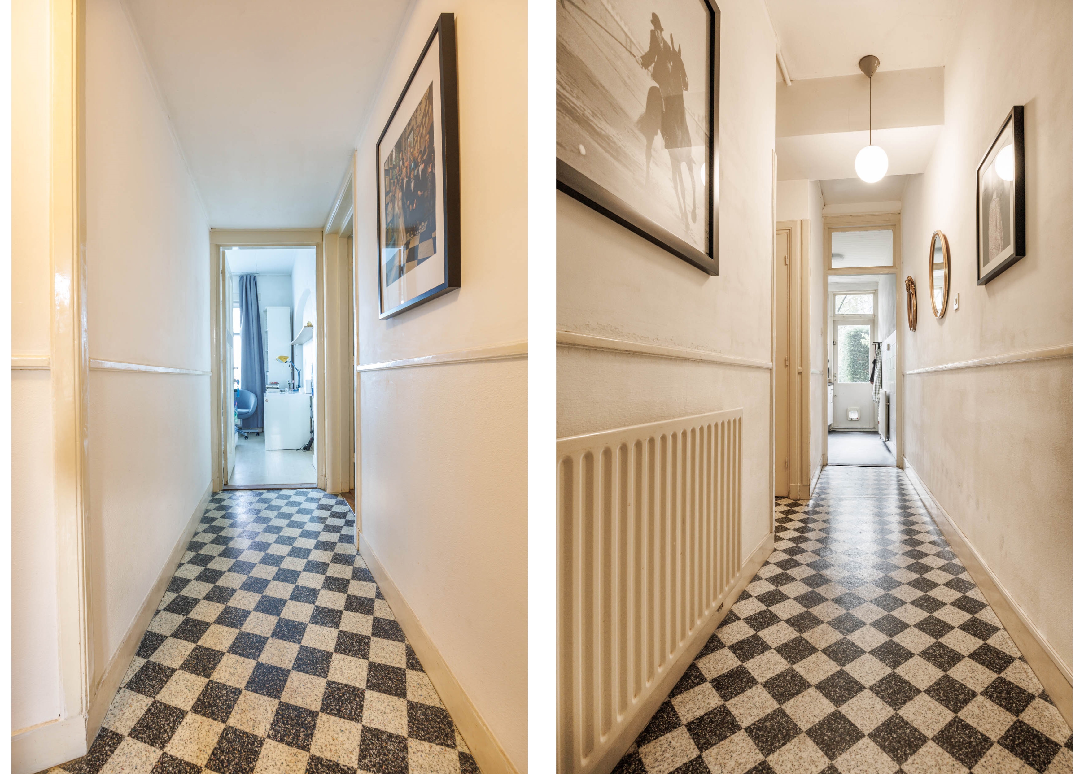 Via de gezamenlijke entree kom je binnen in de hal die toegang biedt tot de verschillende vertrekken. Aan de achterzijde bevindt zich de keuken, voorzien van een oven, gasfornuis, afzuigkap en een losse vaatwasser. In de hal vind je tevens een separaat toilet en een afgesloten kast met wasmachineaansluiting.