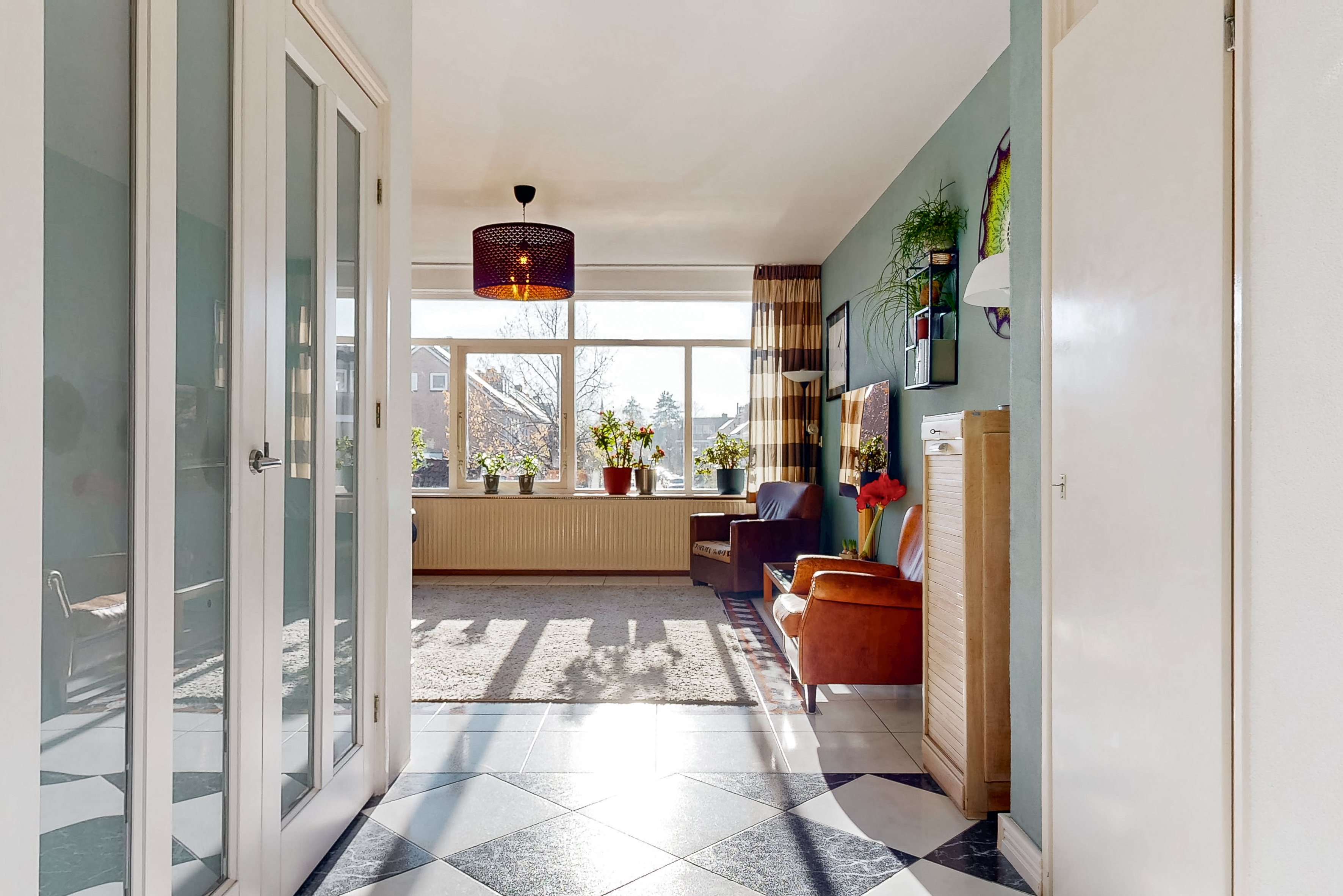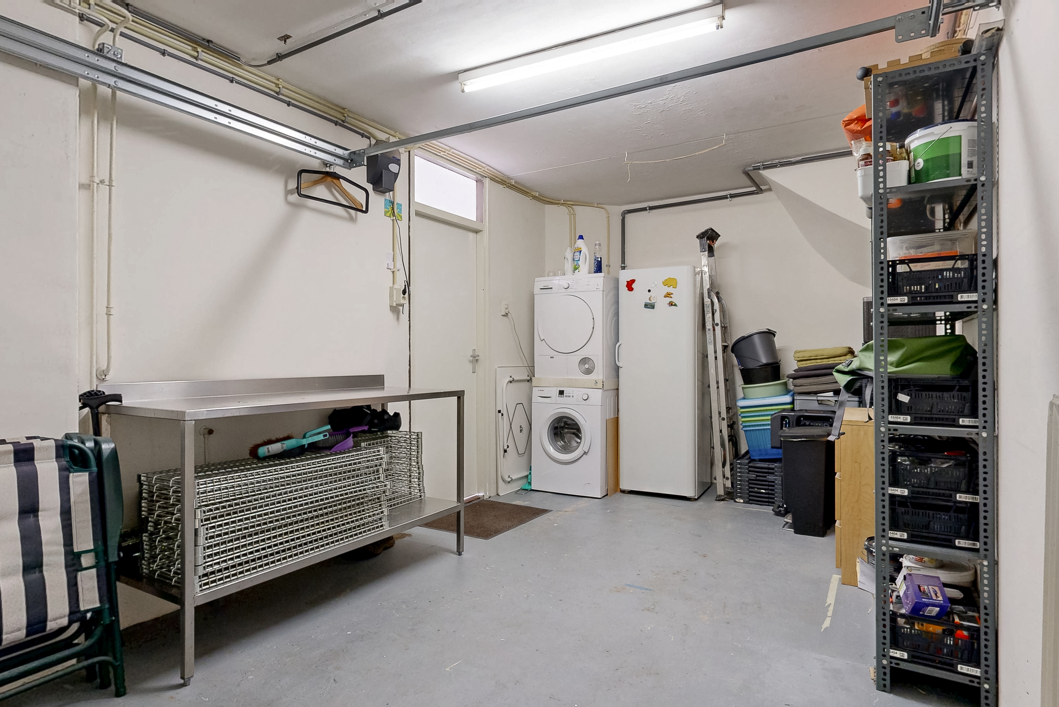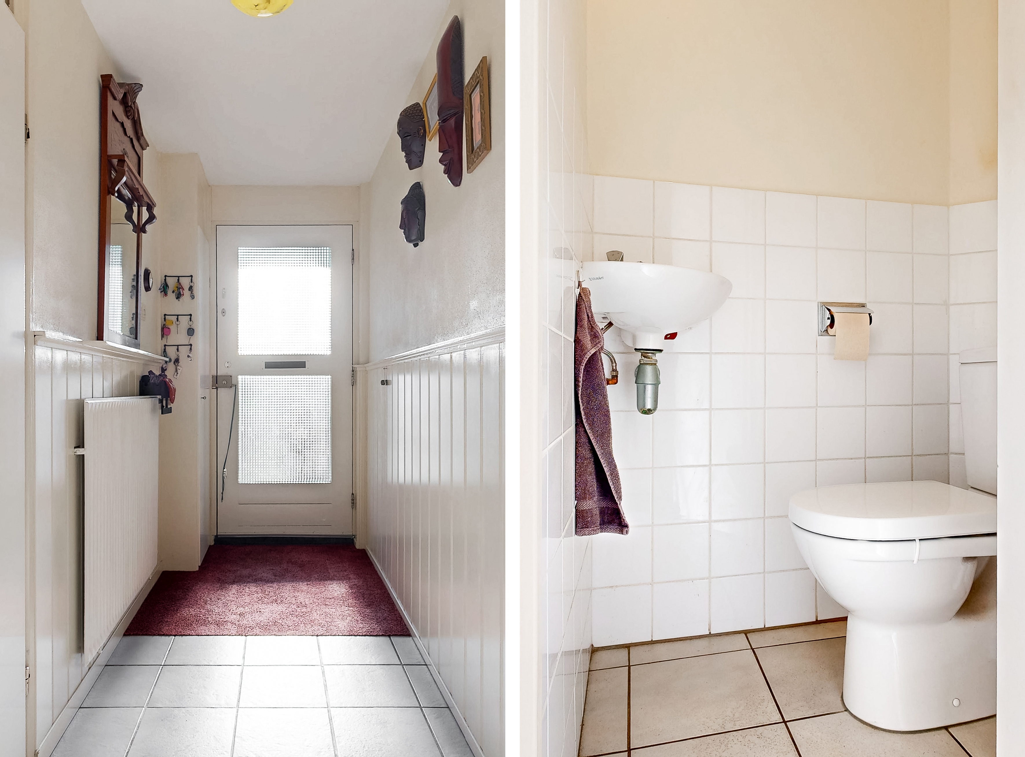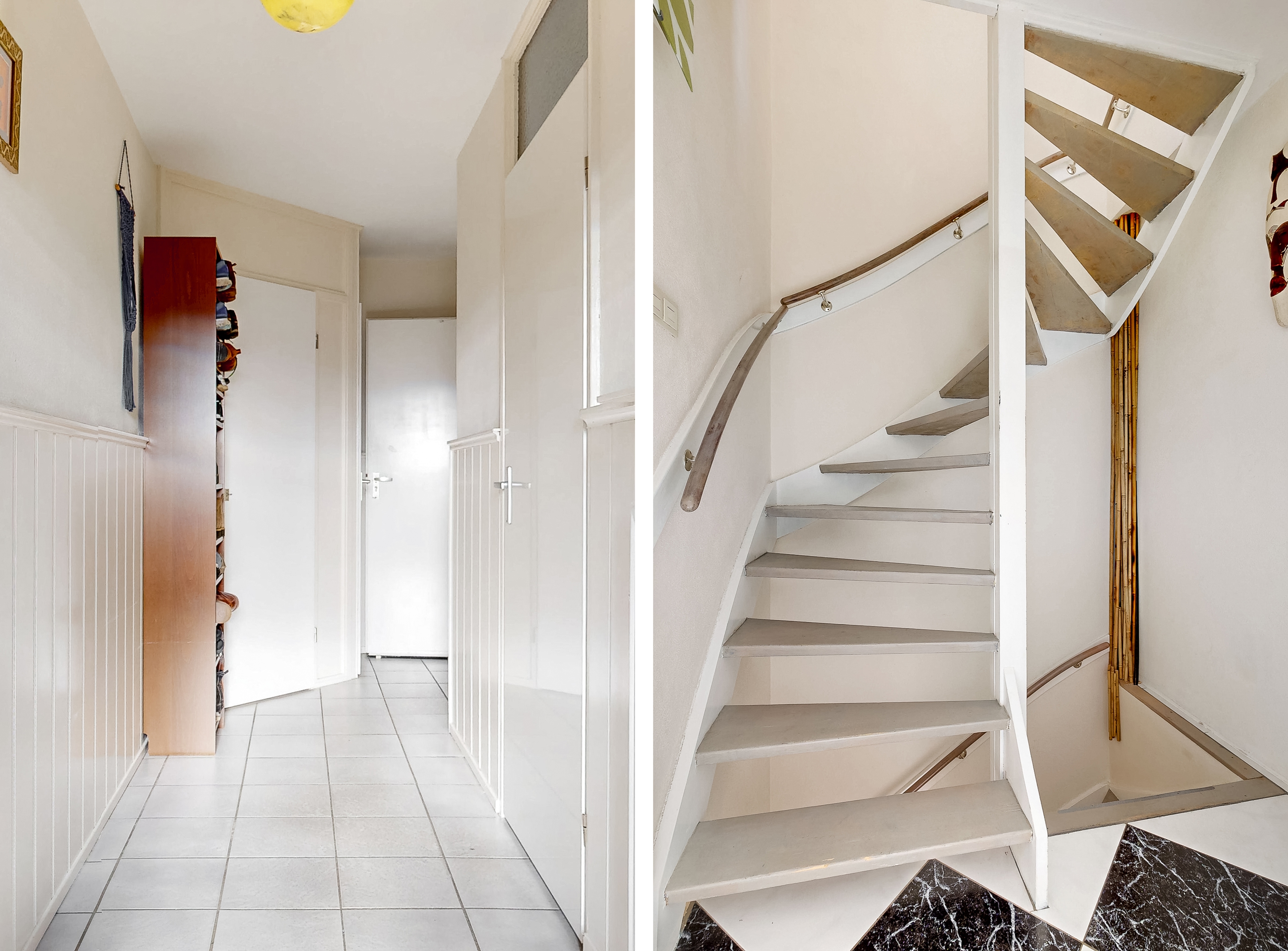 The spacious driveway takes you to the garage and the entrance of the house. Access to the house via the garage with electric door or via the front door. Entrance, hallway with meter cupboard, hall cupboard, toilet, a spacious bedroom, bedroom and access to the spacious backyard. You reach the living floor via a staircase.