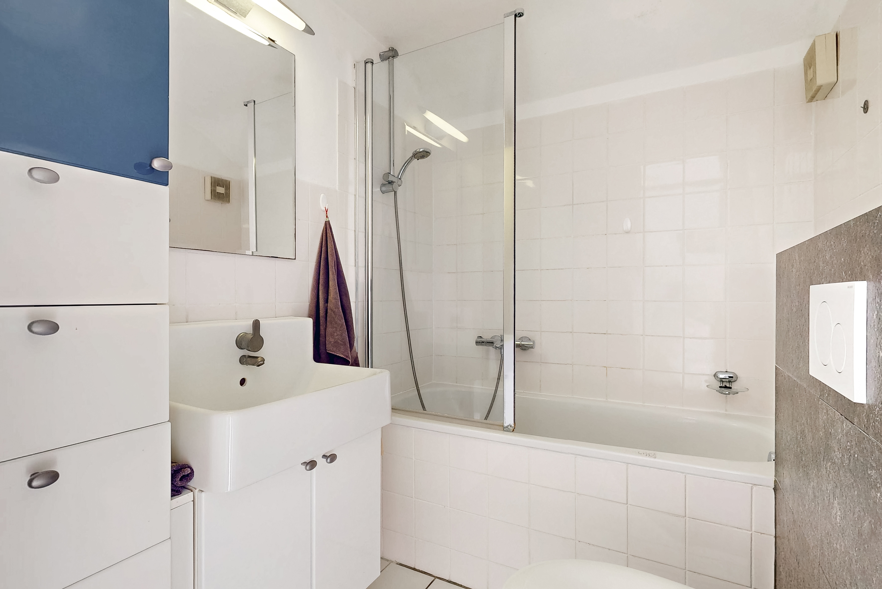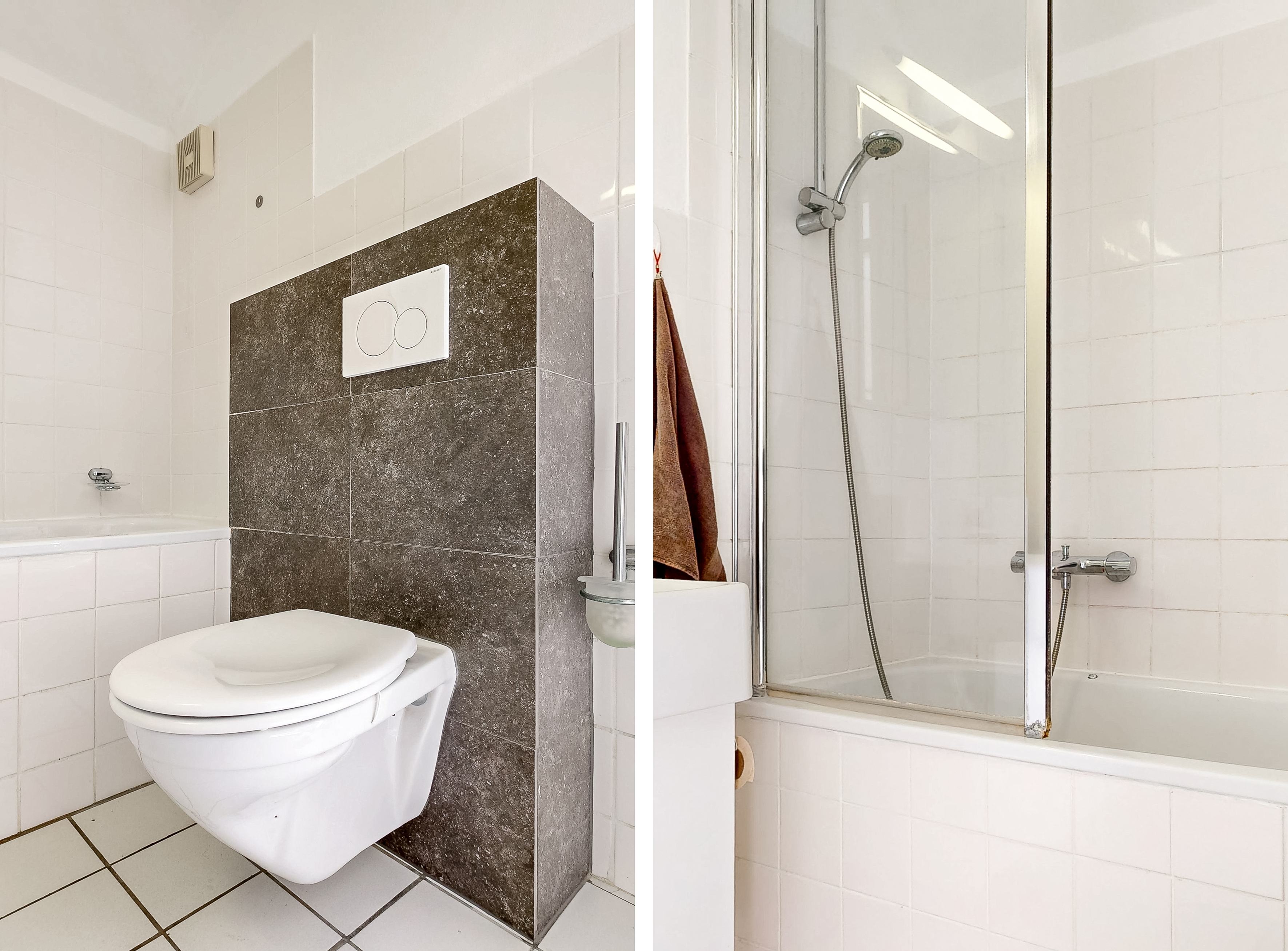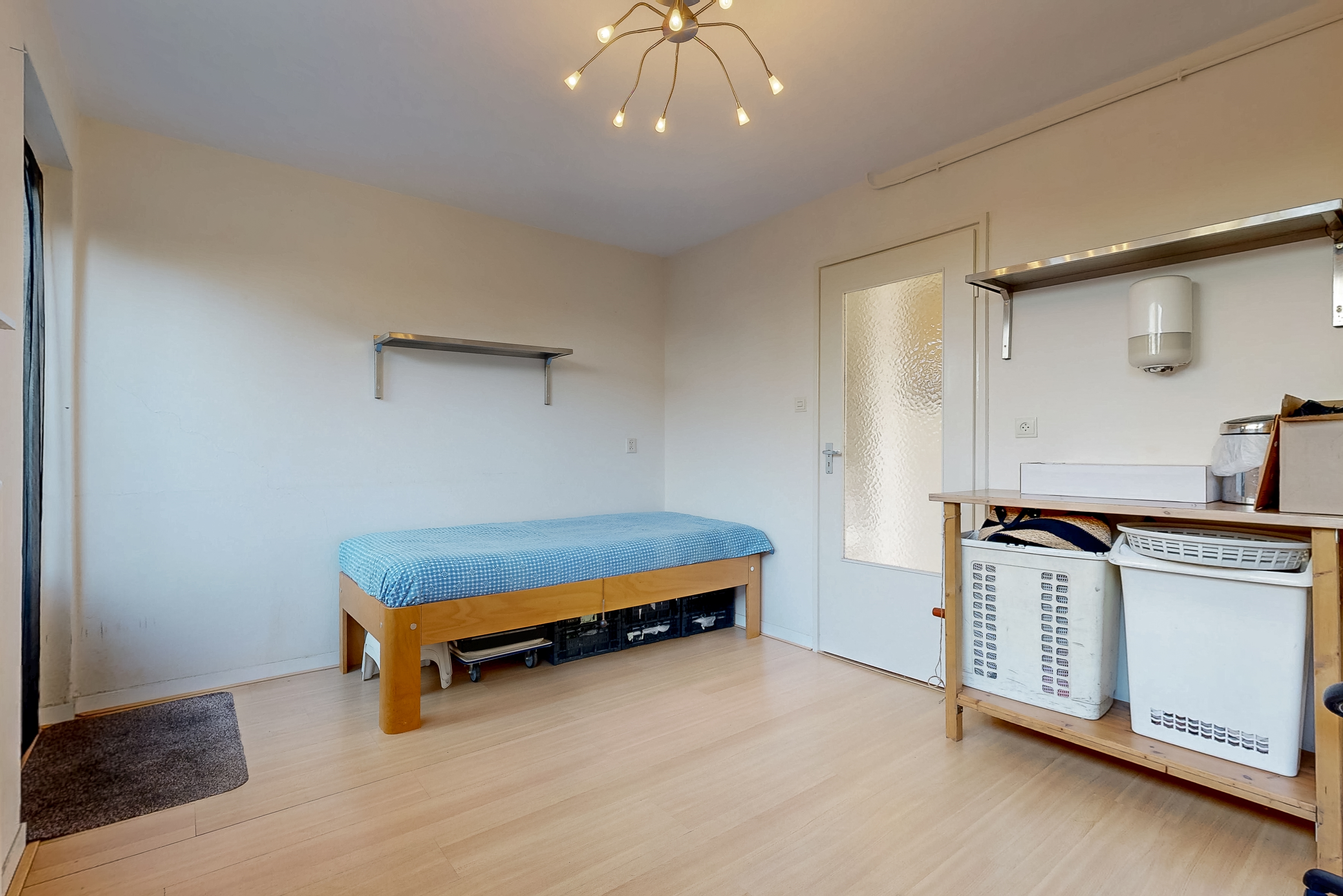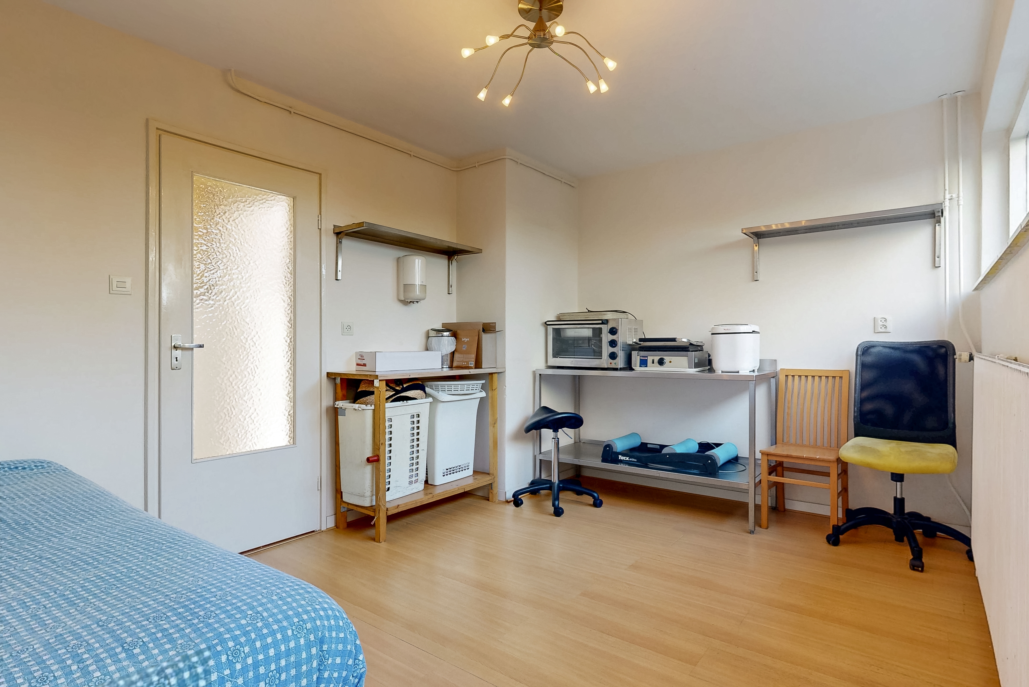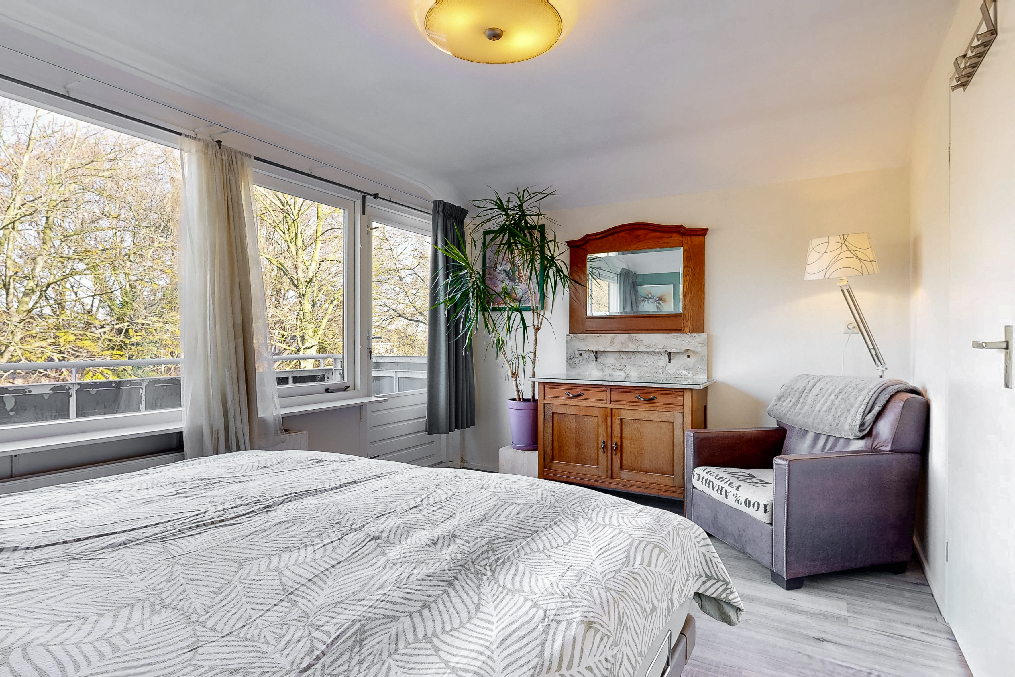 Landing with access to 2 wonderfully spacious bedrooms and the bathroom. The neat bathroom has a sink with furniture, a bath with shower and the second toilet. The large bedroom at the rear gives access to the balcony. The current residents have turned the 2 bedrooms at the front into one large one. This is quite easy to return to its original state. Through a hatch in the ceiling you can access the spacious attic (entire length of the house) of no less than 36 m2, where there is more than enough space for your suitcases and Christmas items.