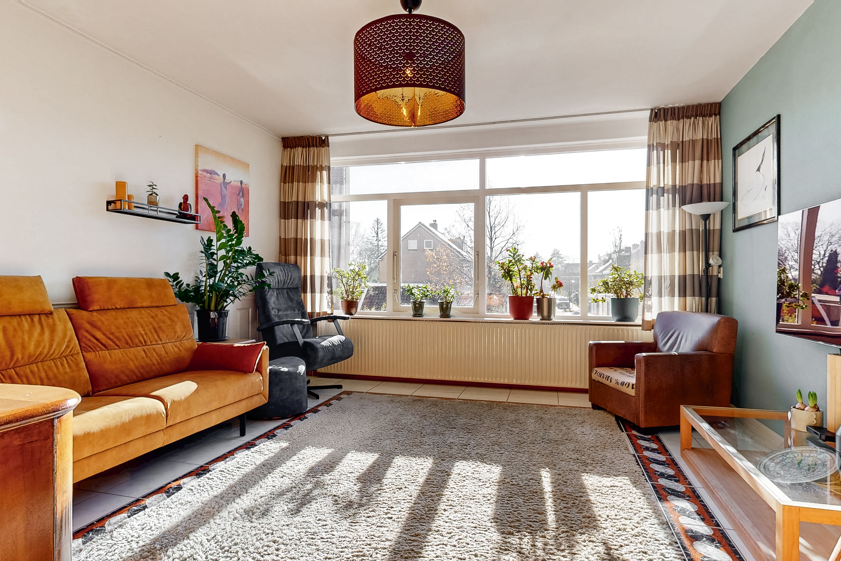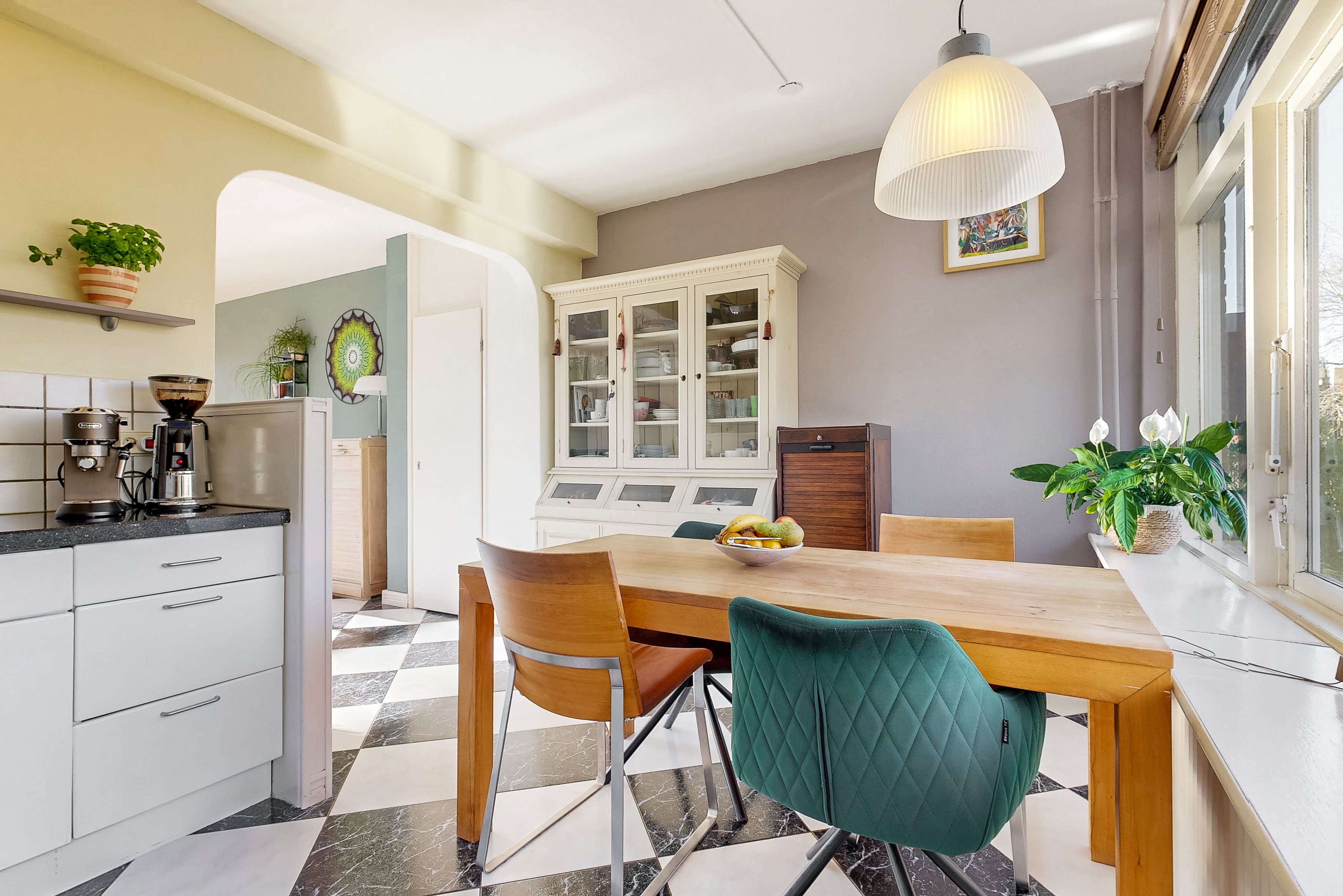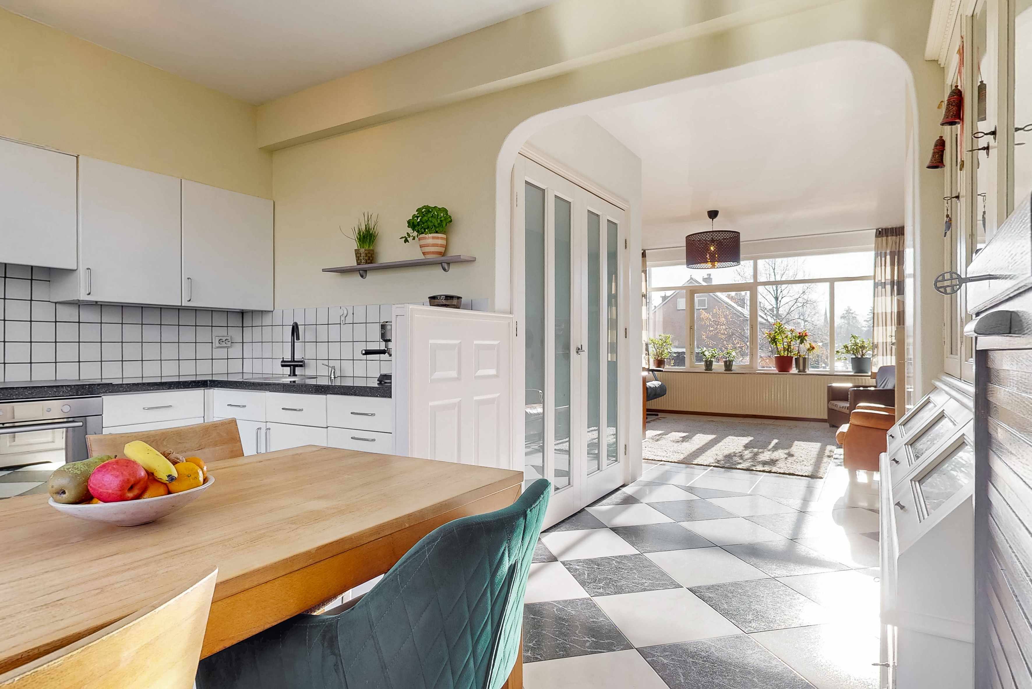As mentioned, the cozy living room is located on the first floor and therefore offers a lot of privacy and a nice view. It has large windows with lots of light. From the living room you have access to the open kitchen. The nice kitchen is somewhat dated but still functions properly and is equipped with various (built-in) appliances, such as an induction hob with extractor hood, a refrigerator, dishwasher and an oven.