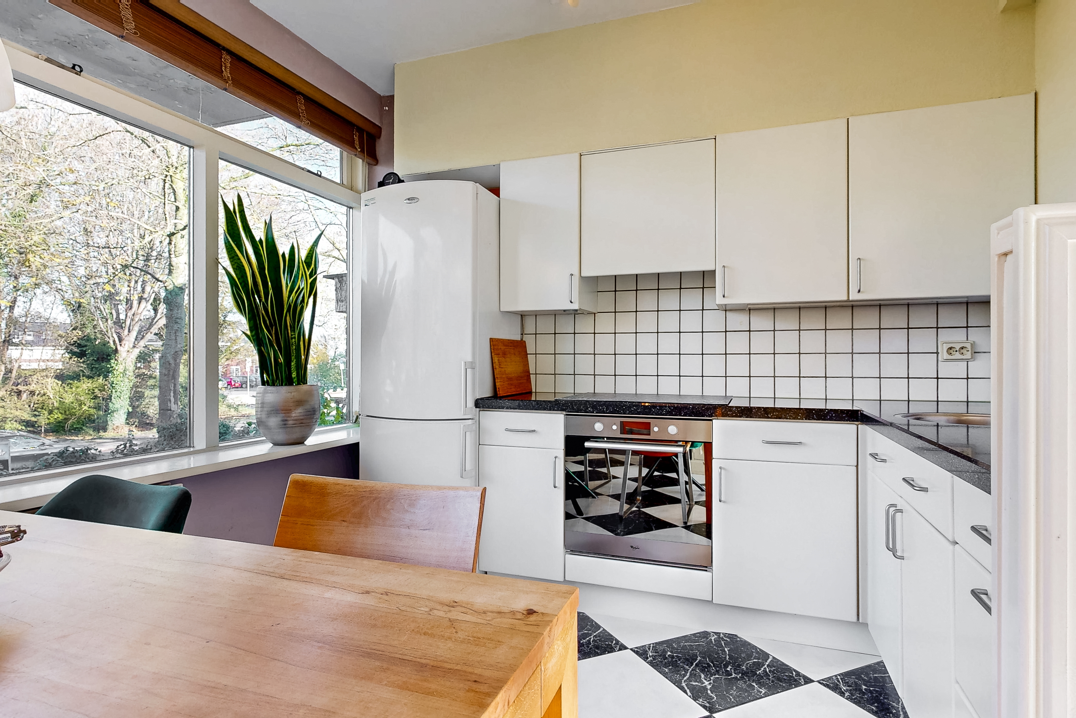De gezellige woonkamer is zoals gezegd op de verdieping gelegen en geeft daarom veel privacy en een leuk uitzicht. Het is voorzien van grote raampartijen met veel lichtinval. Vanuit de woonkamer heeft u toegang tot de open keuken. De fijne keuken is wat gedateerd maar functioneert nog naar behoren en is voorzien van diverse (inbouw)apparatuur, zoals een inductie kookplaat met afzuigkap, een koelkast, vaatwasser en een oven.