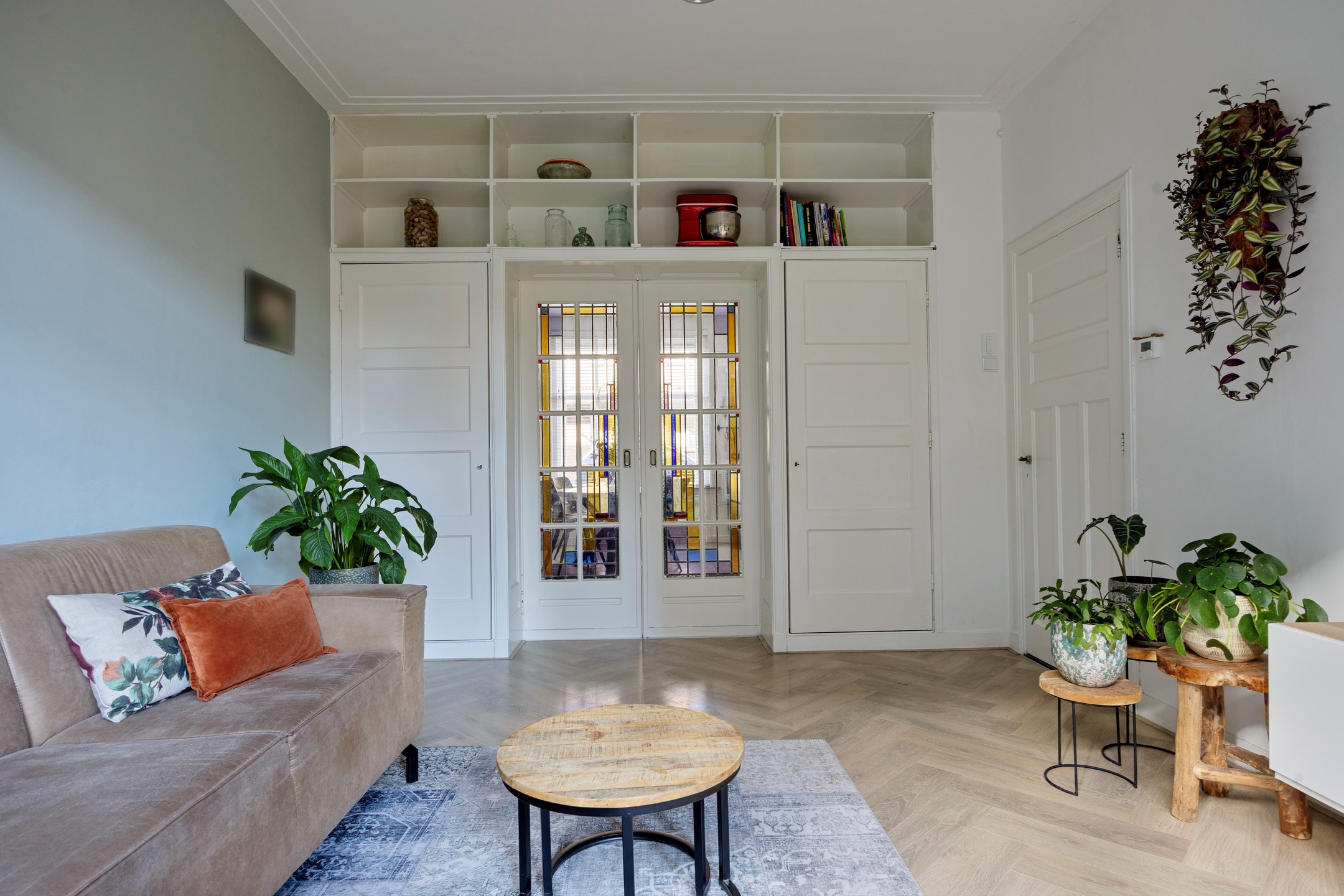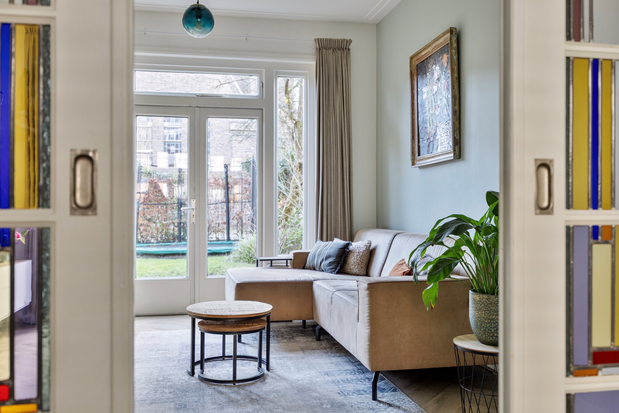 De woning wordt betreden via een ruime hal met karakteristieke granito vloer, meterkast en twee praktische trapkasten. Aan de rechterzijde van de hal bevindt zich het sfeervolle en-suite woongedeelte. De eetkamer aan de voorzijde beschikt over grote ramen die zorgen voor een prettige lichtinval en een marmeren schouw die de ruimte extra karakter geeft. De originele en-suite deuren met glas-in-lood verbinden deze ruimte met de woonkamer aan de achterzijde. Hier zorgen openslaande deuren voor een directe verbinding met de tuin.