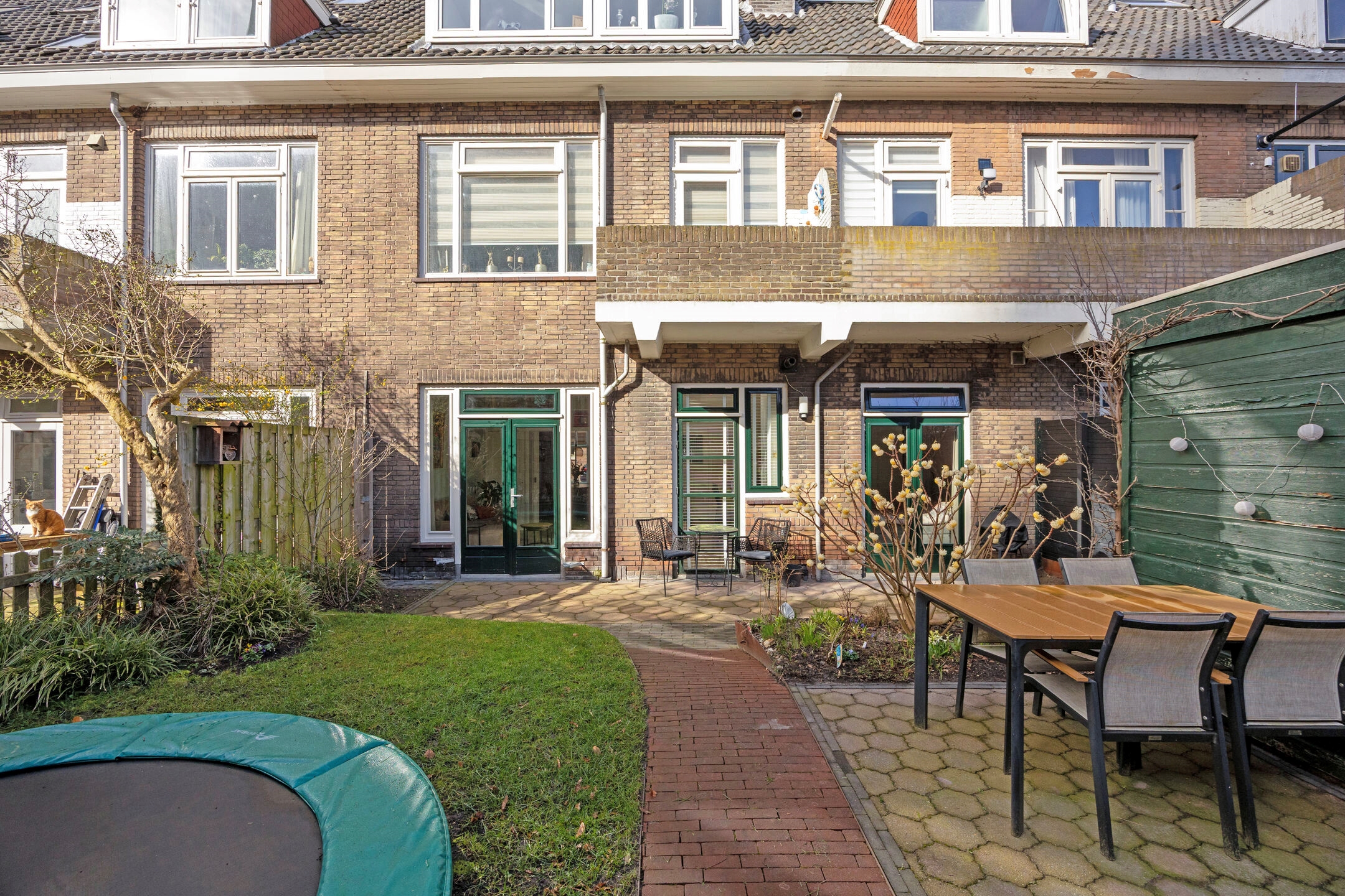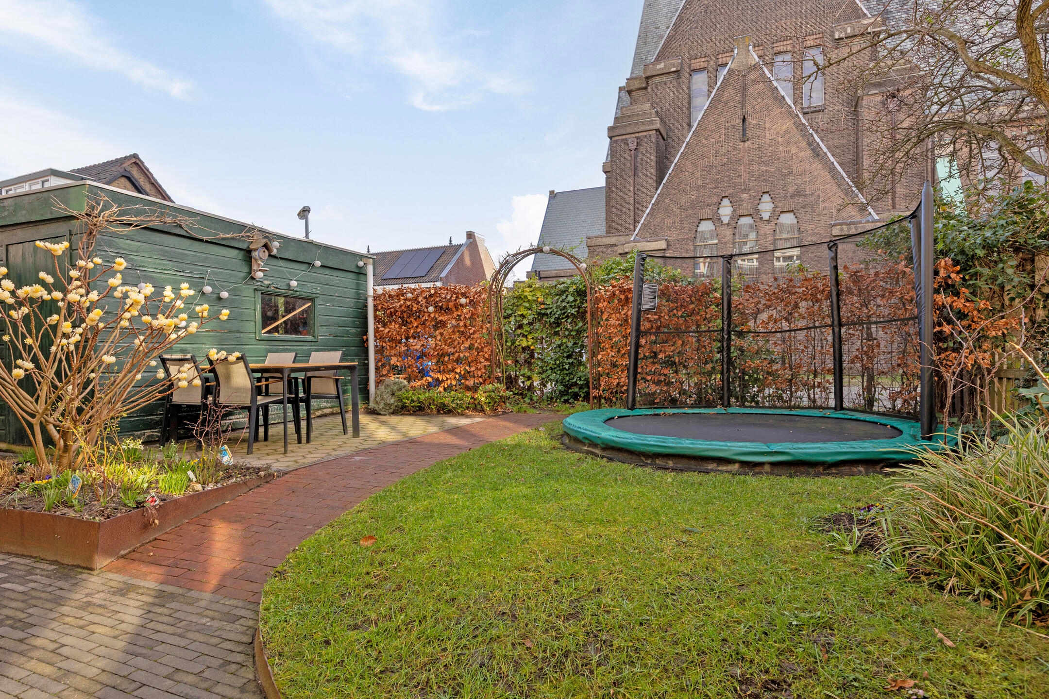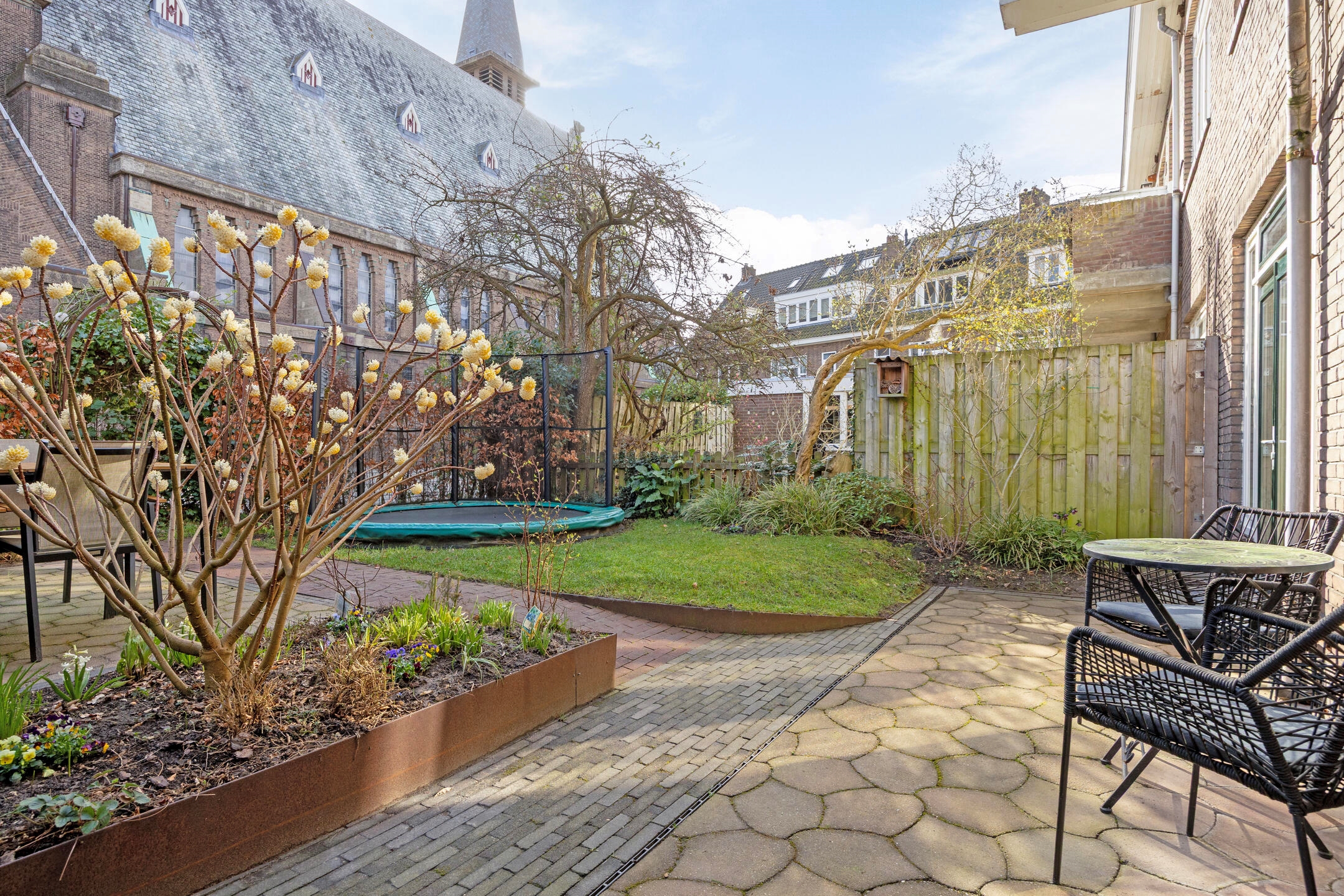 De achtertuin is zonder twijfel een van de blikvangers van de woning. Met circa 78 m² is dit een uitzonderlijk ruime stadstuin, gelegen op het oosten en over de volledige breedte van de woning. De tuin biedt gedurende de dag zowel zon als schaduw en heeft een bijzonder uitzicht op de monumentale Sint Josephkerk. Achterin de tuin staat een houten berging met betonnen vloer en elektra. Via de afgesloten achterom aan de Anna Paulownastraat is de tuin ook van buitenaf bereikbaar.