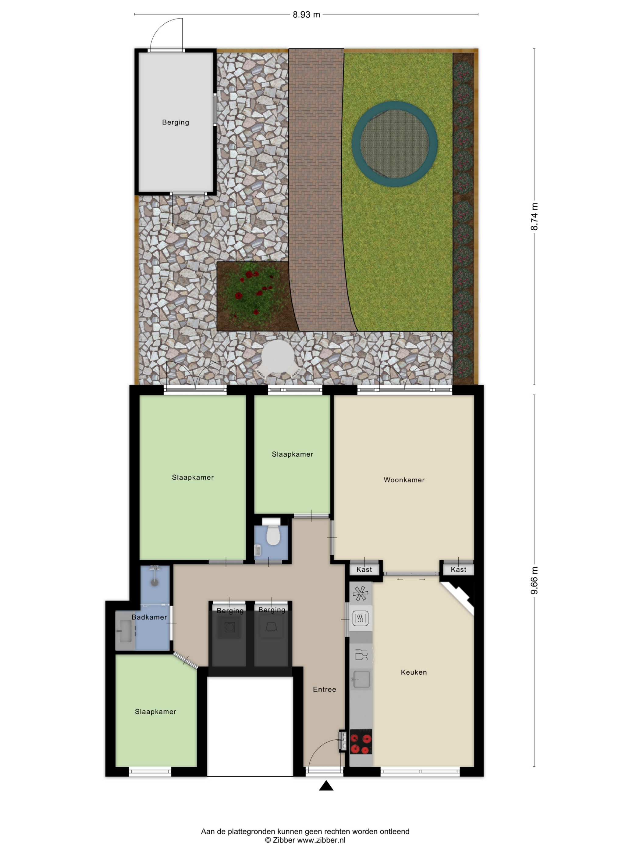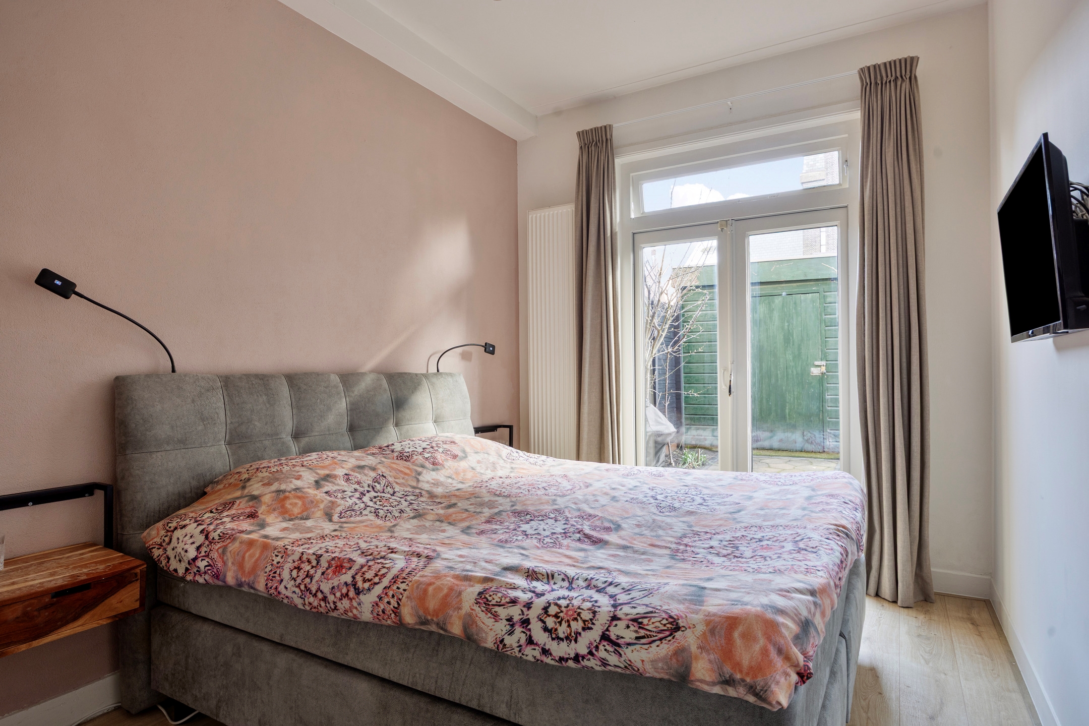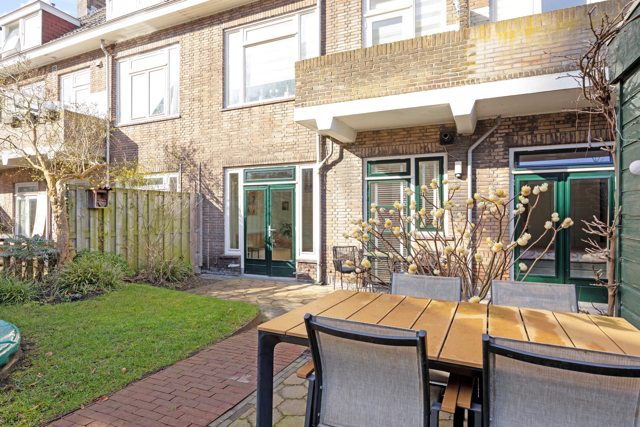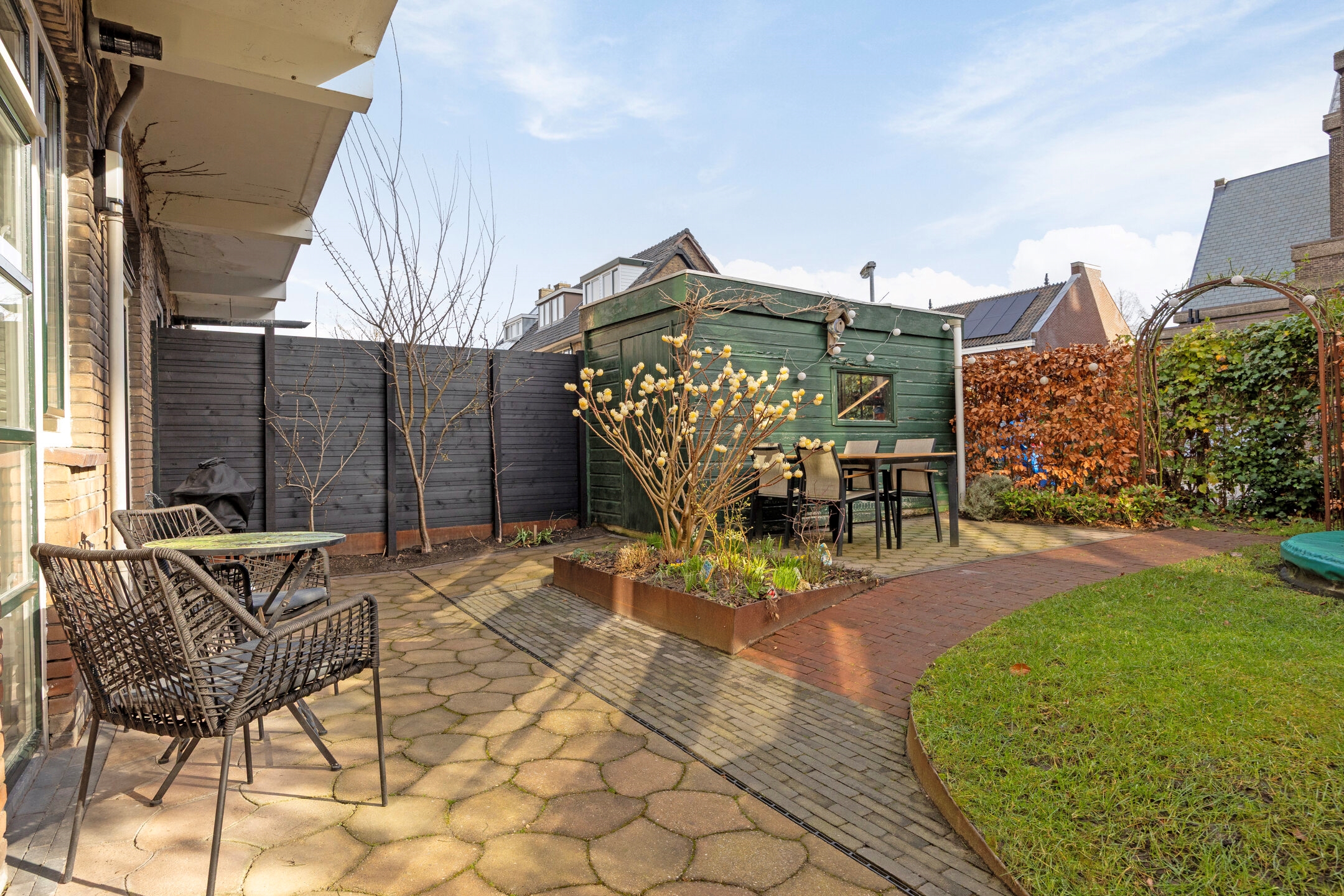 De achtertuin is zonder twijfel een van de blikvangers van de woning. Met circa 78 m² is dit een uitzonderlijk ruime stadstuin, gelegen op het oosten en over de volledige breedte van de woning. De tuin biedt gedurende de dag zowel zon als schaduw en heeft een bijzonder uitzicht op de monumentale Sint Josephkerk. Achterin de tuin staat een houten berging met betonnen vloer en elektra. Via de afgesloten achterom aan de Anna Paulownastraat is de tuin ook van buitenaf bereikbaar.