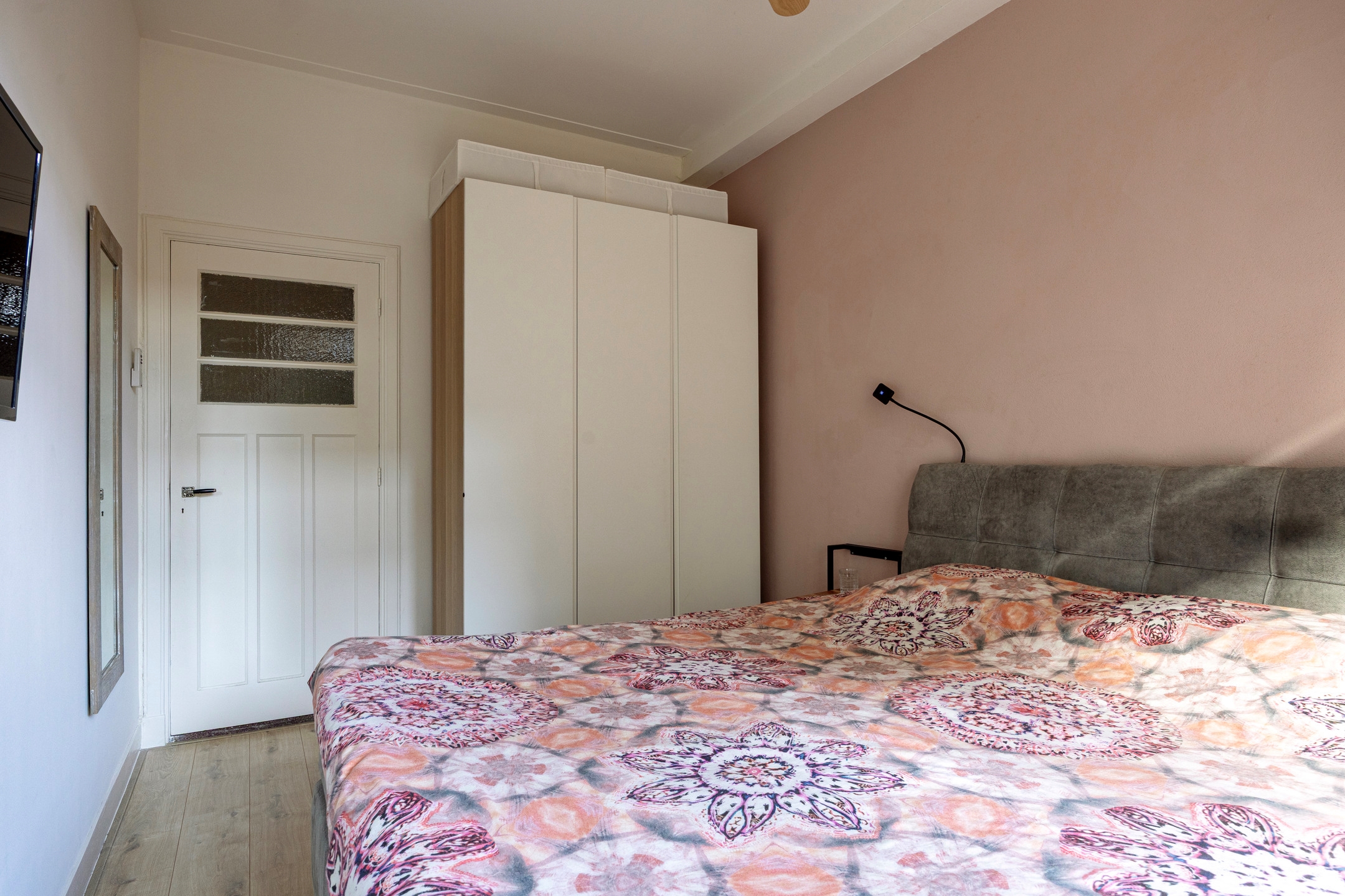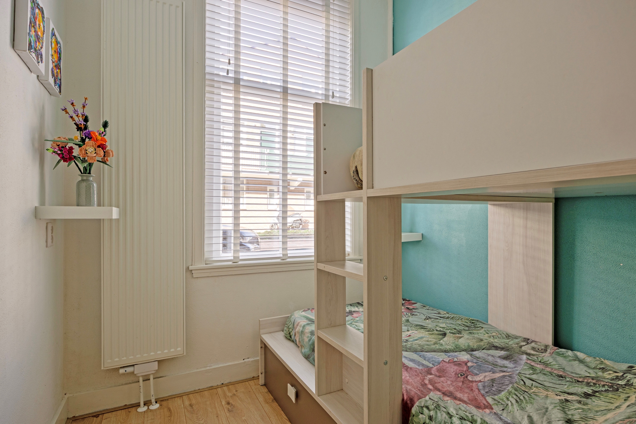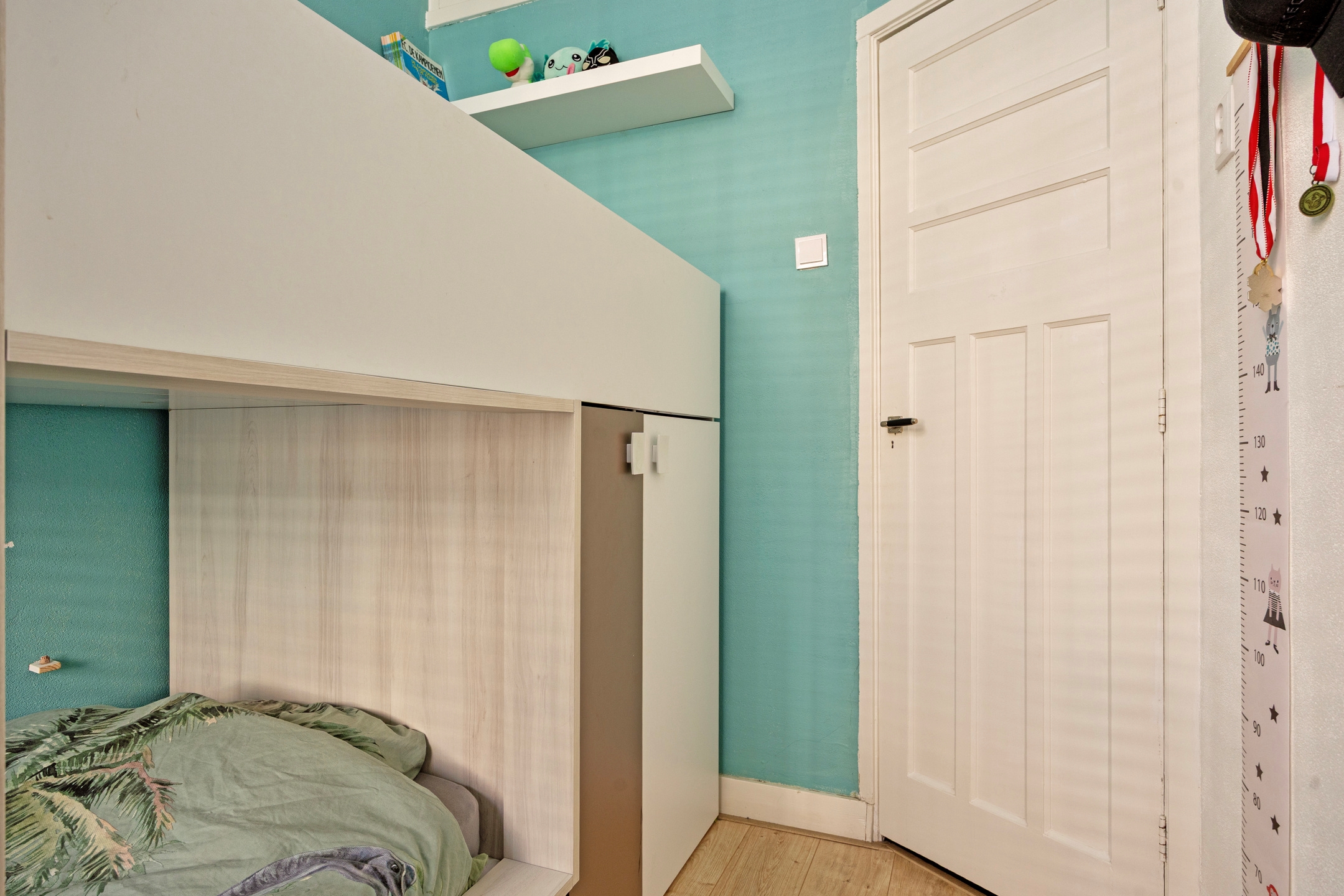 Via de hal zijn de overige vertrekken bereikbaar. Aan de achterzijde ligt de grootste slaapkamer met uitzicht op de tuin, terwijl een tweede slaapkamer zich aan de voorzijde bevindt. Daarnaast is er een derde slaapkamer, ontstaan door het verplaatsen van de keuken. Boven de voorste slaapkamer en de badkamer bevindt zich een praktische vliering voor extra bergruimte. De badkamer is in 2020 vernieuwd en heeft een frisse uitstraling met een inloopdouche en een brede wastafel met meubel.