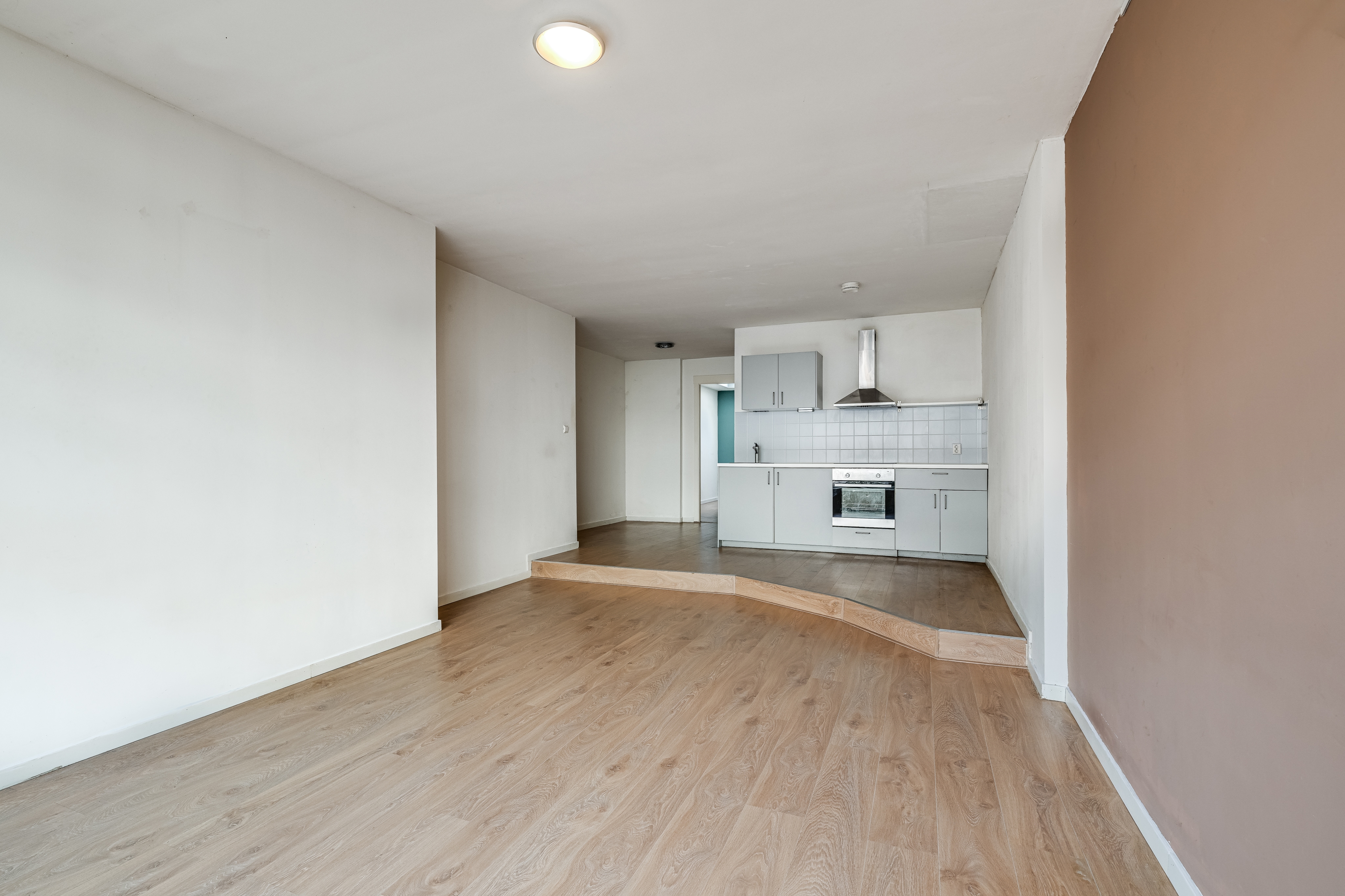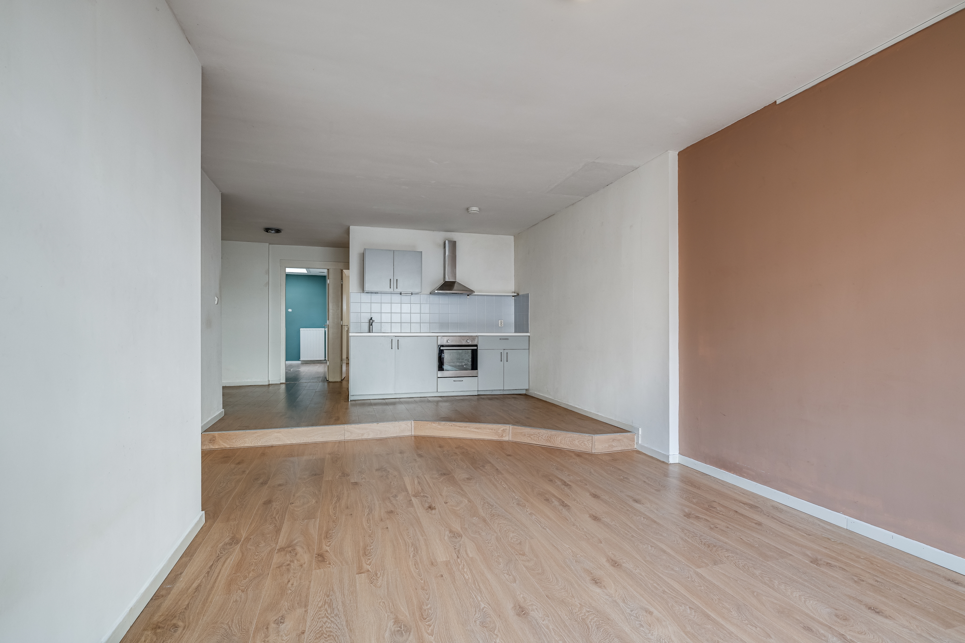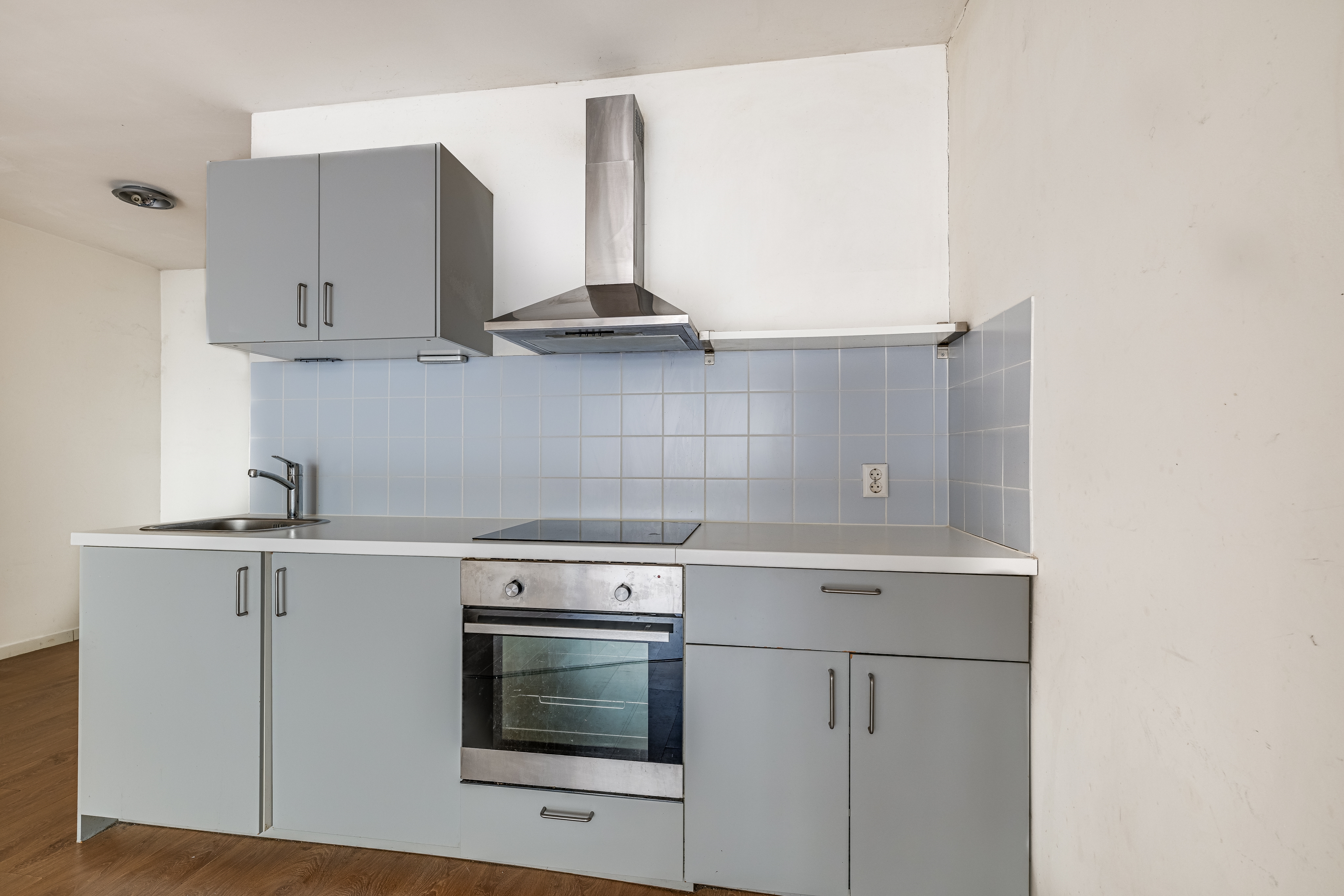 De open keuken wat aan de achterzijde van de woonkamer zit sluit goed aan en is voorzien van diverse inbouwapparatuur, waaronder een oven, inductiekookplaat, afzuigkap en spoelbak.