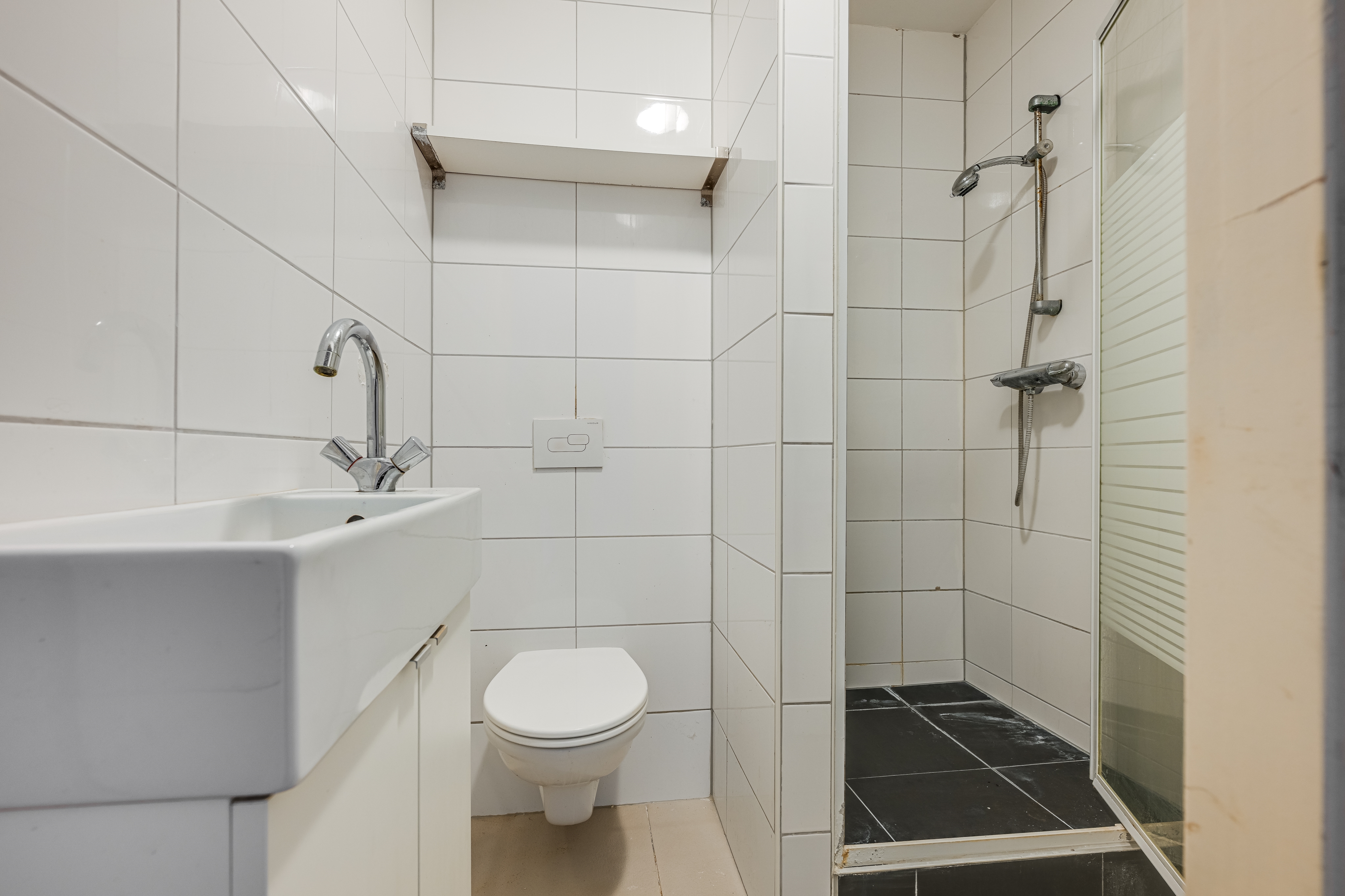 Centraal in de woning bevindt zich de badkamer, uitgerust met een douche, toilet en wastafel. Tevens bevinden zich hier de aansluitingen voor de wasmachine en droger, praktisch geïntegreerd in de ruimte.