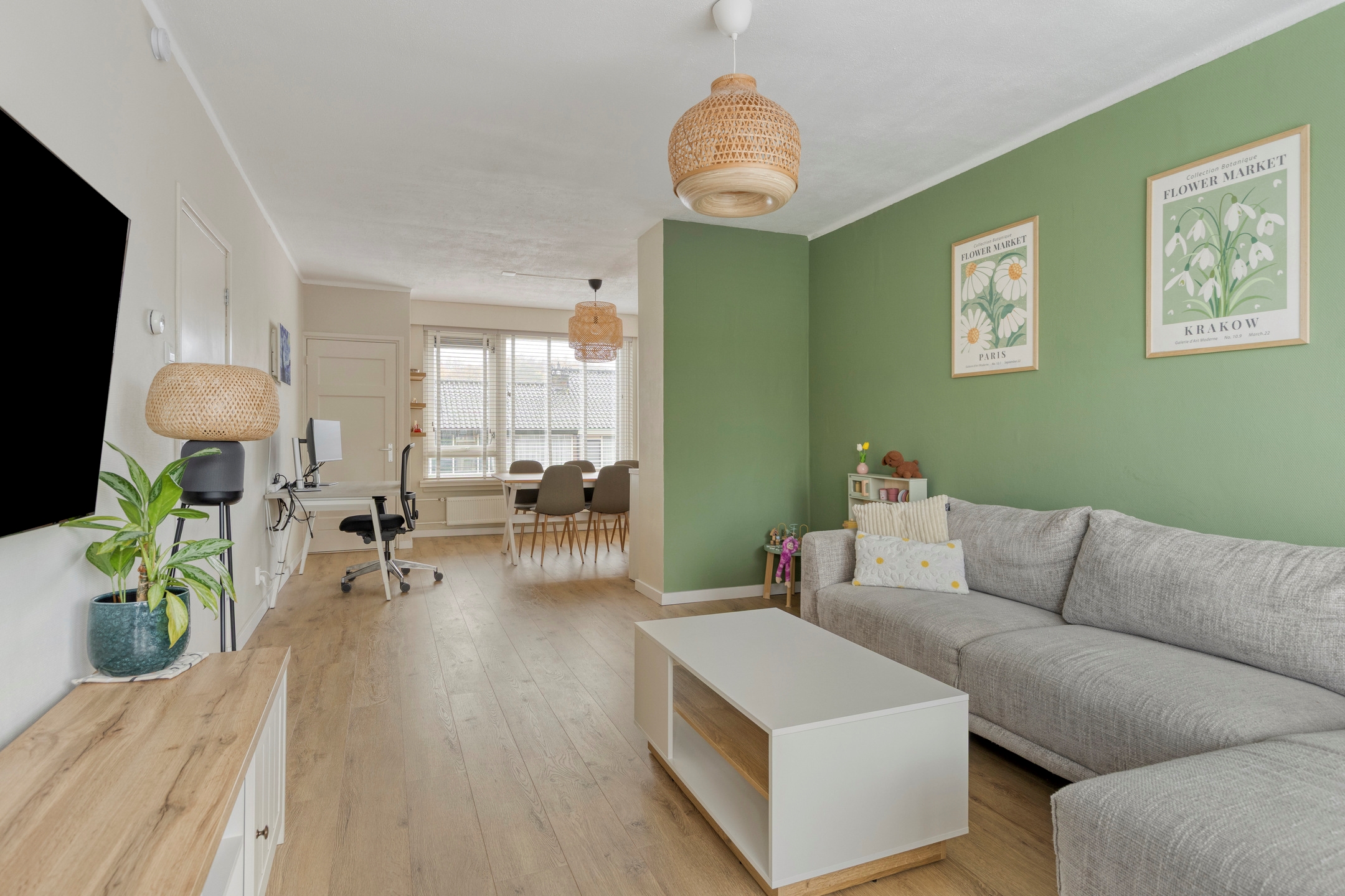 De doorzonwoonkamer is ruim en licht doordat de voormalige derde slaapkamer hierbij is betrokken. Via deze ruimte heb je toegang tot het tweede balkon. De extra kamer aan de voorzijde kan naar wens worden gebruikt als eetkamer of werkruimte.