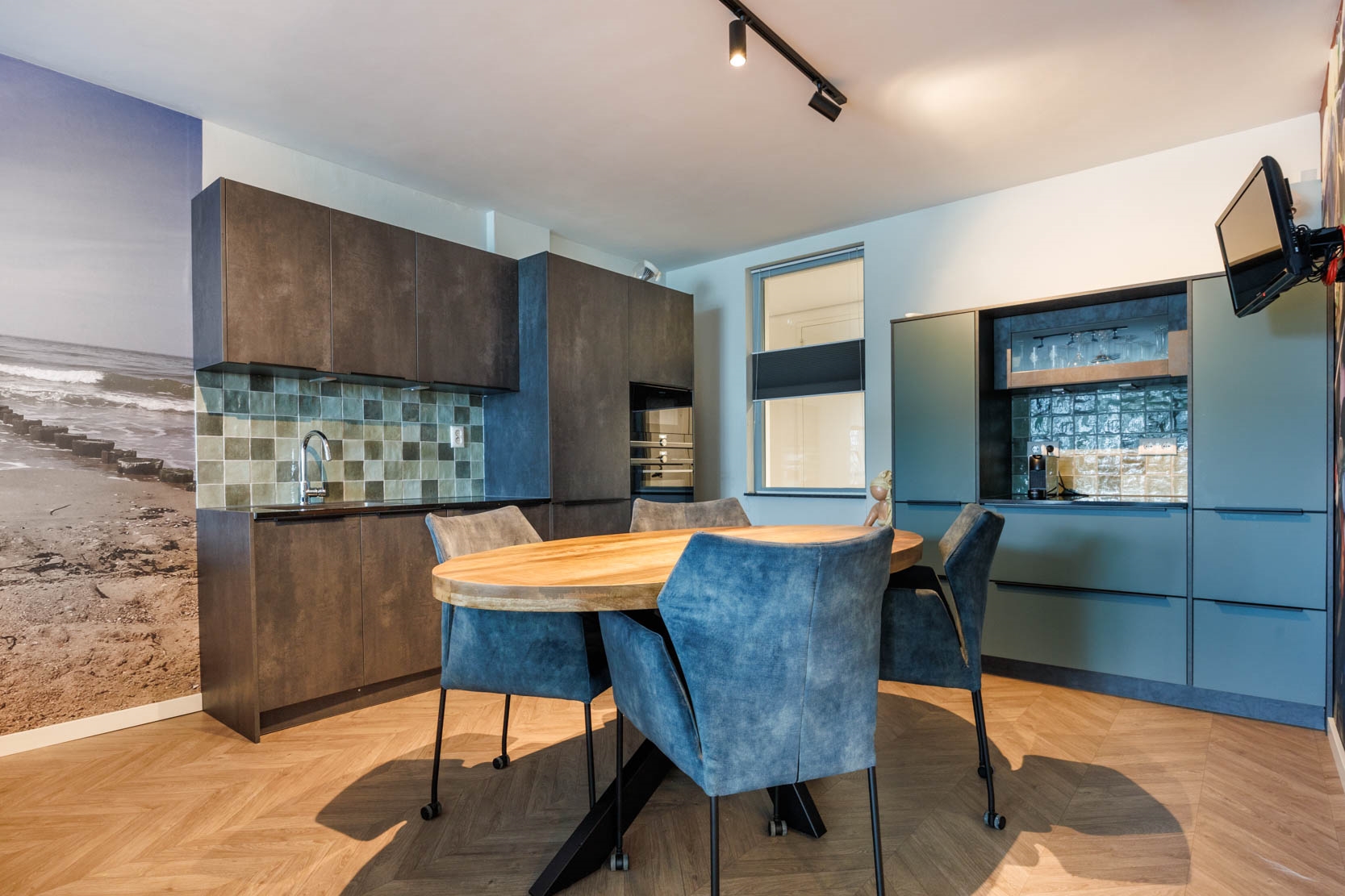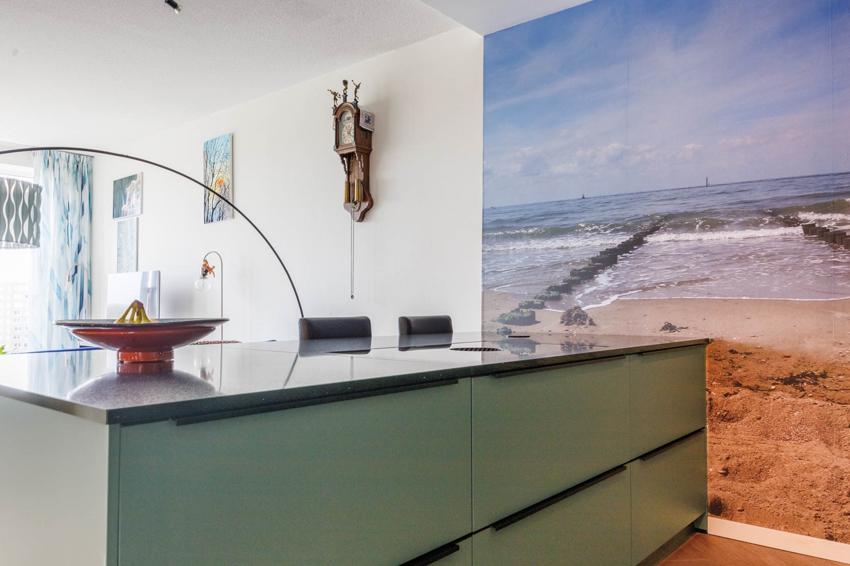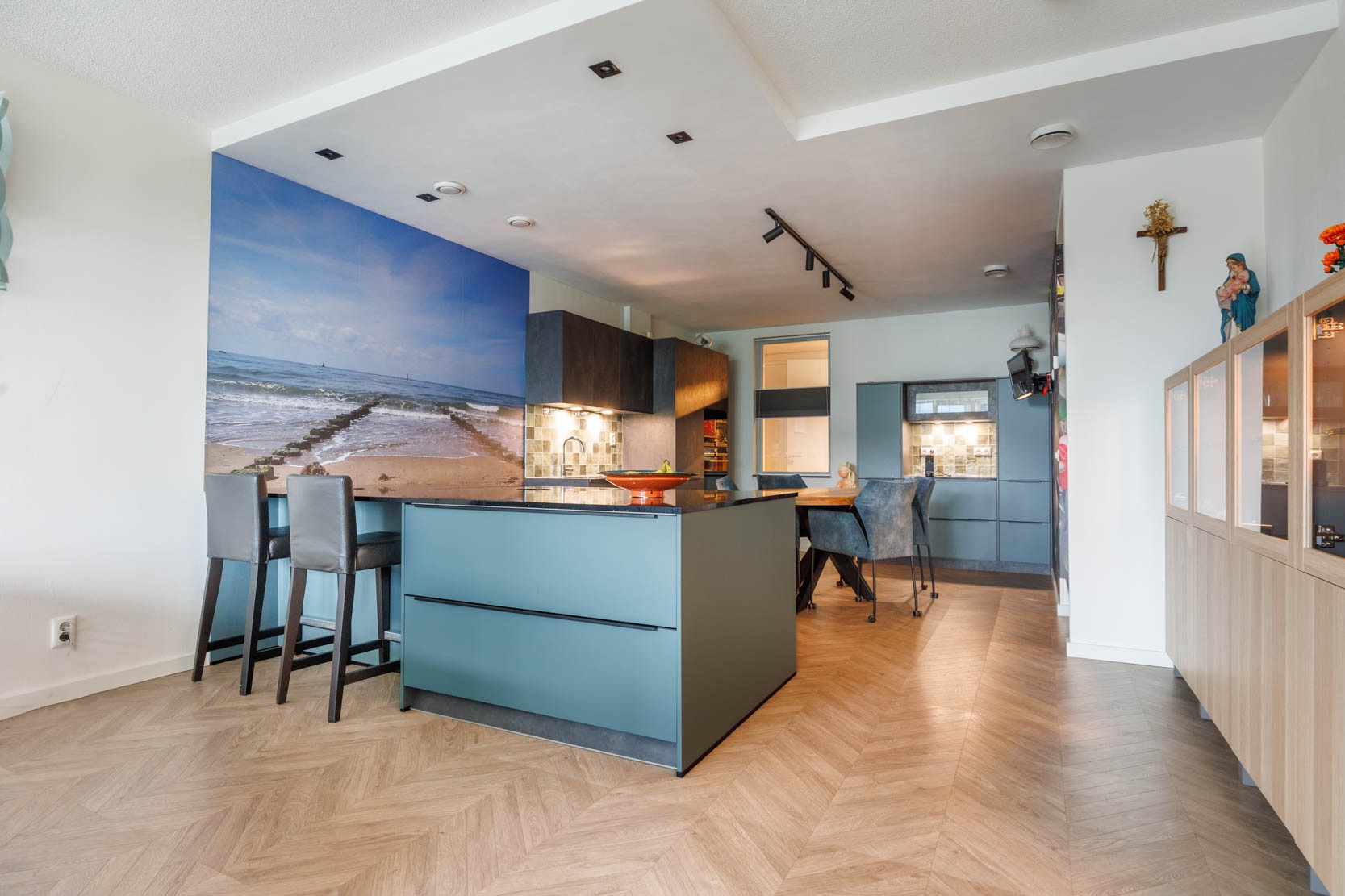 Spacious hallway with a cosy sitting nook and access to all rooms. The bright living room features an open, large luxury kitchen with a (peninsula) cooking island and seating area, fitted with various built-in appliances including an induction hob with integrated extractor, oven, microwave, dishwasher, and large refrigerator. The attractive kitchen consists of three sections: a cooking island, a sink area, and a cosy coffee corner — offering more than enough workspace and storage.