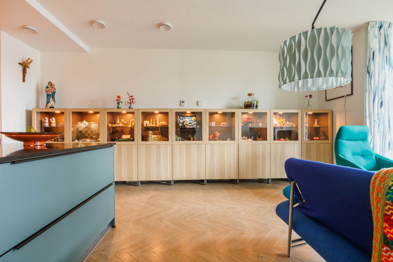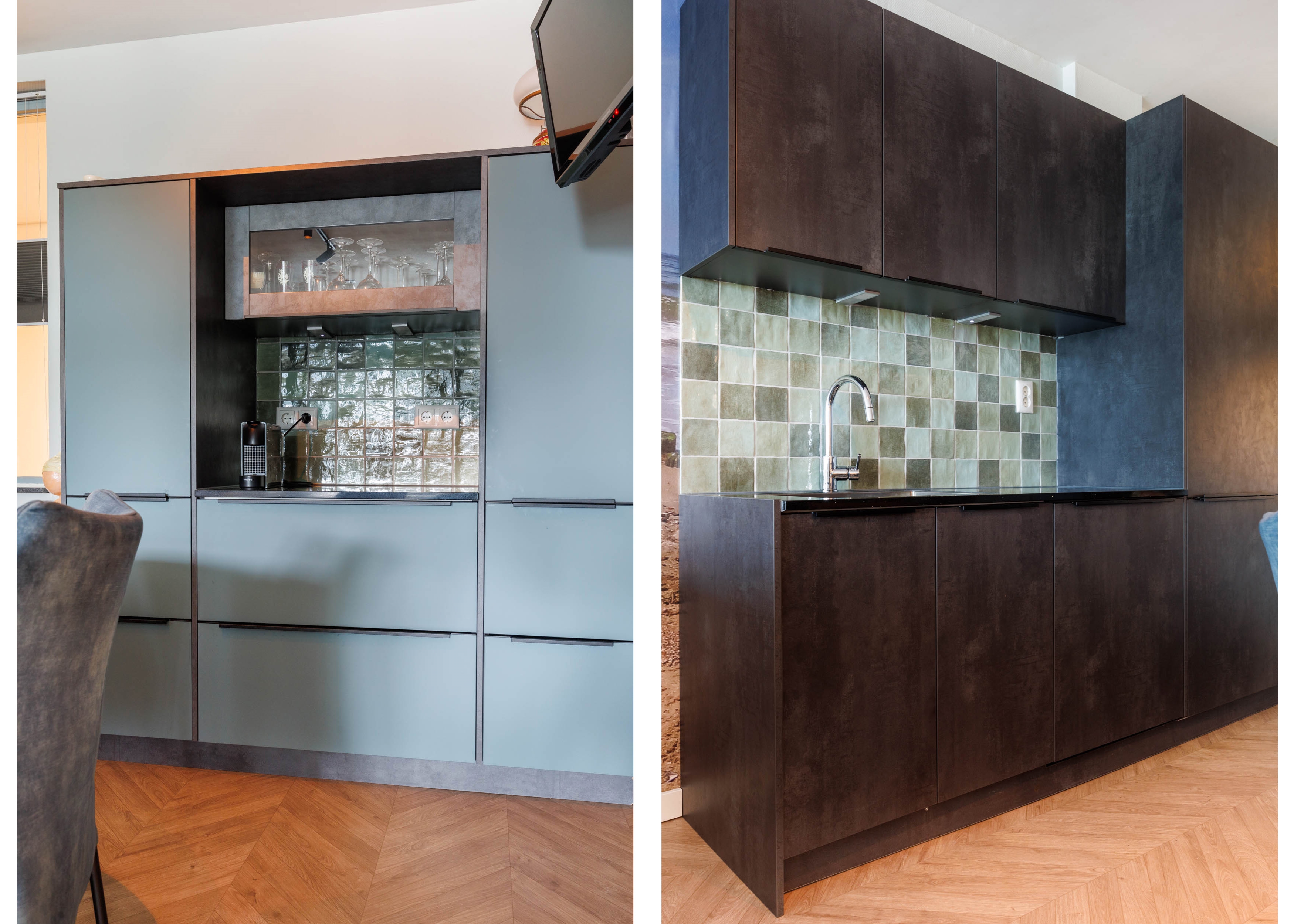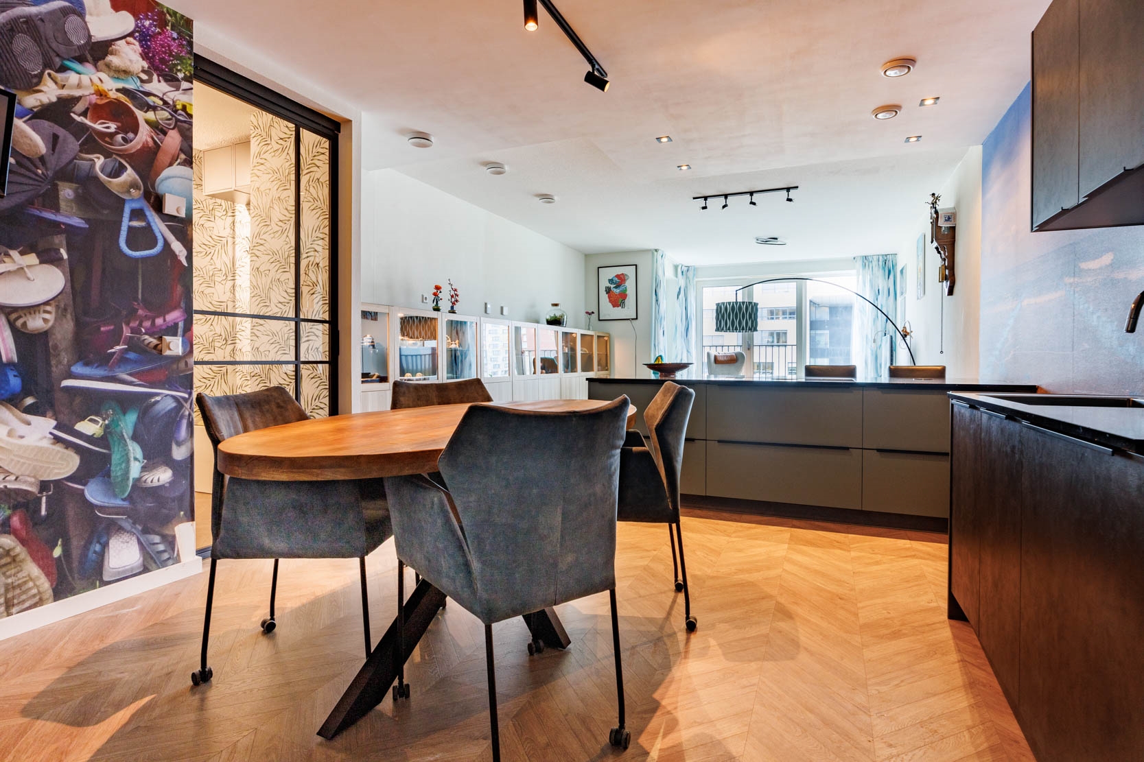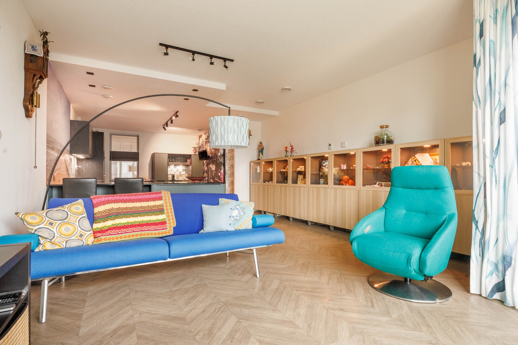 Spacious hallway with a cosy sitting nook and access to all rooms. The bright living room features an open, large luxury kitchen with a (peninsula) cooking island and seating area, fitted with various built-in appliances including an induction hob with integrated extractor, oven, microwave, dishwasher, and large refrigerator. The attractive kitchen consists of three sections: a cooking island, a sink area, and a cosy coffee corner — offering more than enough workspace and storage.