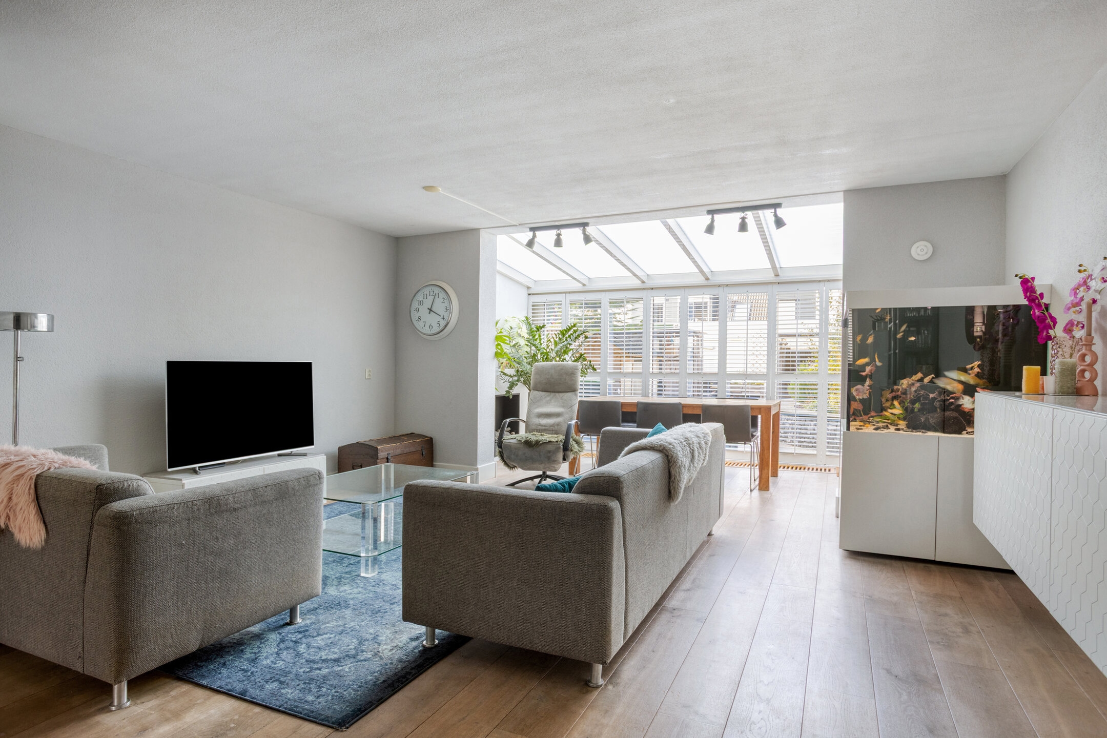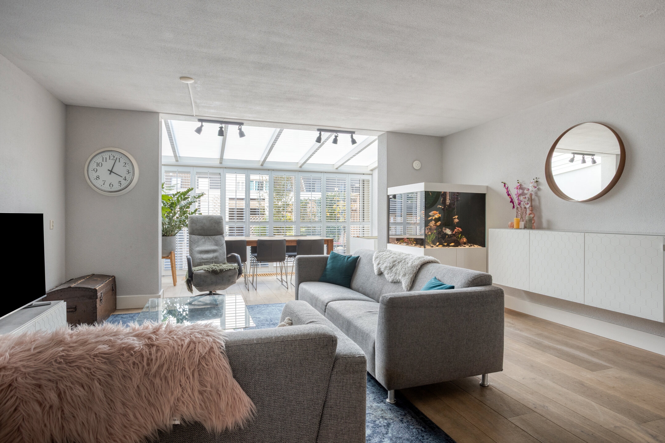 De woonkamer is opvallend ruim en heerlijk licht dankzij de doorzonindeling en de grote raampartijen aan zowel de voor- als achterzijde. Er is volop plek voor een comfortabele zithoek én een royale eettafel. Onder de trap bevindt zich een praktische bergkast voor extra opslag.